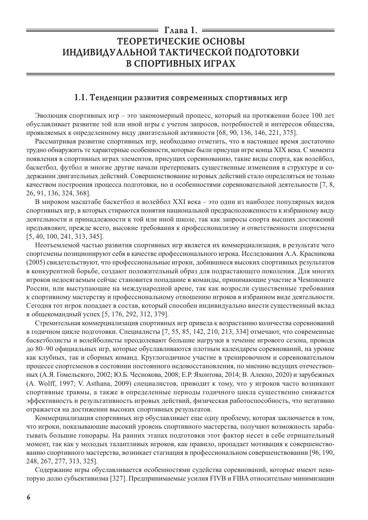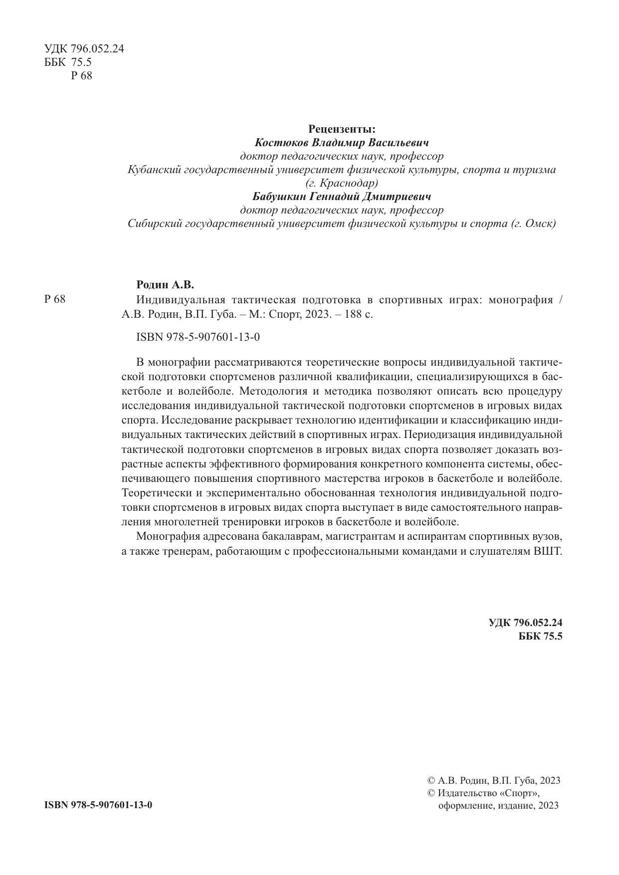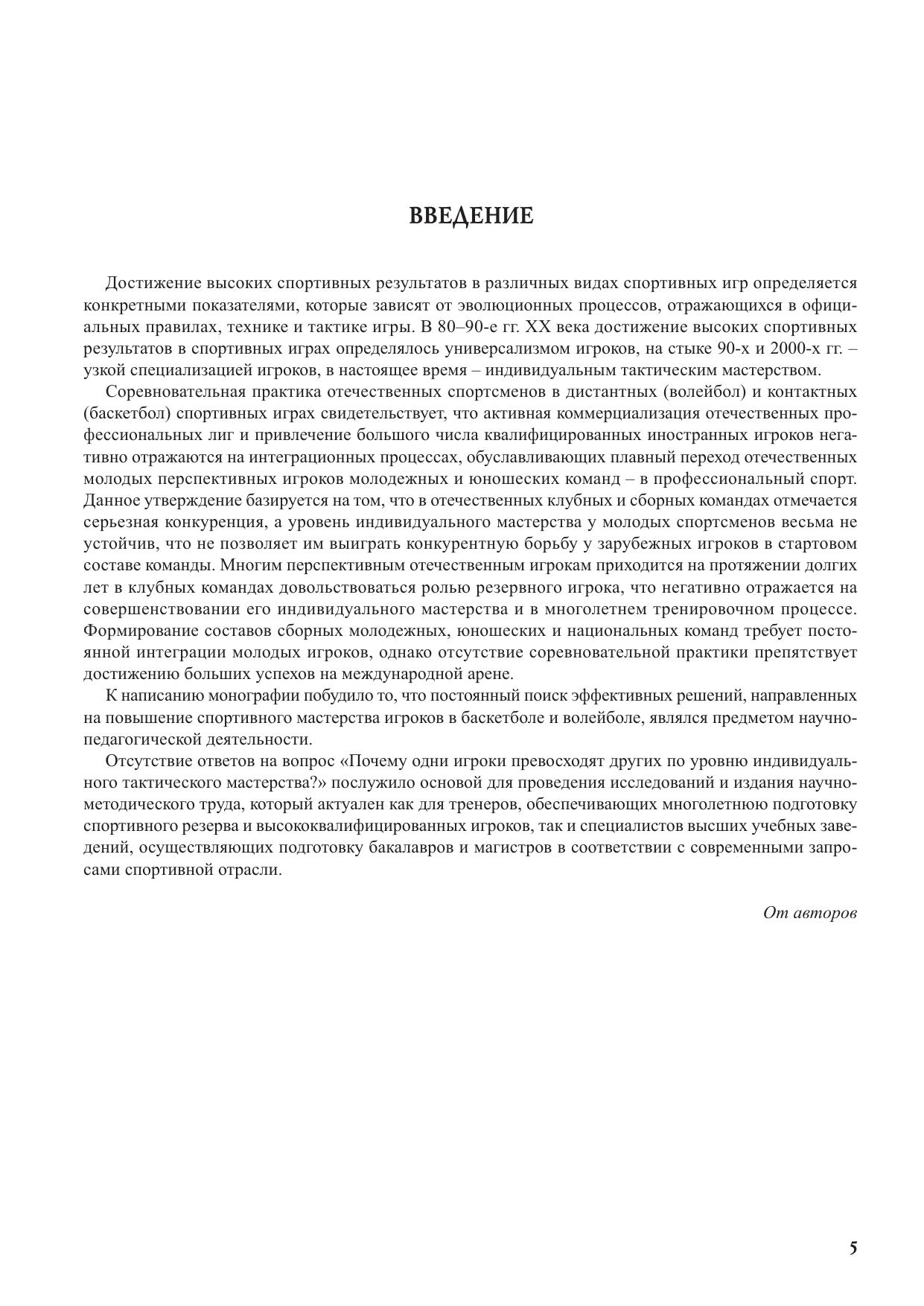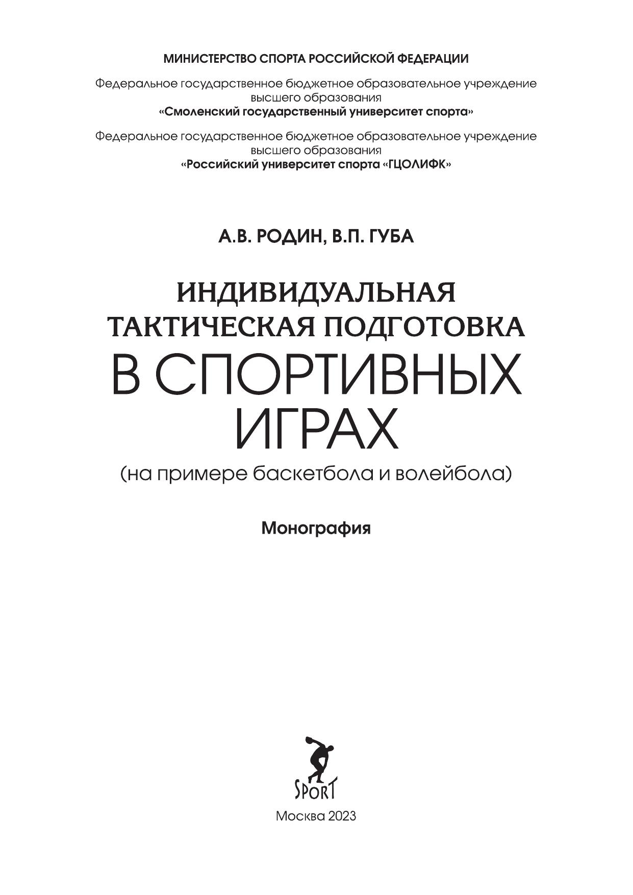 В монографии рассматриваются теоретические вопросы индивидуальной тактической подготовки спортсменов различной квалификации, специализирующихся в баскетболе и волейболе. Методология и методика позволяют описать всю процедуру исследования индивидуальной тактической подготовки спортсменов в игровых видах спорта. Исследование раскрывает технологию идентификации и классификацию индивидуальных тактических действий в спортивных играх. Периодизация индивидуальной тактической подготовки спортсменов в игровых видах спорта позволяет доказать возрастные аспекты эффективного формирования конкретного компонента системы, обеспечивающего повышения спортивного мастерства игроков в баскетболе и волейболе. Теоретически и экспериментально обоснованная технология индивидуальной подготовки спортсменов в игровых видах спорта выступает в виде самостоятельного направления многолетней тренировки игроков в баскетболе и волейболе.