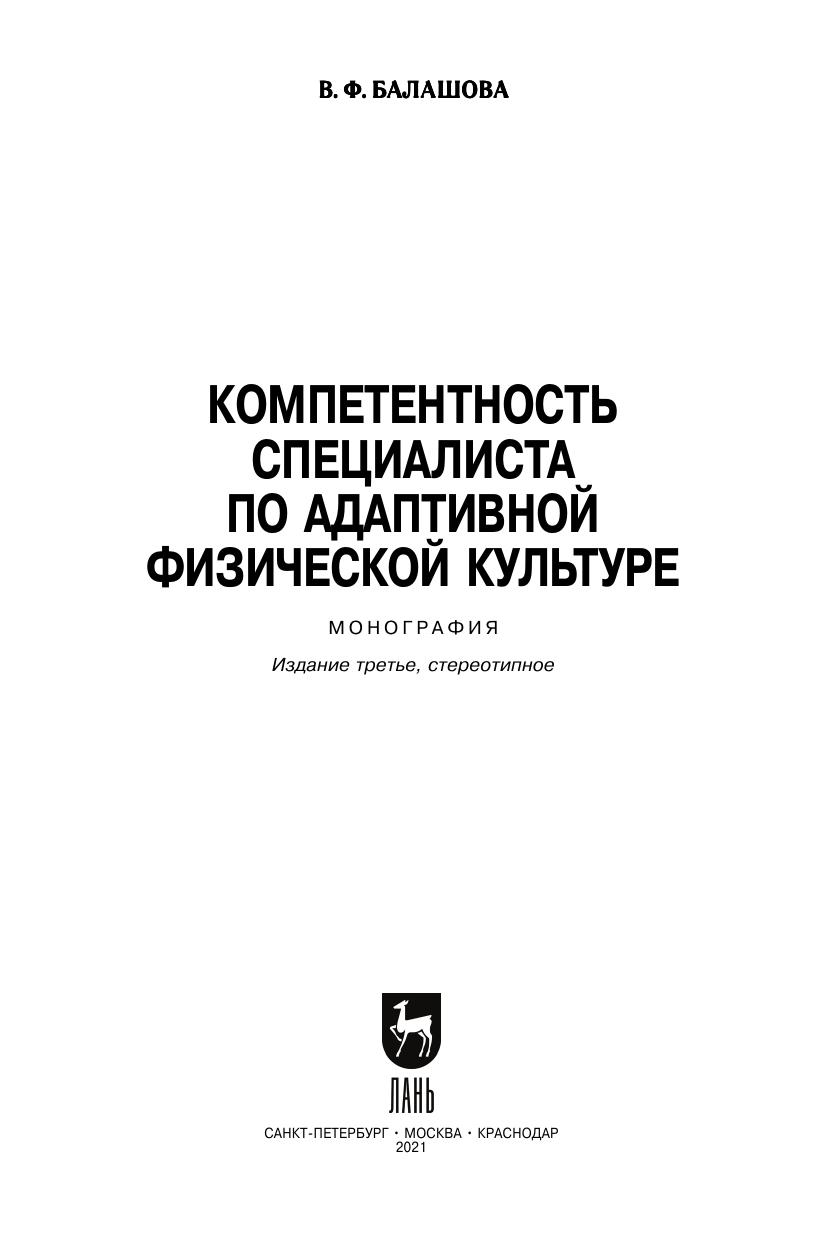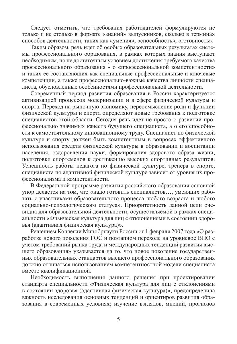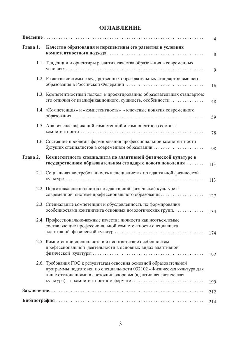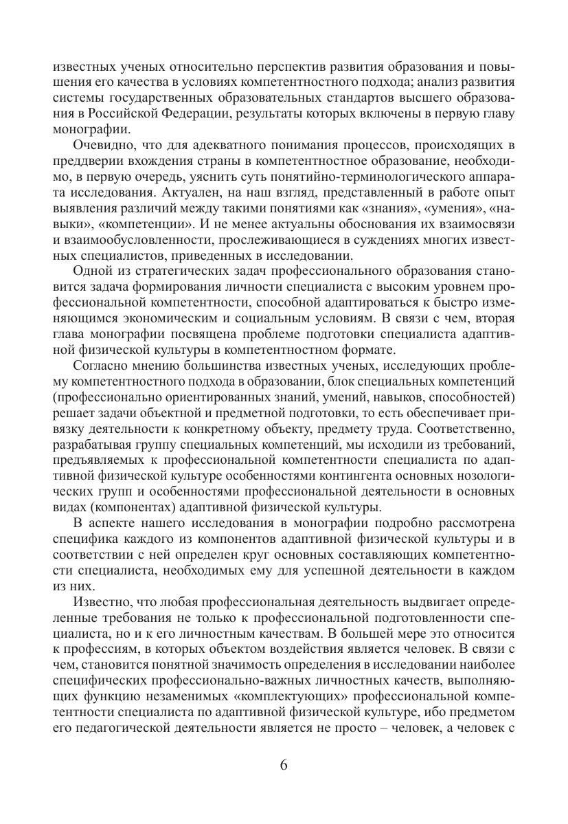 В монографии рассмотрены основные тенденции и ориентиры развития образования в современных условиях. Изучены взгляды, мнения и прогнозы известных ученых относительно перспектив развития образования и повышения его качества в условиях компетентностного подхода. Исследованы сущность и особенности компетентностного подхода к проектированию государственных образовательных стандартов, его отличия от квалификационной модели. Освещена проблема профессиональной подготовки специалиста адаптивной физической культуры в компетентностном формате. В работе подробно рассмотрены требования, предъявляемые к профессиональной компетентности специалиста по адаптивной физической культуре особенностями контингента основных нозологических групп. Особое внимание в исследовании отведено выявлению наиболее специфических профессионально-важных личностных качеств специалиста адаптивной физической культуры, оказывающих существенное влияние на повышение эффективности его профессиональной деятельности. Рассмотрена специфика каждого из компонентов адаптивной физической культуры и, в соответствии с ней, определен круг специальных компетенций, формирующих профессиональное «лицо» специалиста адаптивной физической культуры.