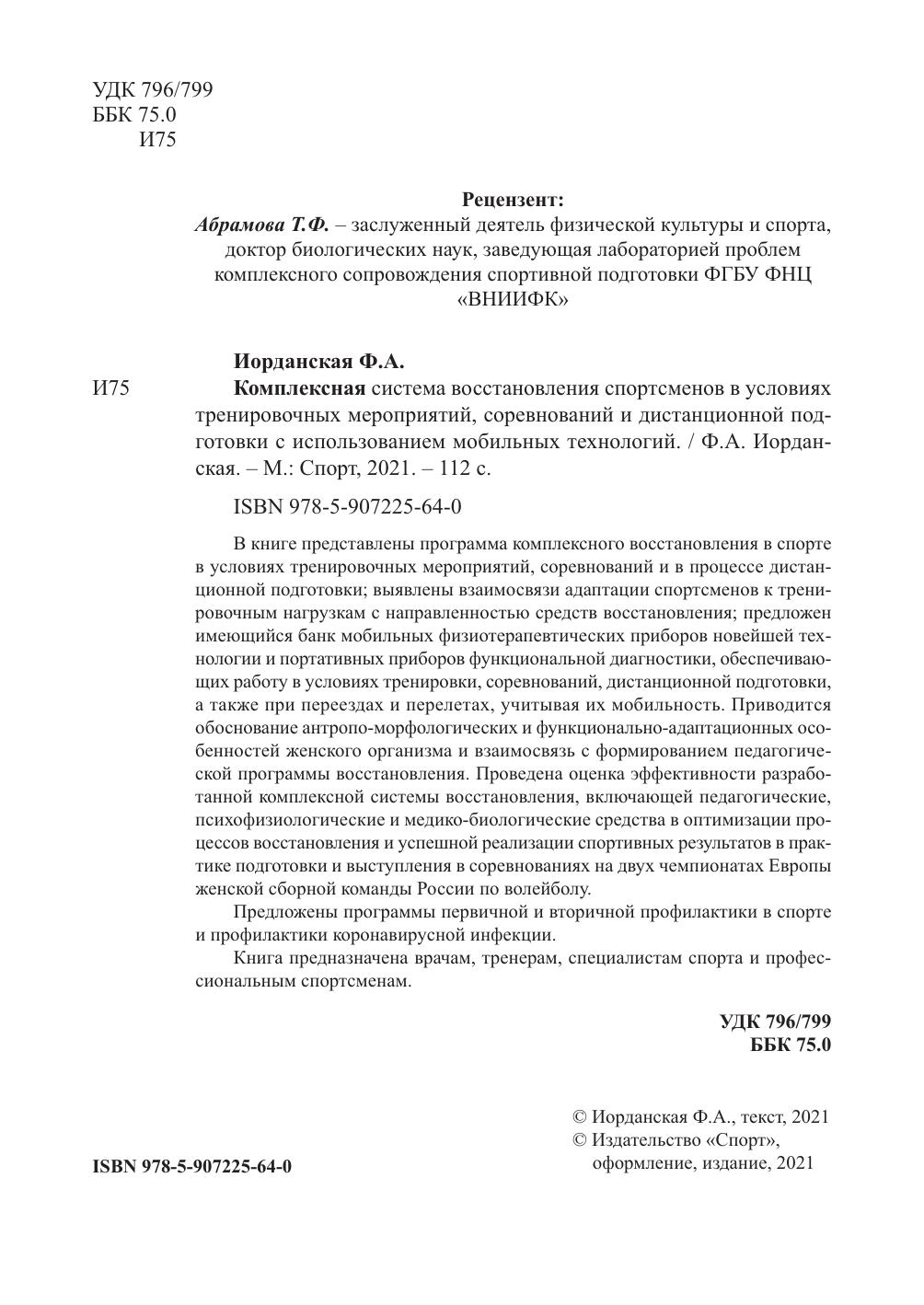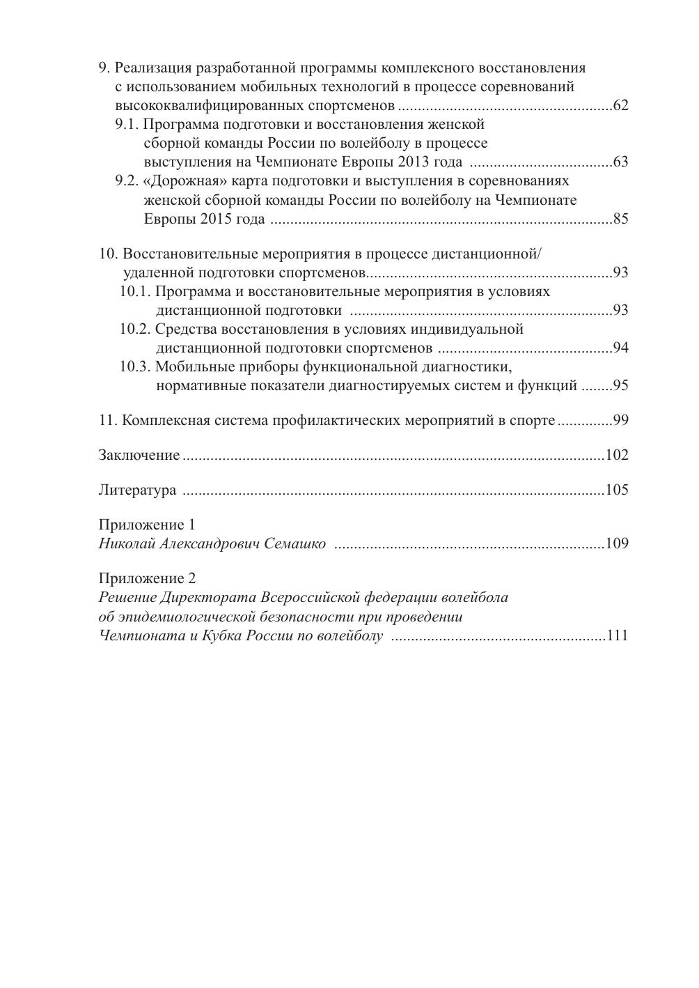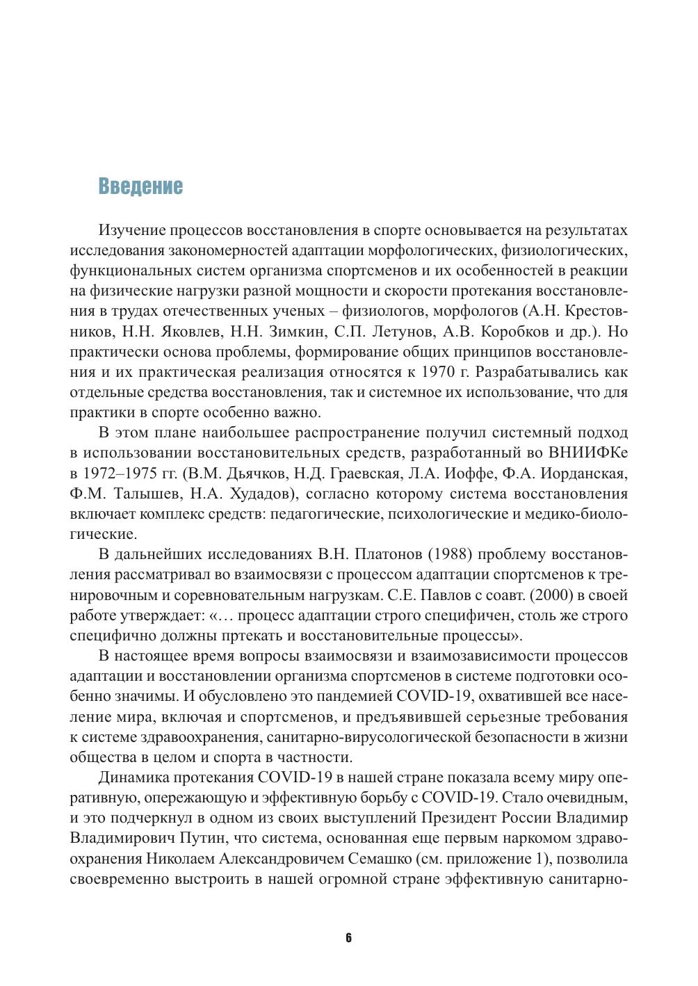 В книге представлены программа комплексного восстановления в спорте в условиях тренировочных мероприятий, соревнований и в процессе дистанционной подготовки; выявлены взаимосвязи адаптации спортсменов к тренировочным нагрузкам с направленностью средств восстановления; предложен имеющийся банк мобильных физиотерапевтических приборов новейшей технологии и портативных приборов функциональной диагностики, обеспечивающих работу в условиях тренировки, соревнований, дистанционной подготовки, а также при переездах и перелетах, учитывая их мобильность. Приводится обоснование антропо-морфологических и функционально-адаптационных особенностей женского организма и взаимосвязь с формированием педагогической программы восстановления. Проведена оценка эффективности разработанной комплексной системы восстановления, включающей педагогические, психофизиологические и медико-биологические средства в оптимизации процессов восстановления и успешной реализации спортивных результатов в практике подготовки и выступления в соревнованиях на двух чемпионатах Европы женской сборной команды России по волейболу. Предложены программы первичной и вторичной профилактики в спорте и профилактики коронавирусной инфекции. Книга предназначена врачам, тренерам, специалистам спорта и профессиональным спортсменам.