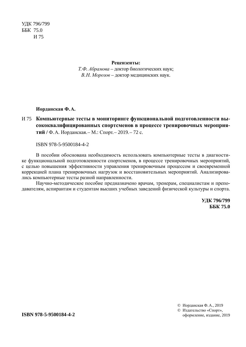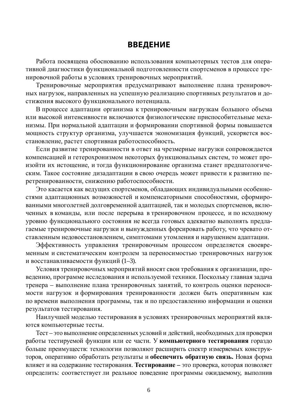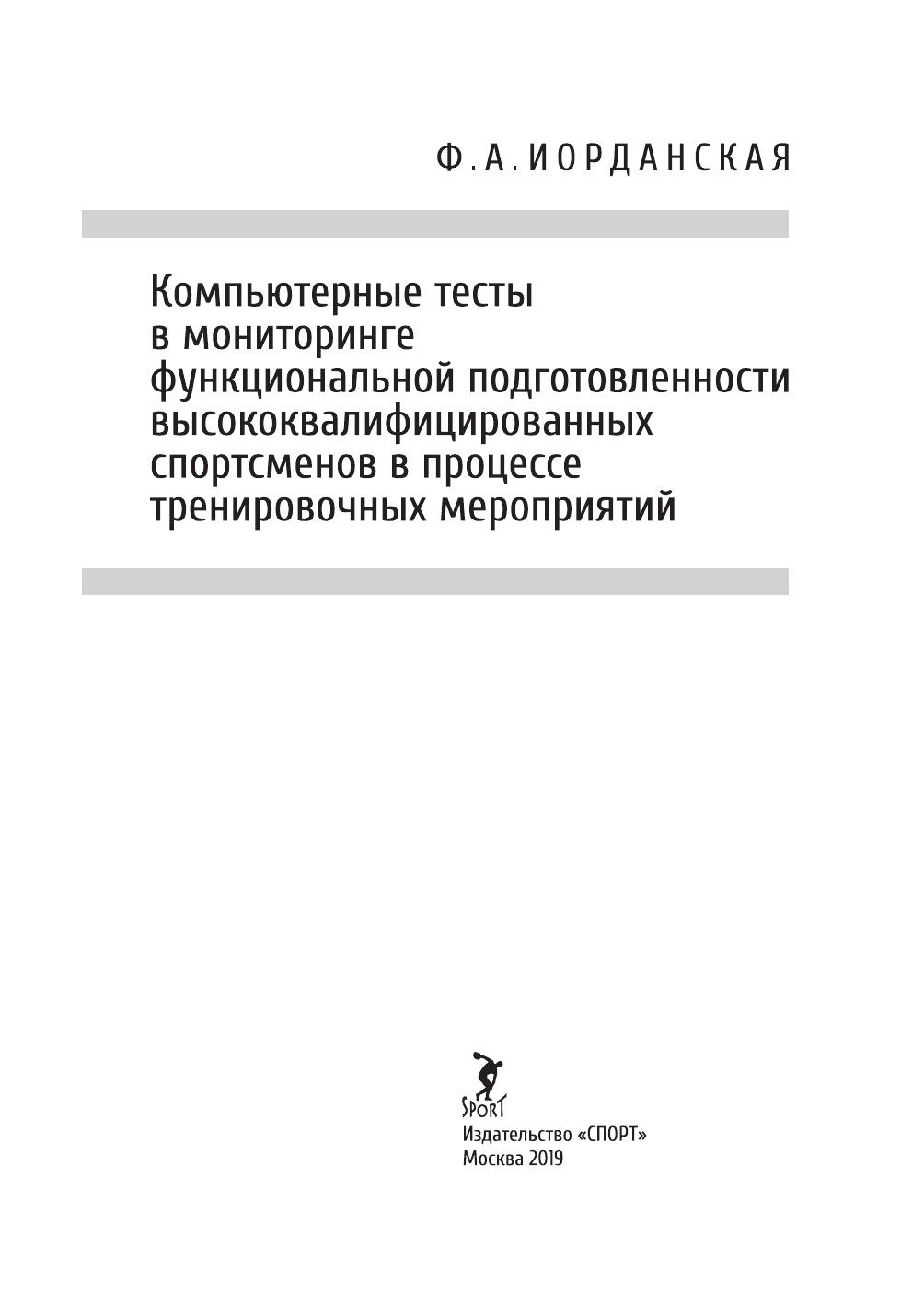 В пособии обоснована необходимость использовать компьютерные тесты в диагностике функциональной подготовленности спортсменов, в процессе тренировочных мероприятий, с целью повышения эффективности управления тренировочным процессом и своевременной коррекцией плана тренировочных нагрузок и восстановительных мероприятий. Анализировались компьютерные тесты разной направленности. Научно-методическое пособие предназначено врачам, тренерам, специалистам и преподавателям, аспирантам и студентам высших учебных заведений физической культуры и спорта.
