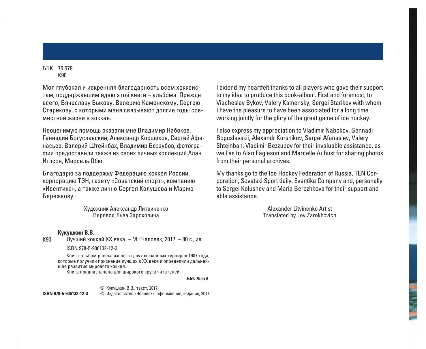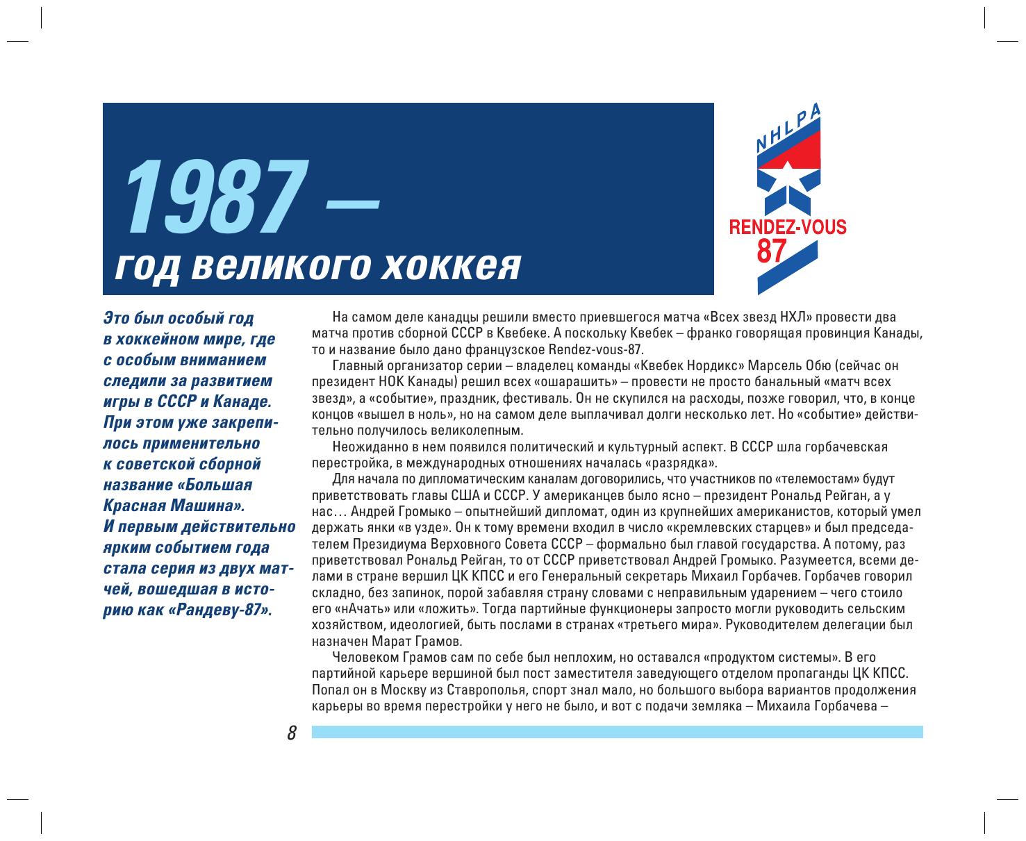Книга-альбом рассказывает о двух хоккейных турнирах 1987 года, которые получили признание лучших в ХХ веке и определили дальнейшее развитие мирового хоккея.