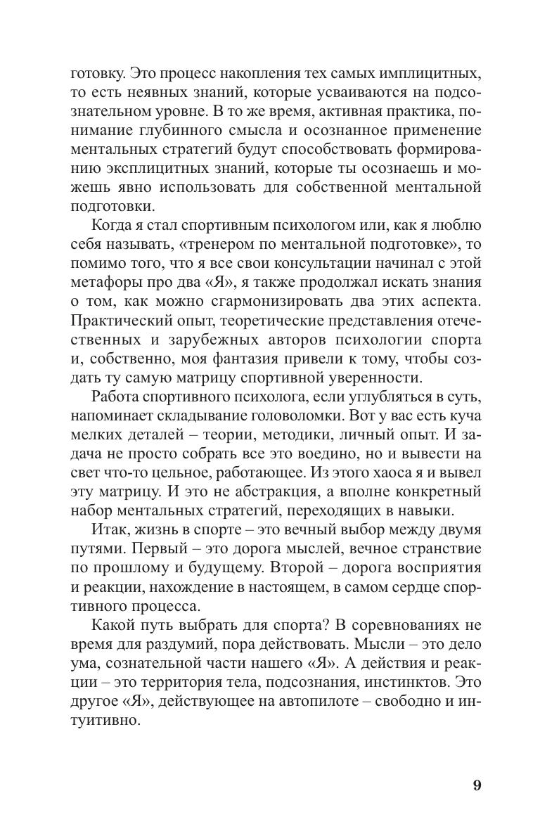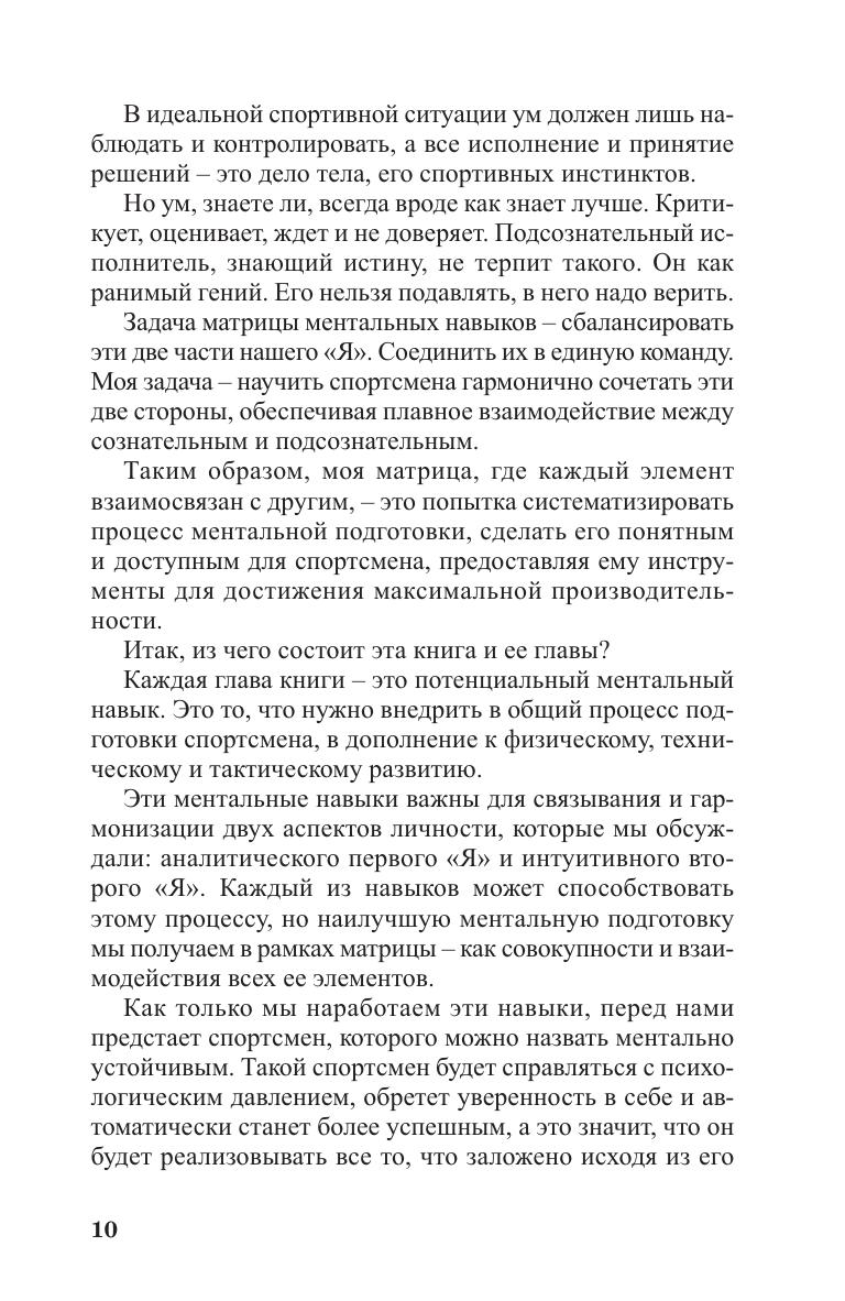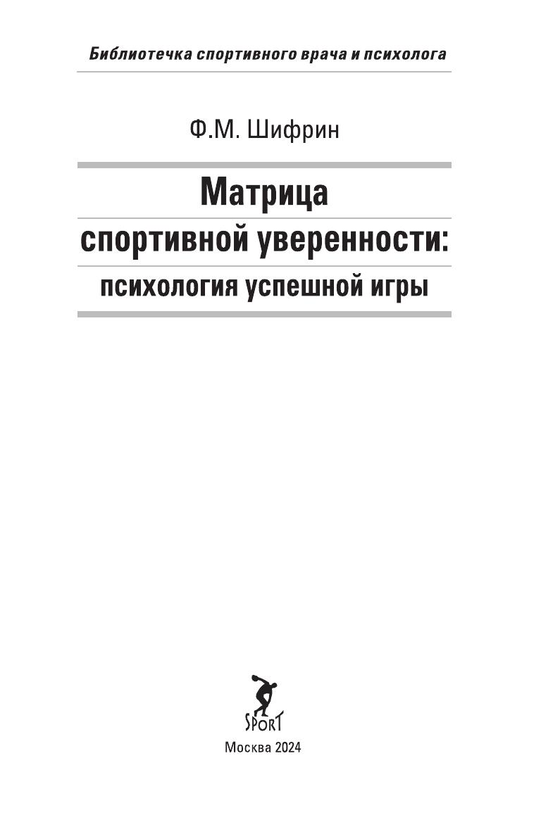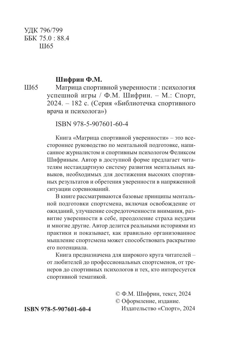 Книга «Матрица спортивной уверенности» – это всестороннее руководство по ментальной подготовке, написанное журналистом и спортивным психологом Феликсом Шифриным. Автор в доступной форме предлагает читателям нестандартную систему развития ментальных навыков, необходимых для достижения высоких спортивных результатов и обретения уверенности в напряженной ситуации соревнований. В книге рассматриваются базовые принципы ментальной подготовки спортсмена, включая освобождение от ожиданий, улучшение сосредоточенности внимания, развитие уверенности в себе, преодоление страха неудачи и многие другие. Автор делится реальными историями из практики и показывает, как правильно организованное
