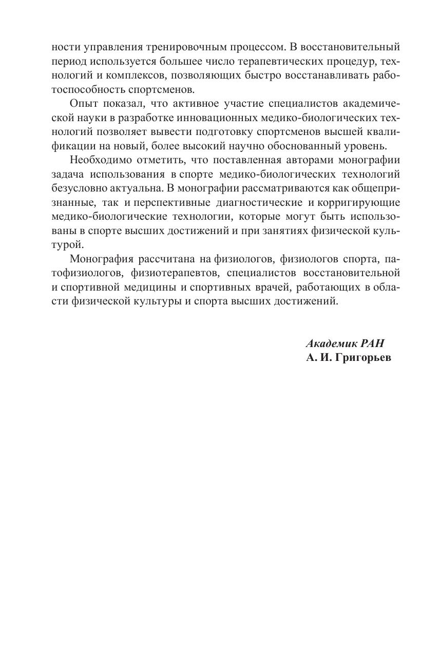 Материалы, изложенные в монографии, расширяют представления о возможности более широкого использования медико-биологических технологий в управлении тренировочным процессом на фоне всё возрастающих тренировочных и соревновательных нагрузок.