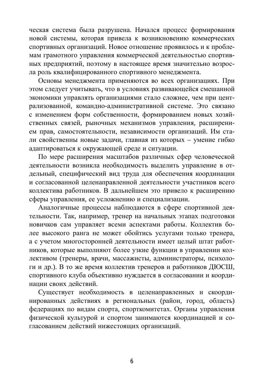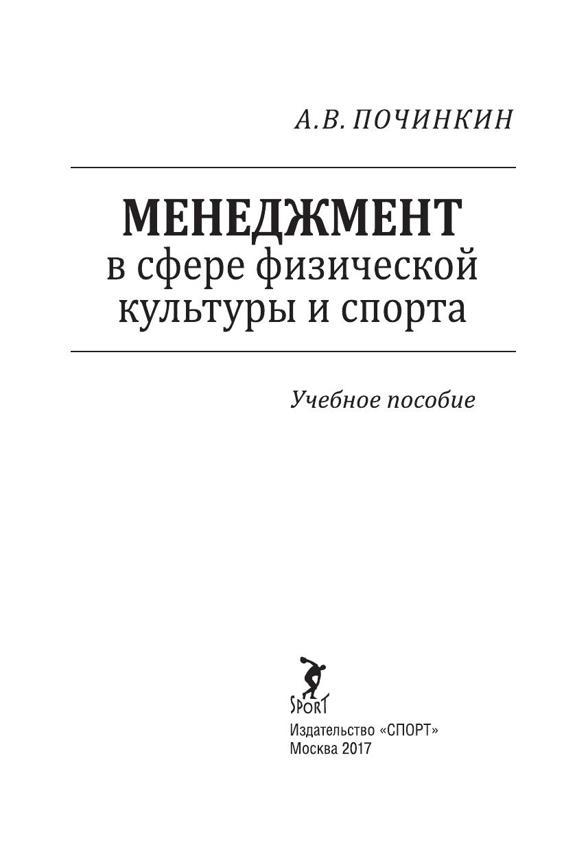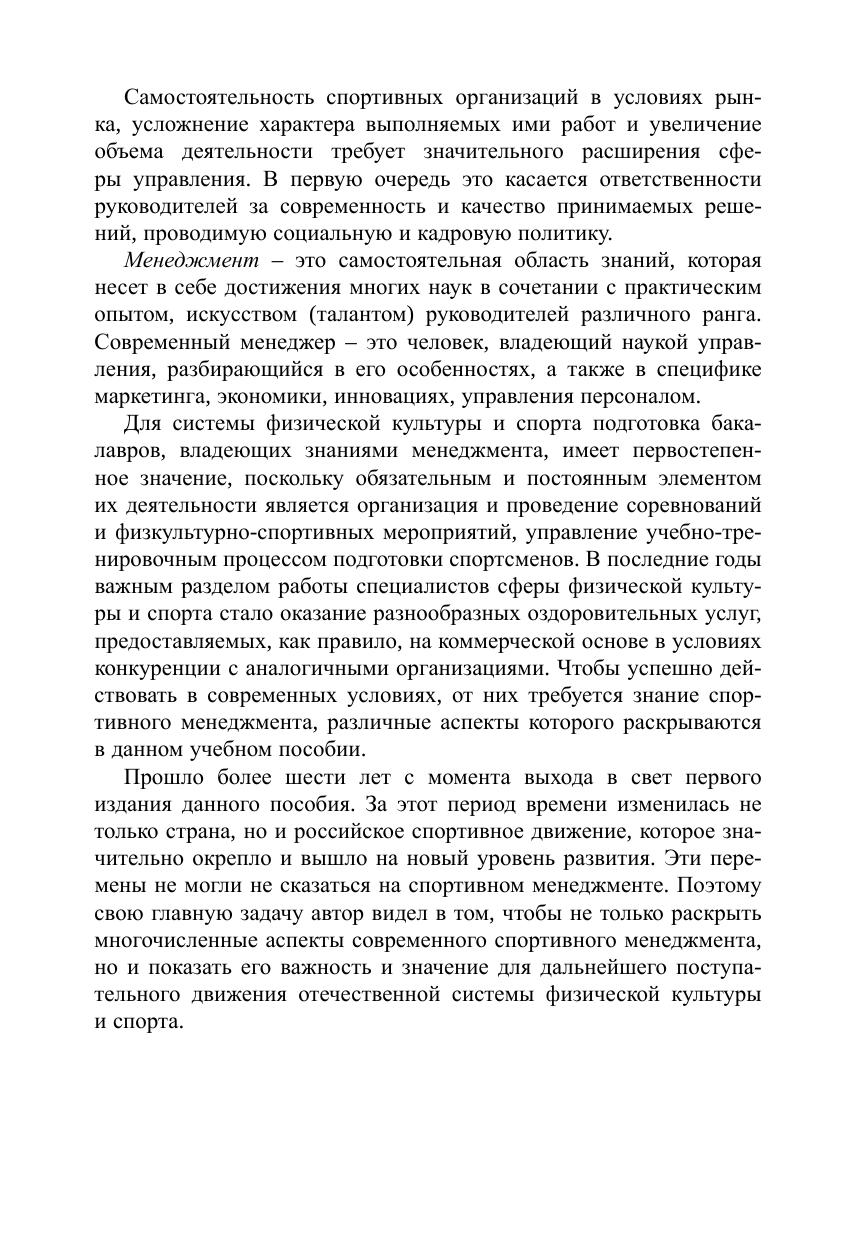 В учебном пособии рассматриваются основы построения структуры современной спортивной организации, раскрывается содержание функций менеджмента, методов управления и руководства коллективом, особенности менеджмента в отдельных звеньях спортивного движения страны, менеджмент спортивного мероприятия, управленческие аспекты международного спортивного и олимпийского движений, инновационные направления спортивного менеджмента, а также другие вопросы, связанные с особенностями успешной деятельности спортивного руководителя. Учебное пособие написано в соответствии с требованиями Госу- дарственных образовательных стандартов высшего профессионального образования по дисциплине «Менеджмент в сфере физической культуры и спорта», направления подготовки: 49.03.01 – «Физическая культура» (квалификация – бакалавр), 38.03.02 – «Менеджмент», профиль «Менеджмент организации» (квалификация – бакалавр). Предназначено студентам физкультурных вузов, аспирантам, практикам, участвующим в управлении отечественной системой физической кулmтуры и спорта.