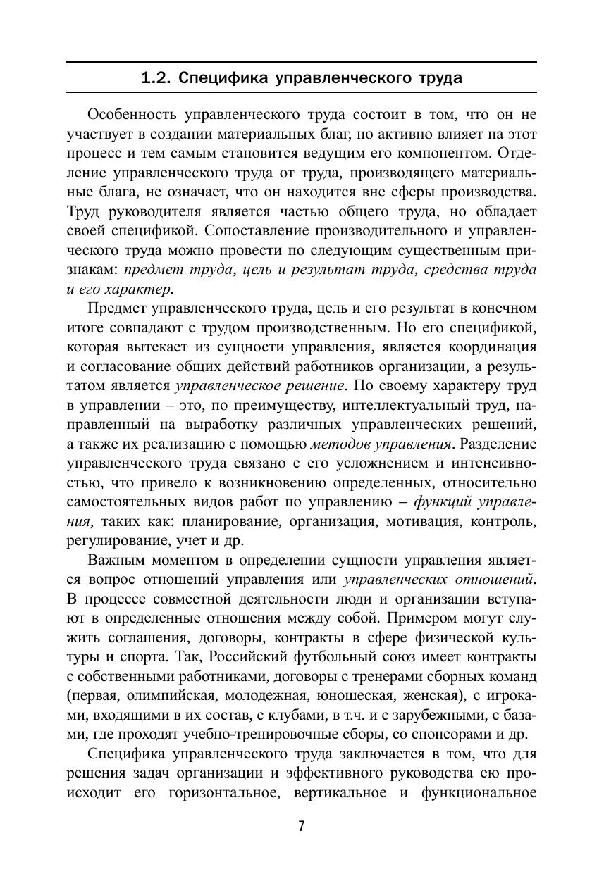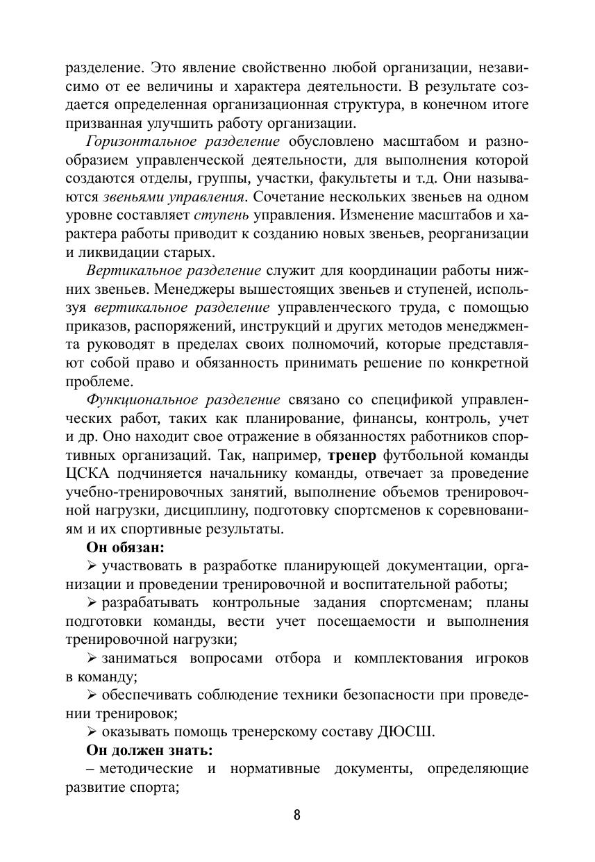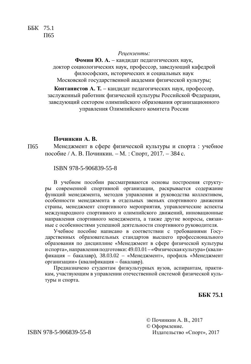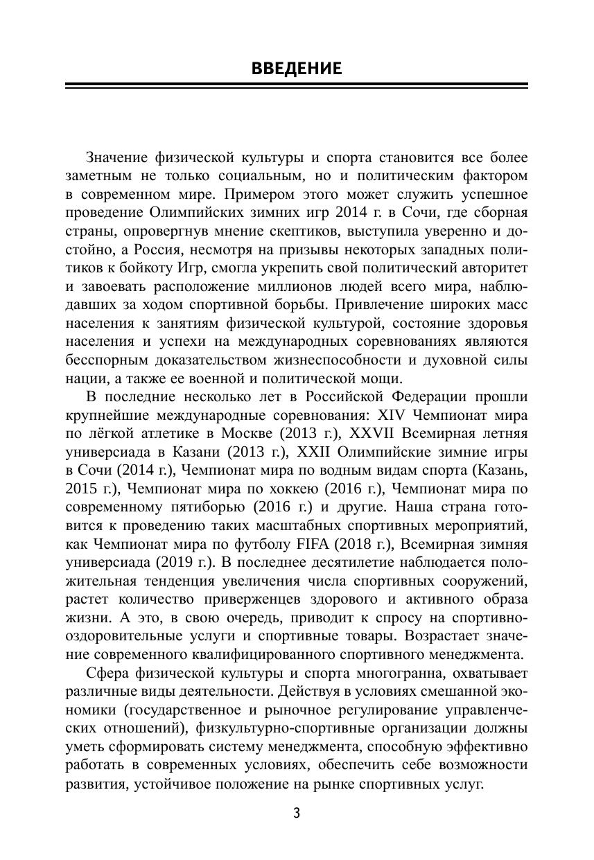 В учебном пособии рассматриваются основы построения структуры современной спортивной организации, раскрывается содержание функций менеджмента, методов управления и руководства коллективом, особенности менеджмента в отдельных звеньях спортивного движения страны, менеджмент спортивного мероприятия, управленческие аспекты международного спортивного и олимпийского движений, инновационные направления спортивного менеджмента, а также другие вопросы, связанные с особенностями успешной деятельности спортивного руководителя. Учебное пособие написано в соответствии с требованиями Госу- дарственных образовательных стандартов высшего профессионального образования по дисциплине «Менеджмент в сфере физической культуры и спорта», направления подготовки: 49.03.01 – «Физическая культура» (квалификация – бакалавр), 38.03.02 – «Менеджмент», профиль «Менеджмент организации» (квалификация – бакалавр). Предназначено студентам физкультурных вузов, аспирантам, практикам, участвующим в управлении отечественной системой физической кулmтуры и спорта.