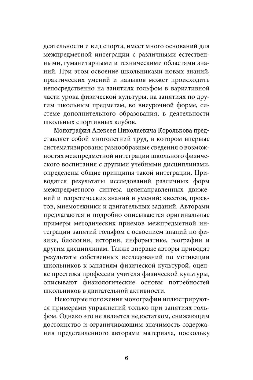 В учебном пособии рассмотрены межпредметные аспекты школьного физического воспитания, определены принципы, основные направления и виды межпредметной интеграции занятий физической культурой с другими школьными учебными предметами, описываются физиологические основы естественных двигательных потребностей, приводятся примеры межпредметных двигательных заданий, приключенческих игр и проектов. Приведены результаты исследований мотиваций школьников к занятиям физической культурой, определены оценки престижа профессии преподаватель физического воспитания. Подробно описаны методические приемы и комплексы межпредметных двигательных заданий, приключенческих игр – квестов, межпредметных проектов и мнемотехнических методик. Рассмотрены возможности межпредметной интеграции физической активности со школьными курсами физики, биологии, географии, истории, информатики и другими учебными предметами. Многие приемы межпредметной интеграции описаны на примере занятий гольфом как вариативной части школьного предмета «физическая культура». Соответствует современным требованиям Федерального государственного образовательного стандарта среднего профессионального образования и профессиональным квалификационным требованиям. Книга предназначена для студентов СПО по специальностям «Физическая культура» и «Спорт», будет полезна преподавателям физической культуры, тренерам-преподавателям и инструкторам-методистам, студентам, магистрантам и аспирантам соответствующих специальностей.