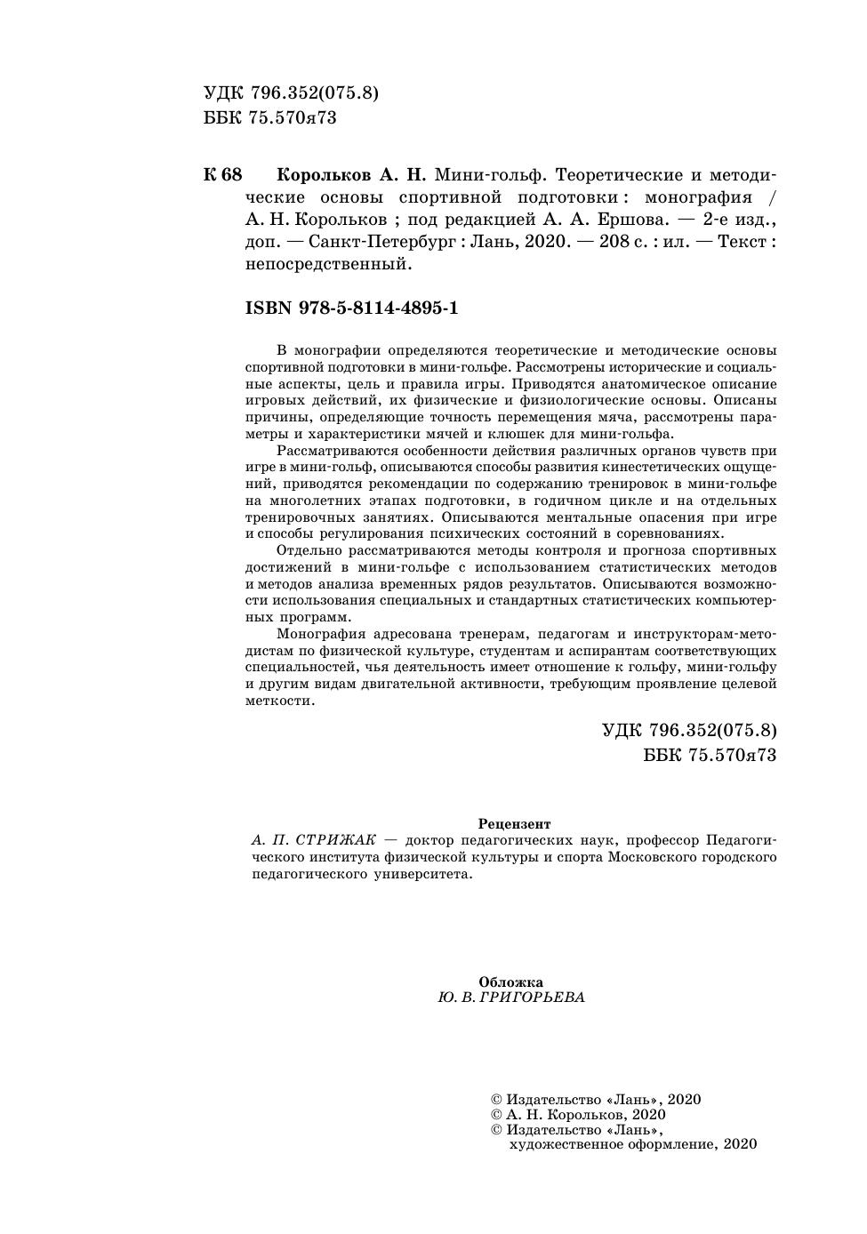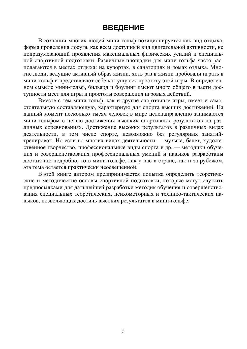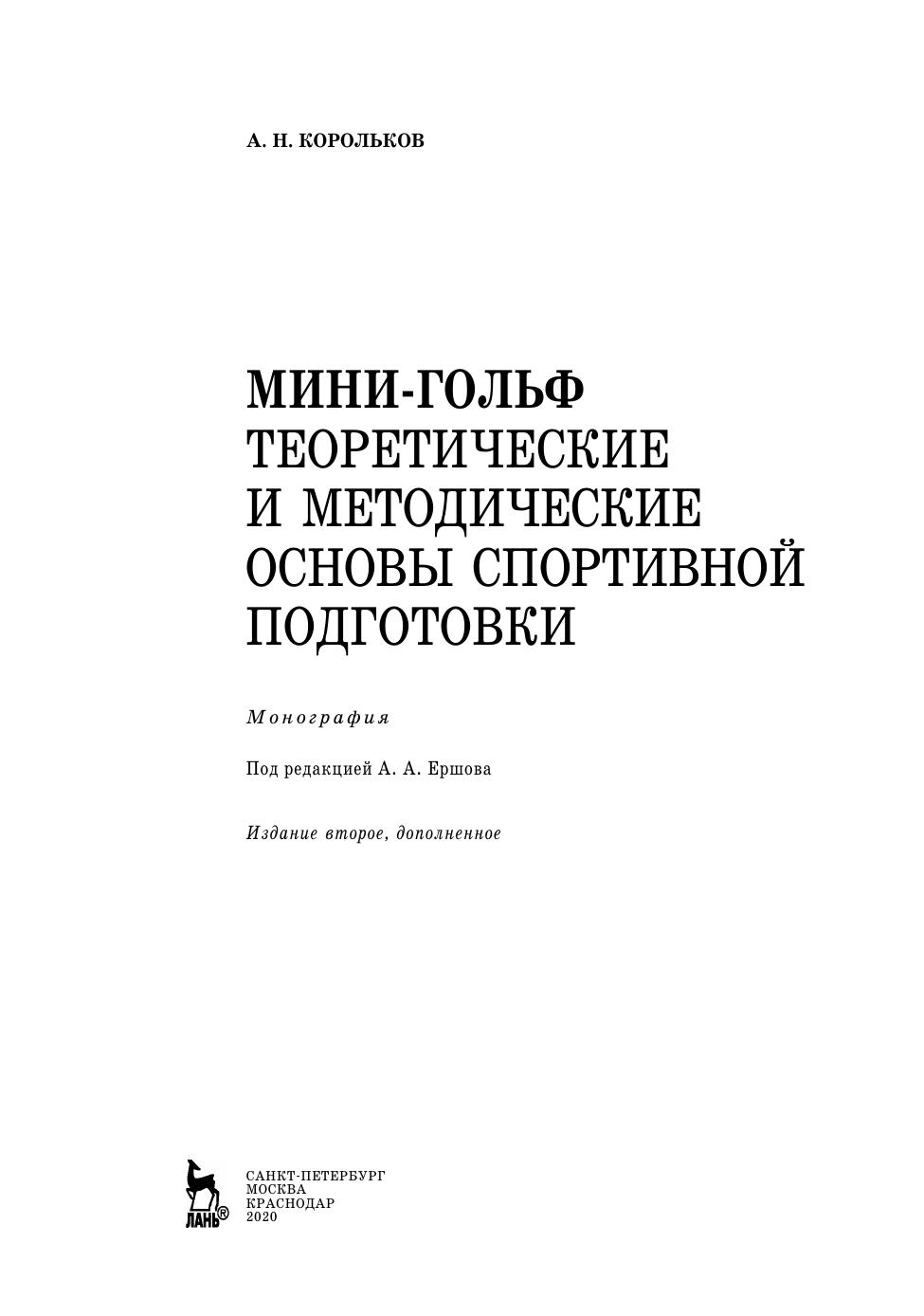 В монографии определяются теоретические и методические основы спортивной подготовки в мини-гольфе. Рассмотрены исторические и социальные аспекты, цель и правила игры. Приводится анатомическое описание игровых действий, их физические и физиологические основы. Описаны причины, определяющие точность перемещения мяча, рассмотрены параметры и характеристики мячей и клюшек для мини-гольфа.