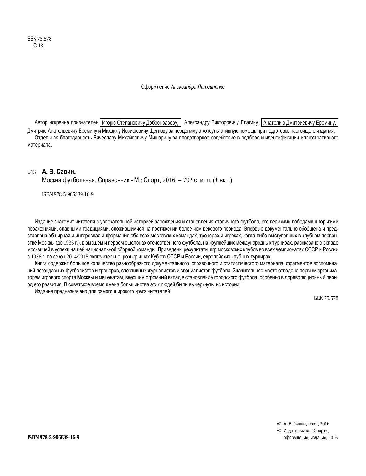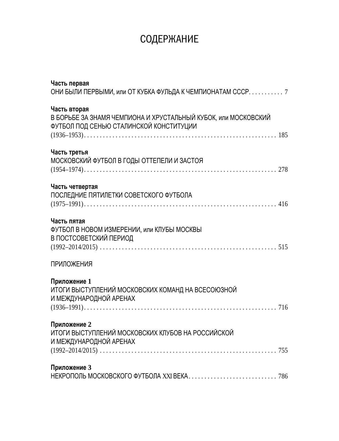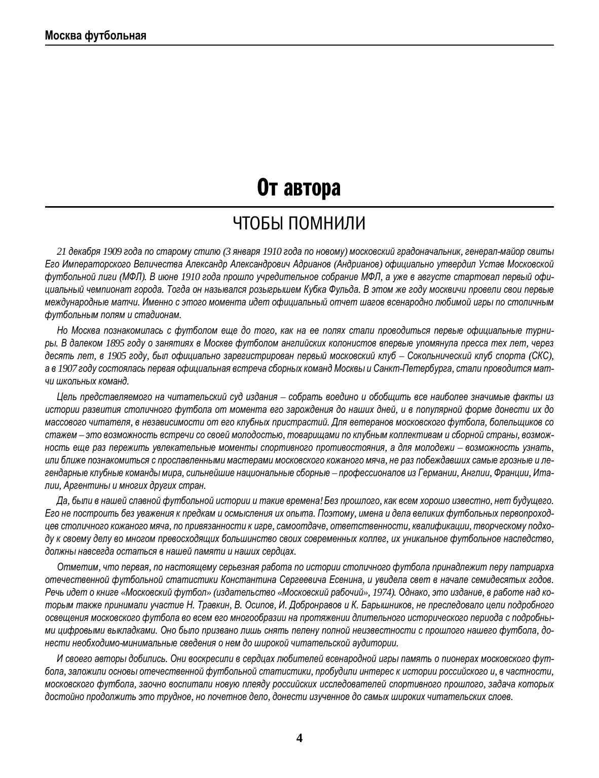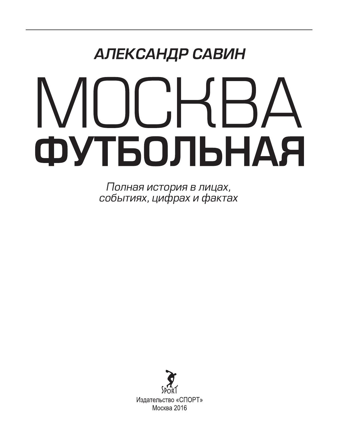 Издание знакомит читателя с увлекательной историей зарождения и становления столичного футбола, его великими победами и горькими поражениями, славными традициями, сложившимися на протяжении более чем векового периода. Впервые документально обобщена и представлена обширная и интересная информация обо всех московских командах, тренерах и игроках, когда-либо выступавших в клубном первенстве Москвы (до 1936 г.), в высшем и первом эшелонах отечественного футбола, на крупнейших международных турнирах, рассказано о вкладе москвичей в успехи нашей национальной сборной команды. Приведены результаты игр московских клубов во всех чемпионатах СССР и России с 1936 г. по сезон 2014/2015 включительно, розыгрышах Кубков СССР и России, европейских клубных турнирах. Книга содержит большое количество разнообразного документального, справочного и статистического материала, фрагментов воспоминаний легендарных футболистов и тренеров, спортивных журналистов и специалистов футбола. Значительное место отведено первым организаторам игрового спорта Москвы и меценатам, внесшим огромный вклад в становление городского футбола, особенно в дореволюционный период его развития. В советское время имена большинства этих людей были вычеркнуты из истории. Издание предназначено для самого широкого круга читателей.