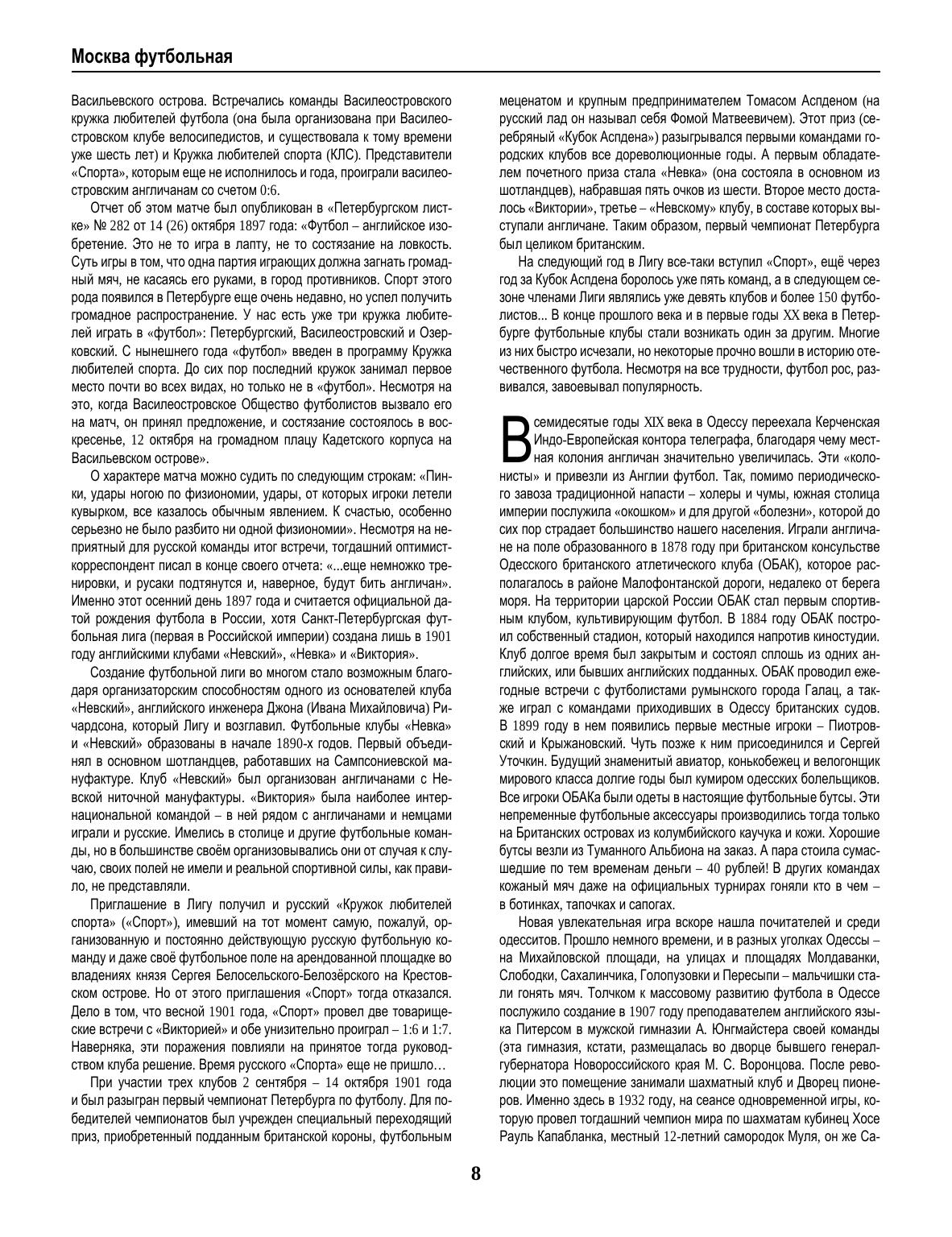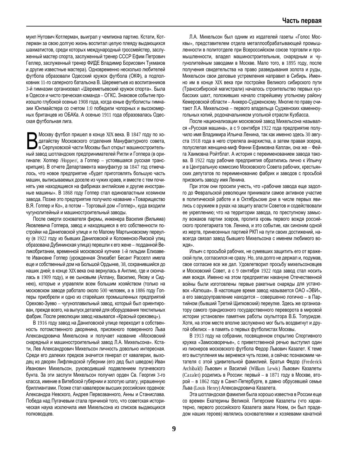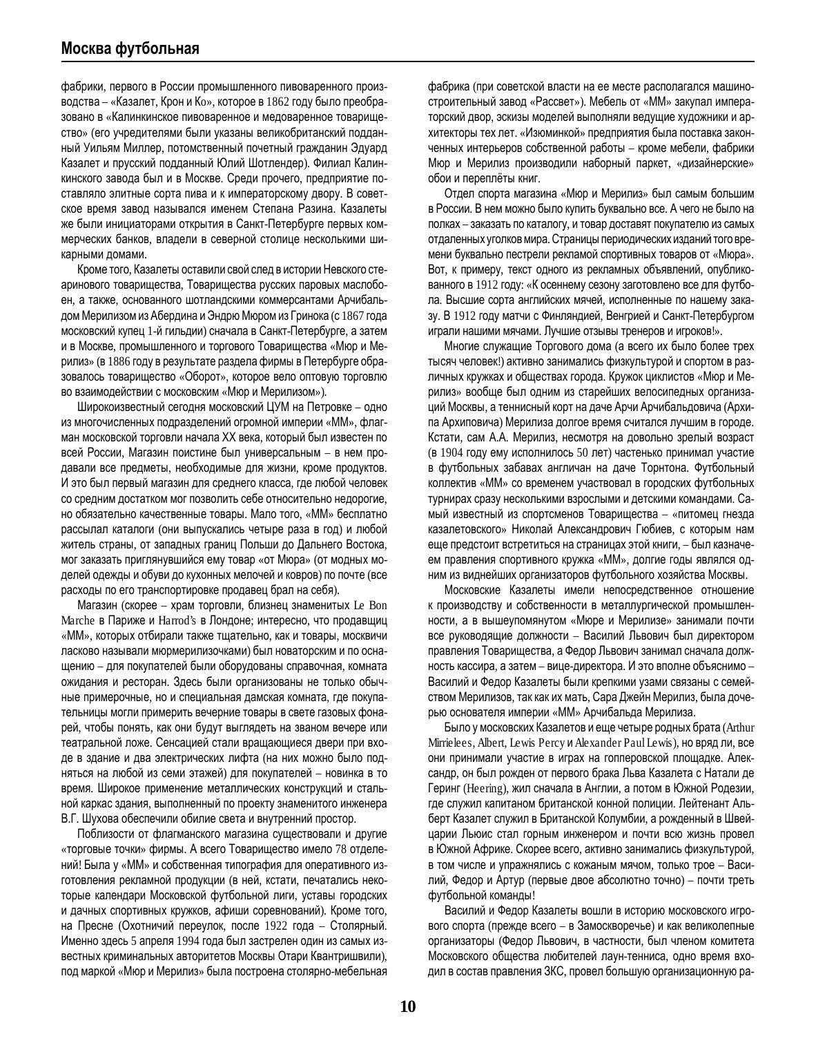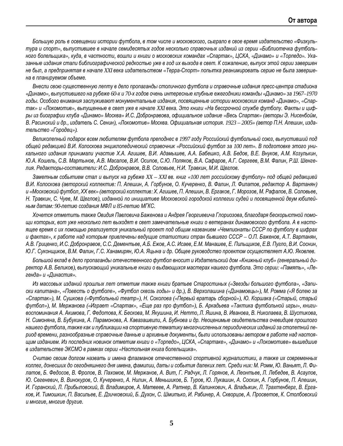 Издание знакомит читателя с увлекательной историей зарождения и становления столичного футбола, его великими победами и горькими поражениями, славными традициями, сложившимися на протяжении более чем векового периода. Впервые документально обобщена и представлена обширная и интересная информация обо всех московских командах, тренерах и игроках, когда-либо выступавших в клубном первенстве Москвы (до 1936 г.), в высшем и первом эшелонах отечественного футбола, на крупнейших международных турнирах, рассказано о вкладе москвичей в успехи нашей национальной сборной команды. Приведены результаты игр московских клубов во всех чемпионатах СССР и России с 1936 г. по сезон 2014/2015 включительно, розыгрышах Кубков СССР и России, европейских клубных турнирах. Книга содержит большое количество разнообразного документального, справочного и статистического материала, фрагментов воспоминаний легендарных футболистов и тренеров, спортивных журналистов и специалистов футбола. Значительное место отведено первым организаторам игрового спорта Москвы и меценатам, внесшим огромный вклад в становление городского футбола, особенно в дореволюционный период его развития. В советское время имена большинства этих людей были вычеркнуты из истории. Издание предназначено для самого широкого круга читателей.