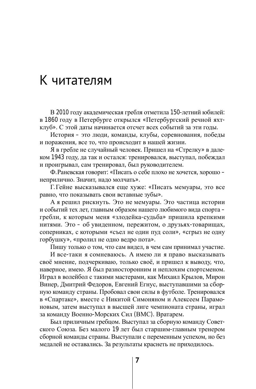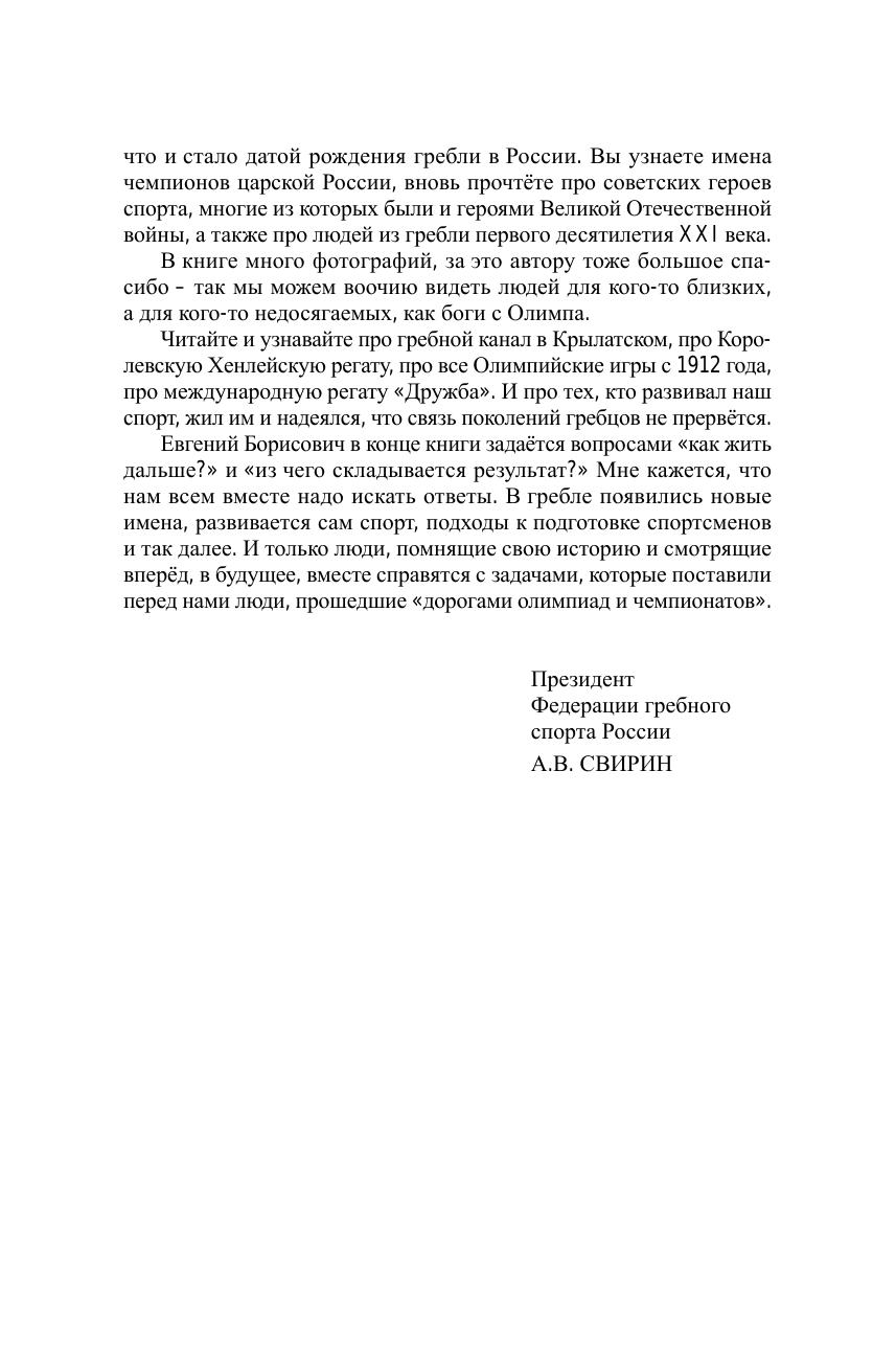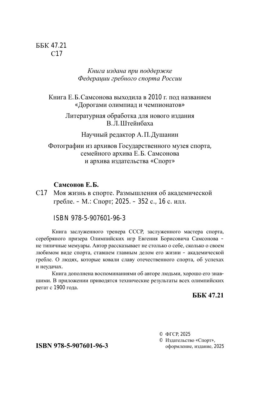 Книга заслуженного тренера СССР, заслуженного мастера спорта, серебряного призера Олимпийских игр Евгения Борисовича Самсонова – не типичные мемуары. Автор рассказывает не столько о себе, сколько о своем любимом виде спорта, ставшем главным делом его жизни – академической гребле. О людях, которые ковали славу отечественного спорта, об успехах и неудачах. Книга дополнена воспоминаниями об авторе людьми, хорошо его знавшими. В приложении приводятся технические результаты всех олимпийских регат с 1900 года.