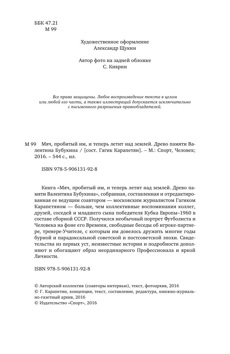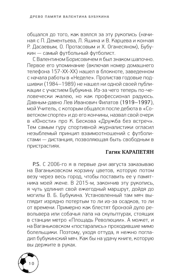 Книга «Мяч, пробитый им, и теперь летит над землей. Древо памяти Валентина Бубукина», собранная, составленная и отредактированная ее ведущим соавтором — московским журналистом Гагиком Карапетяном — больше, чем коллективные воспоминания коллег, друзей, соседей и младшего сына победителя Кубка Европы–1960 в составе сборной СССР. Получился необычный портрет Футболиста и Человека на фоне его Времени, свободные беседы об игроке-партнере, тренере-Учителе, с которым им довелось дружить многие годы бурной и парадоксальной советской и постсоветской эпохи. Свидетельства из первых уст, неизвестные истории и подробности дополняют и обогащают образ неординарного Профессионала и яркой Личности.