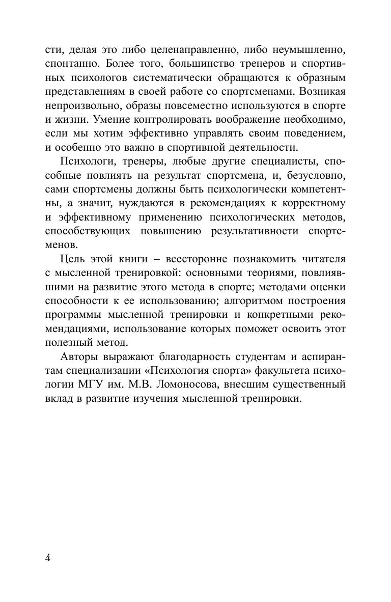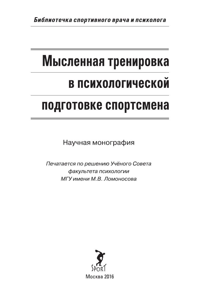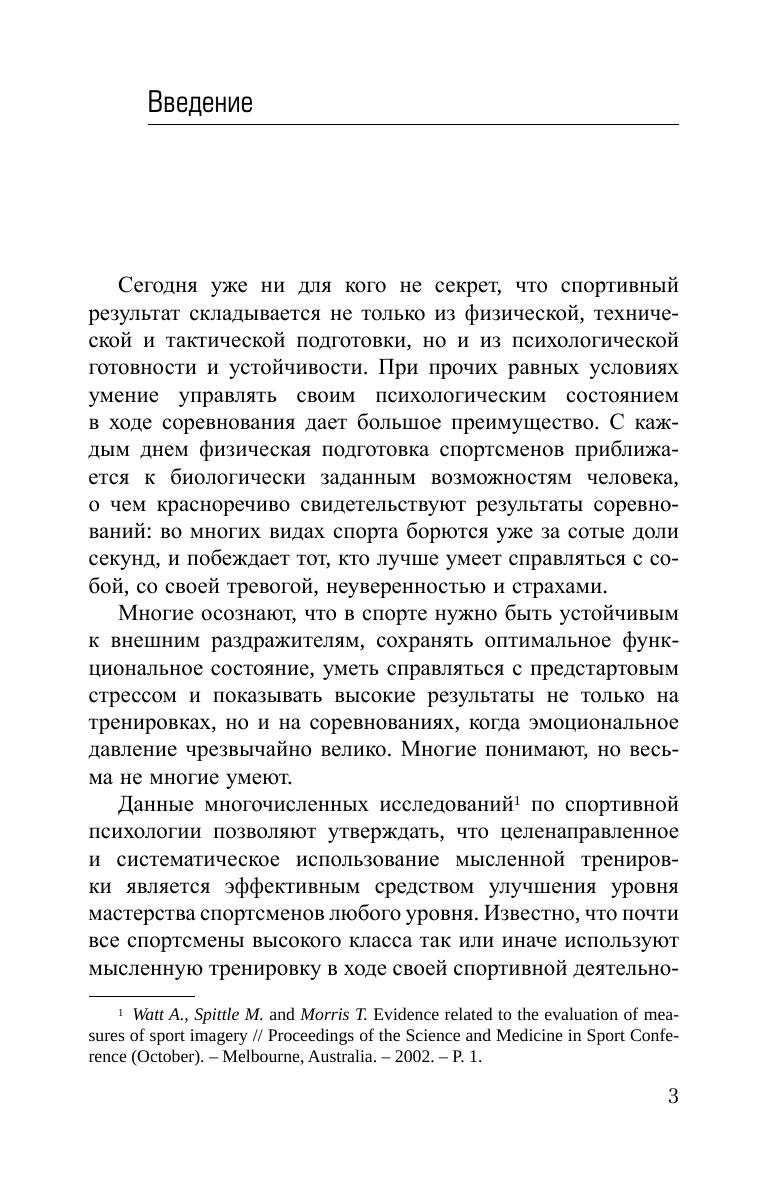Книга посвящена вопросам применения мысленной тренировки в практической деятельности спортсмена. Раскрываются теоретические основания построения программ мысленной тренировки, приводятся алгоритмы использования мысленной тренировки и конкретные рекомендации, адресованные спортсменам и спортивным психологам. Для специалистов в области психологии спорта, спортсменов, тренеров, а также всех, кто интересуется возможностями использования психологической науки в спорте
