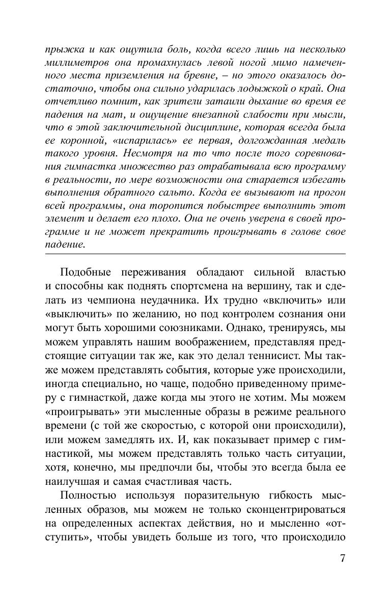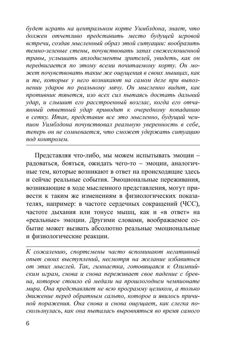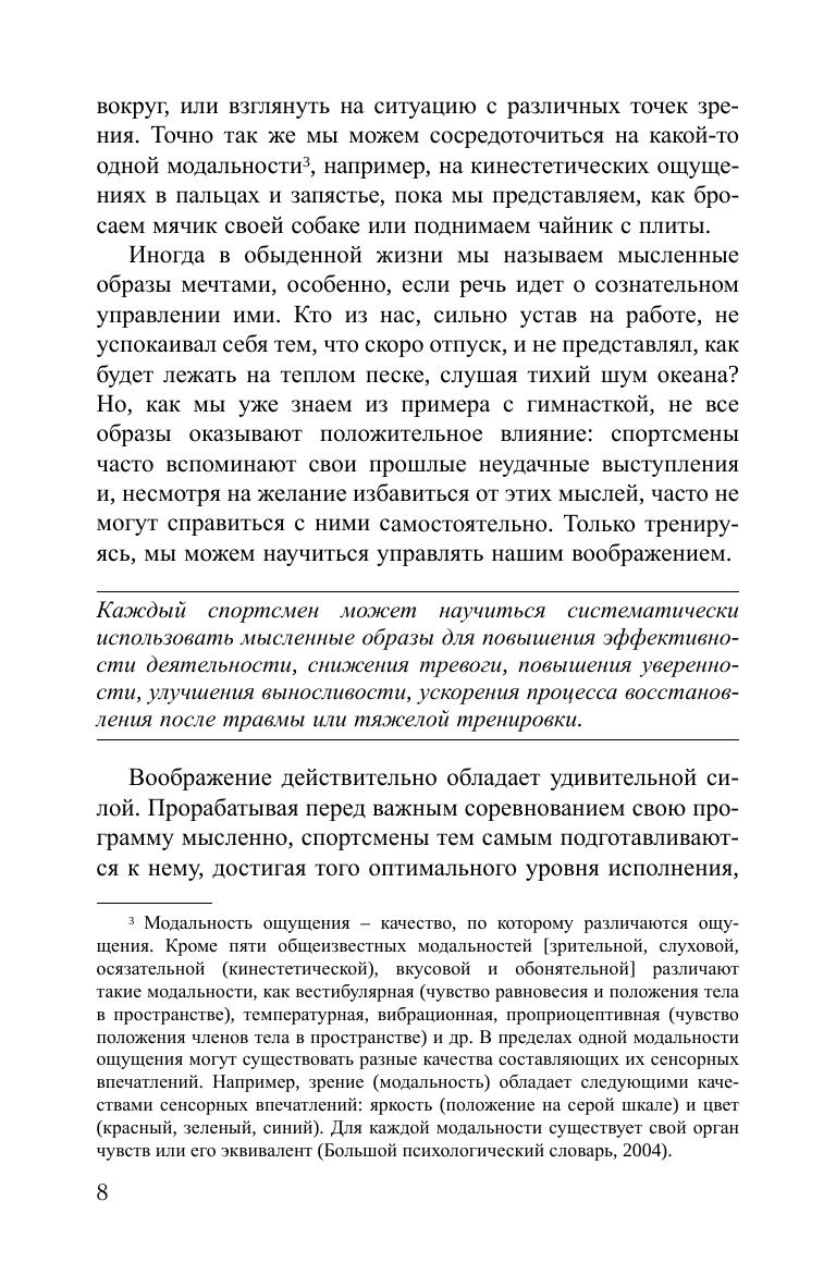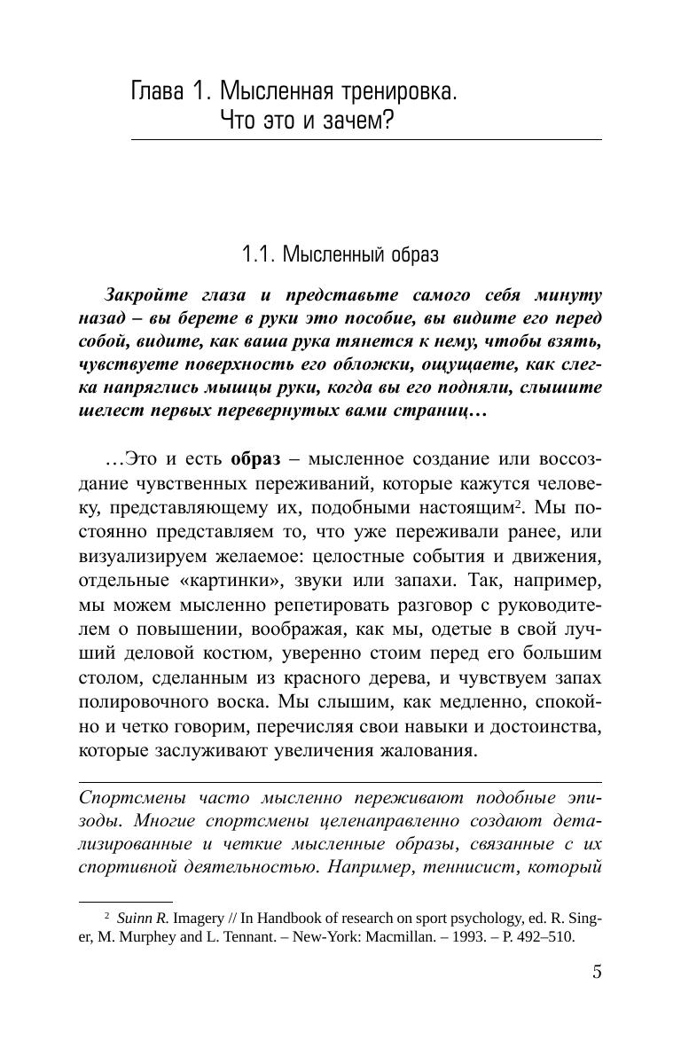 Книга посвящена вопросам применения мысленной тренировки в практической деятельности спортсмена. Раскрываются теоретические основания построения программ мысленной тренировки, приводятся алгоритмы использования мысленной тренировки и конкретные рекомендации, адресованные спортсменам и спортивным психологам. Для специалистов в области психологии спорта, спортсменов, тренеров, а также всех, кто интересуется возможностями использования психологической науки в спорте