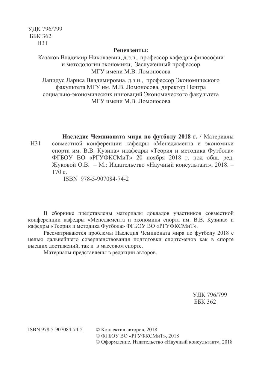 В сборнике представлены материалы докладов участников совместной конференции кафедры «Менеджмента и экономики спорта им. В.В. Кузина» и кафедры «Теория и методика Футбола» ФГБОУ ВО «РГУФКСМиТ».