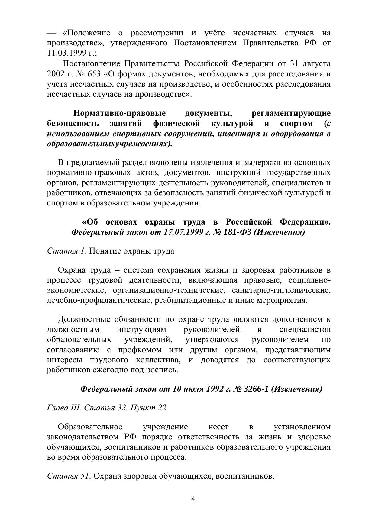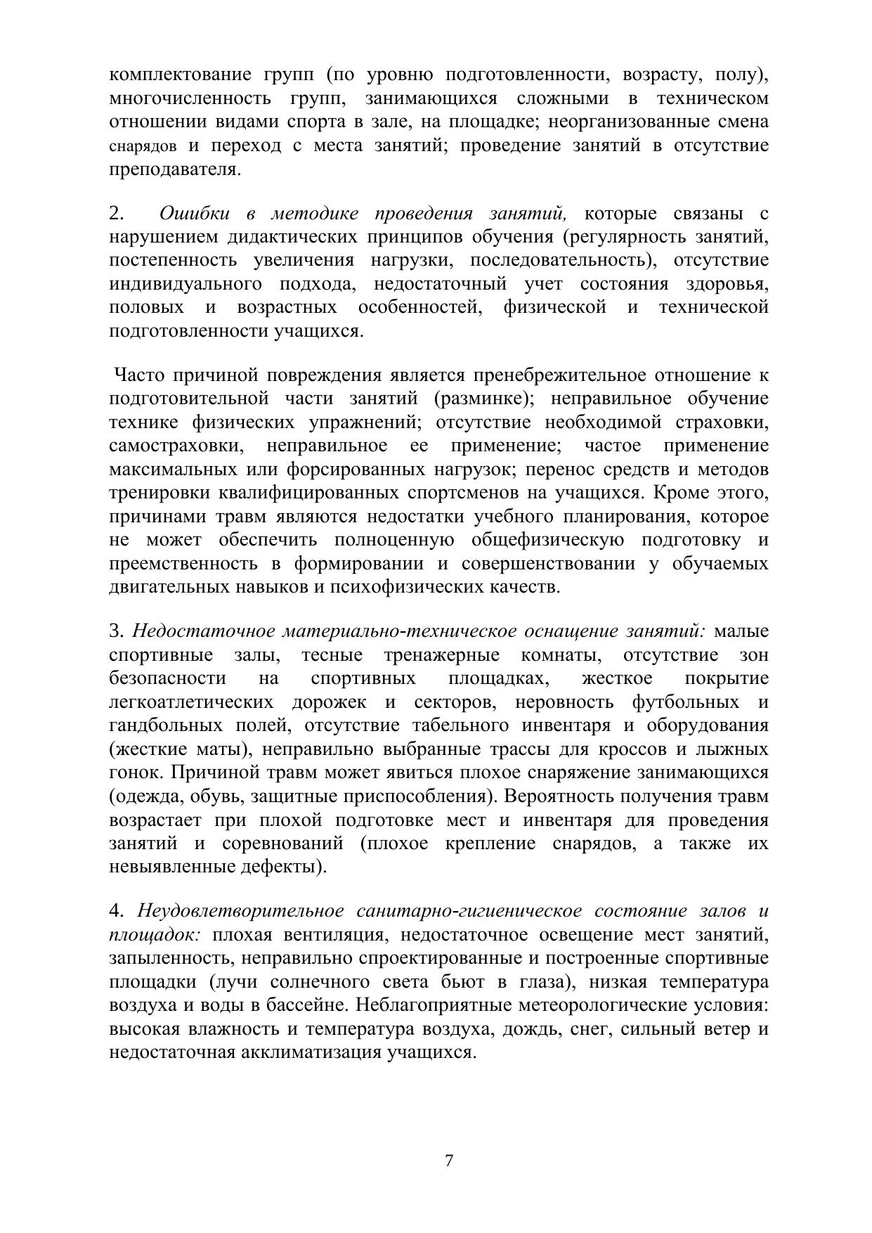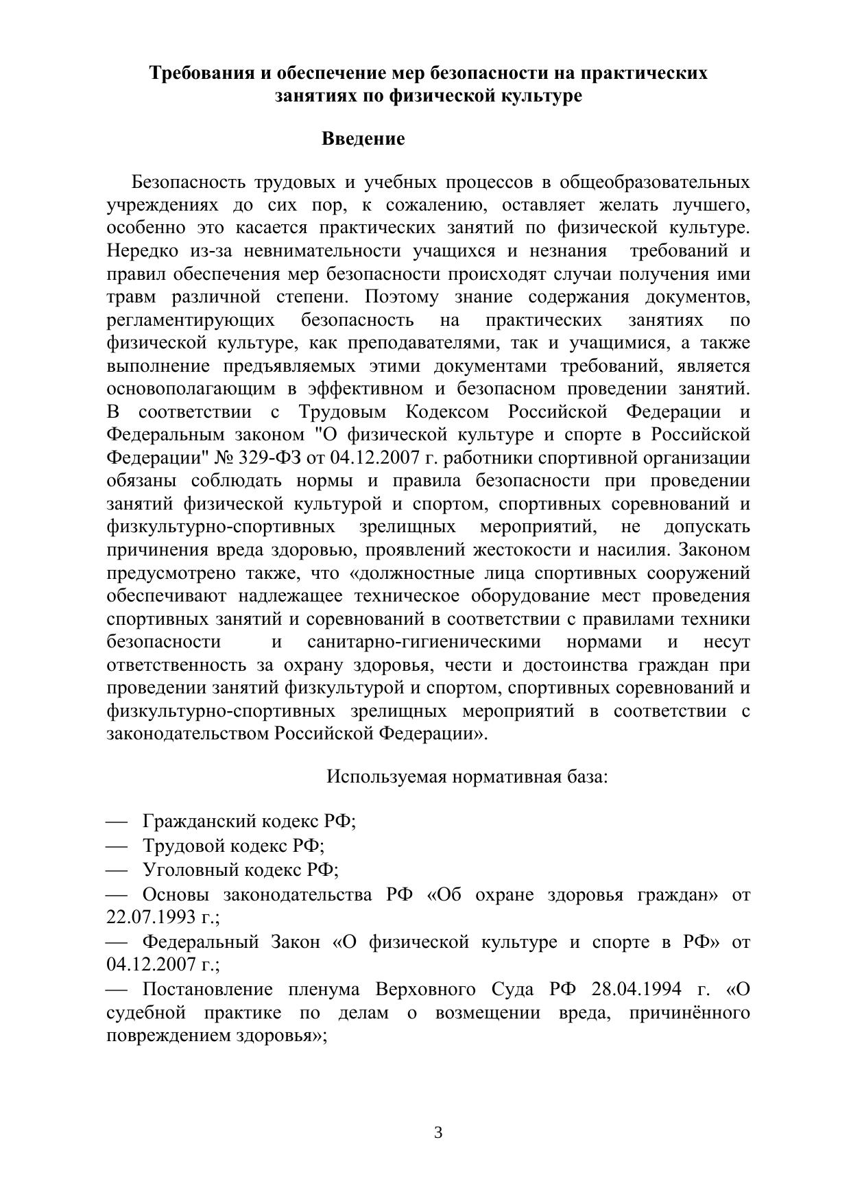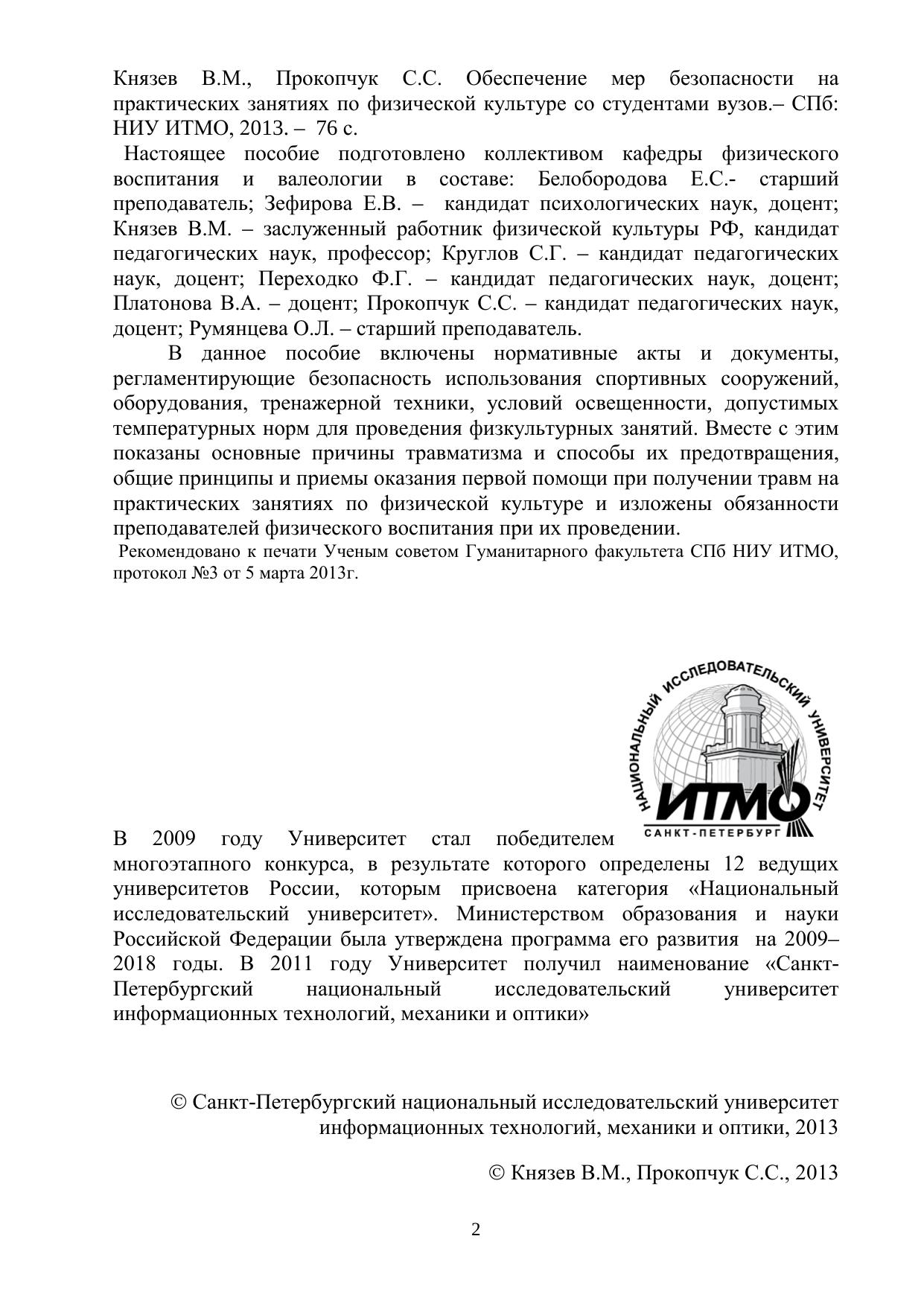 Настоящее пособие подготовлено коллективом кафедры физического воспитания и валеологии в составе: Белобородова Е.С.- старший преподаватель Зефирова Е.В. – кандидат психологических наук, доцент Князев В.М. – заслуженный работник физической культуры РФ, кандидат педагогических наук, профессор Круглов С.Г. – кандидат педагогических наук, доцент Переходко Ф.Г. – кандидат педагогических наук, доцент Платонова В.А. – доцент Прокопчук С.С. – кандидат педагогических наук,доцент Румянцева О.Л. – старший преподаватель. В данное пособие включены нормативные акты и документы, регламентирующие безопасность использования спортивных сооружений, оборудования, тренажерной техники, условий освещенности, допустимых температурных норм для проведения физкультурных занятий. Вместе с этим показаны основные причины травматизма и способы их предотвращения, общие принципы и приемы оказания первой помощи при получении травм на практических занятиях по физической культуре и изложены обязанности преподавателей физического воспитания при их проведении.