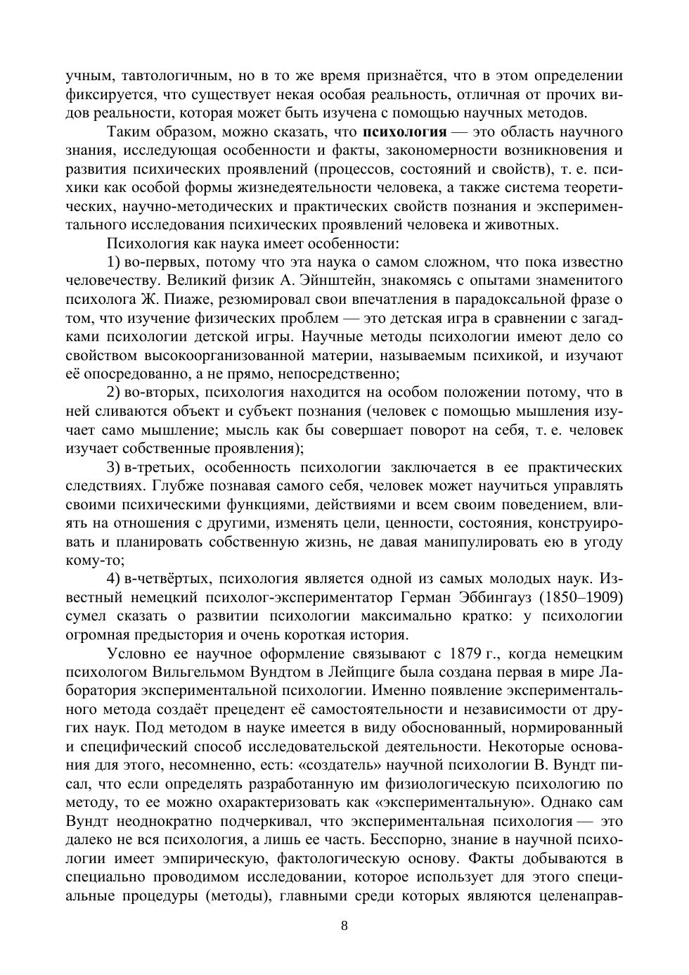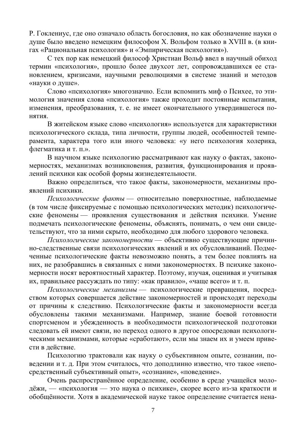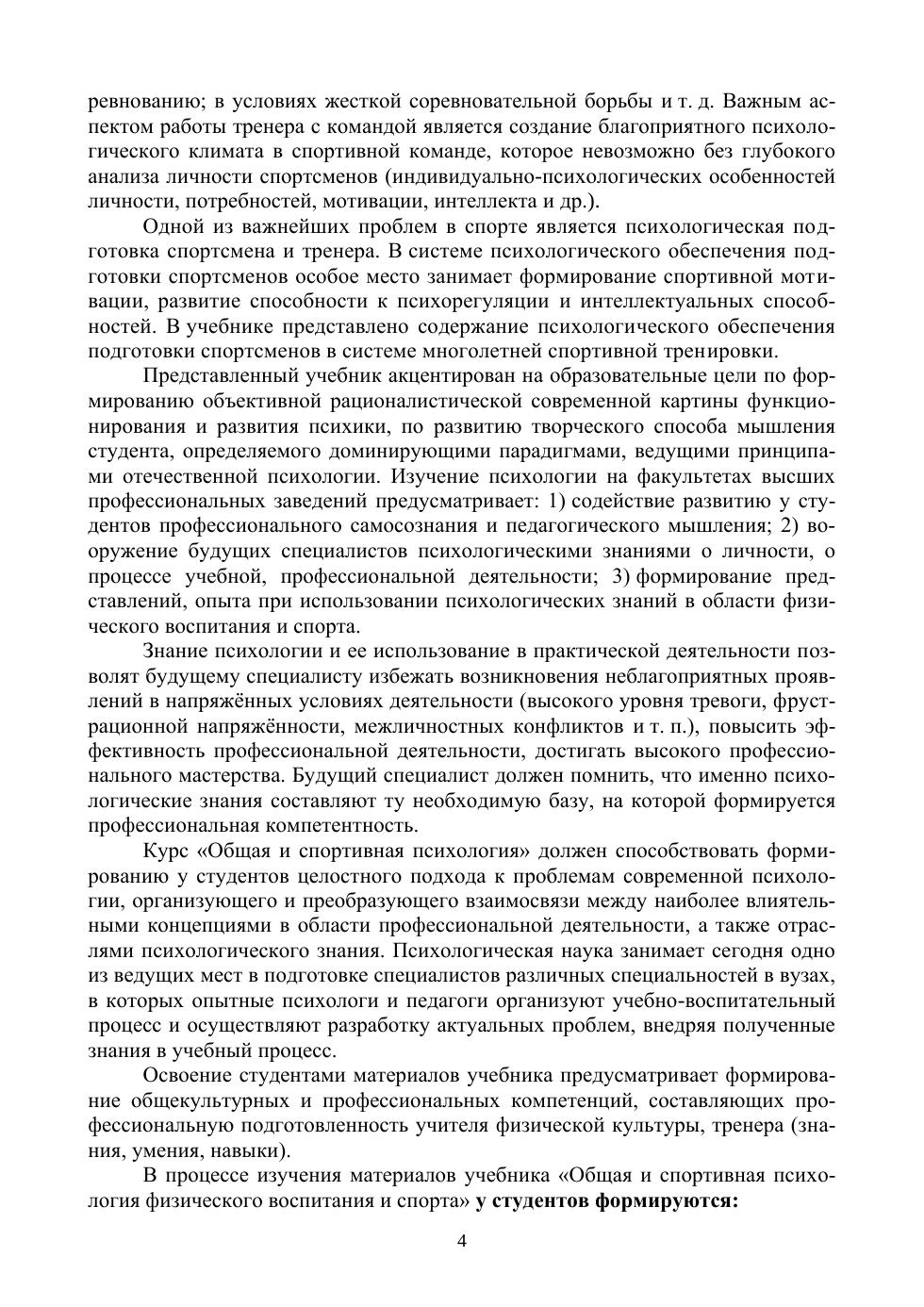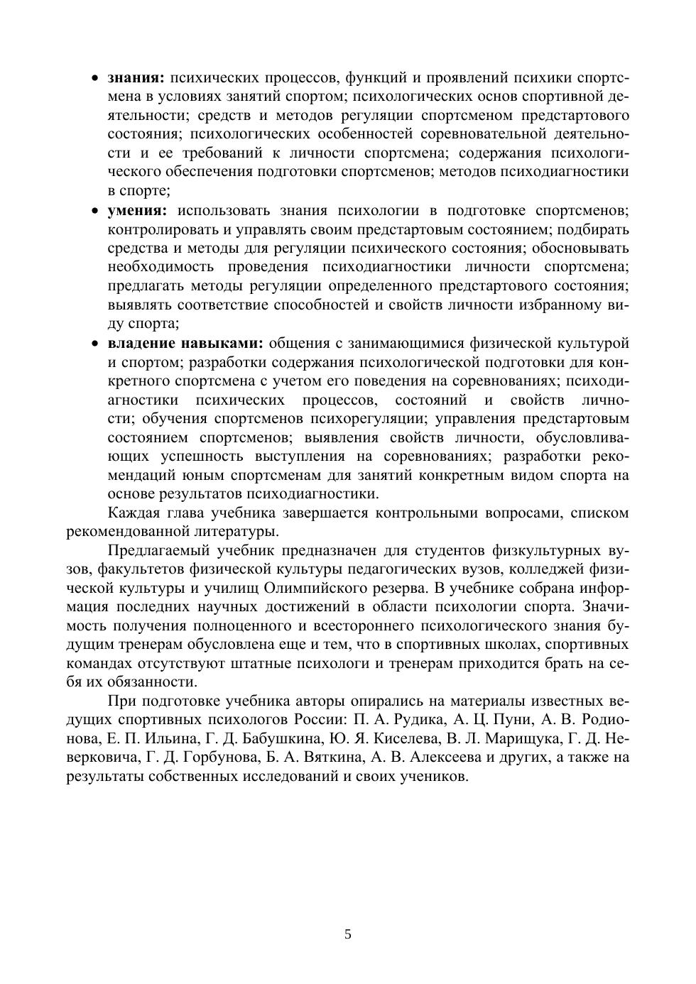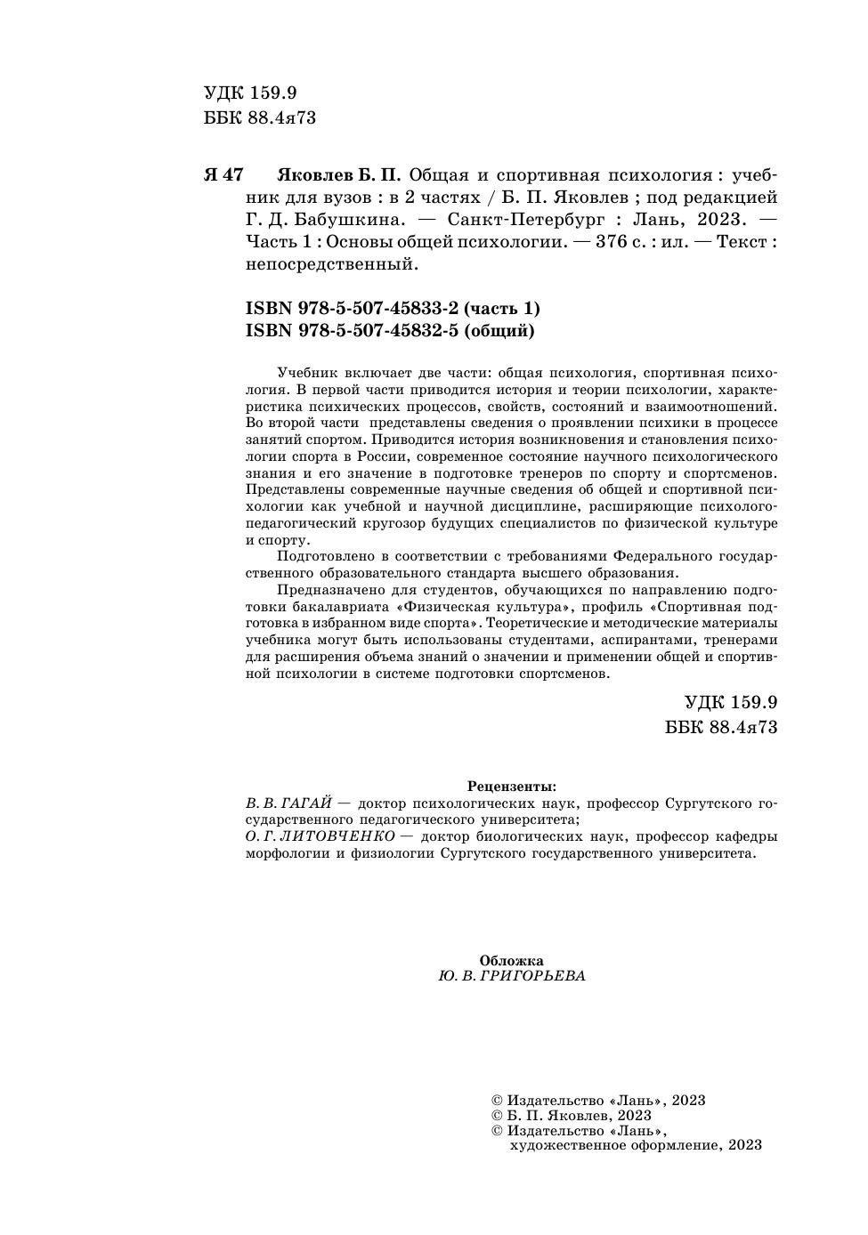 Учебник включает две части: общая психология, спортивная психология. В первой части приводится история и теории психологии, характеристика психических процессов, свойств, состояний и взаимоотношений. Во второй части представлены сведения о проявлении психики в процессе занятий спортом. Приводится история возникновения и становления психологии спорта в России, современное состояние научного психологического знания и его значение в подготовке тренеров по спорту и спортсменов. Представлены современные научные сведения об общей и спортивной психологии как учебной и научной дисциплине, расширяющие психолого-педагогический кругозор будущих специалистов по физической культуре и спорту. Подготовлено в соответствии с требованиями Федерального государственного образовательного стандарта высшего образования. Предназначено для студентов, обучающихся по направлению подготовки бакалавриата «Физическая культура», профиль «Спортивная подготовка в избранном виде спорта». Теоретические и методические материалы учебника могут быть использованы студентами, аспирантами, тренерами для расширения объема знаний о значении и применении общей и спортивной психологии в системе подготовки спортсменов.