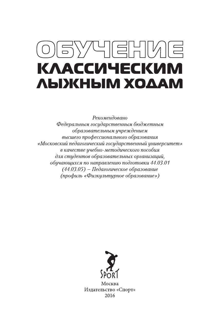 Учебно-методическое пособие соответствует стандарту направления подготовки 44.03.01 – «Педагогическое образование» (профиль «Физкультурное образование») (квалификация — бакалавр). Проанализирована техника классических лыжных ходов, представлена методика обучения этим ходам, систематизированы возникающие ошибки, а также приведены вопросы и тестовые задания для самоконтроля. Методические разработки по изучению техники классических лыжных ходов составлены для обучения учащихся общеобразовательных школ и занимающихся в детско-юношеских спортивных школах. Пособие предназначено для студентов дневного и заочного отделений факультетов физической культуры педагогических вузов, учителей физической культуры общеобразовательных школ и тренеров по лыжным гонкам.