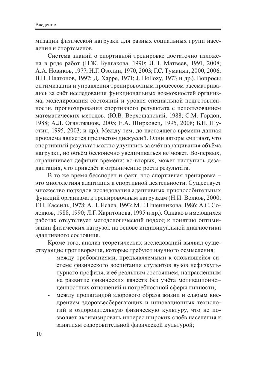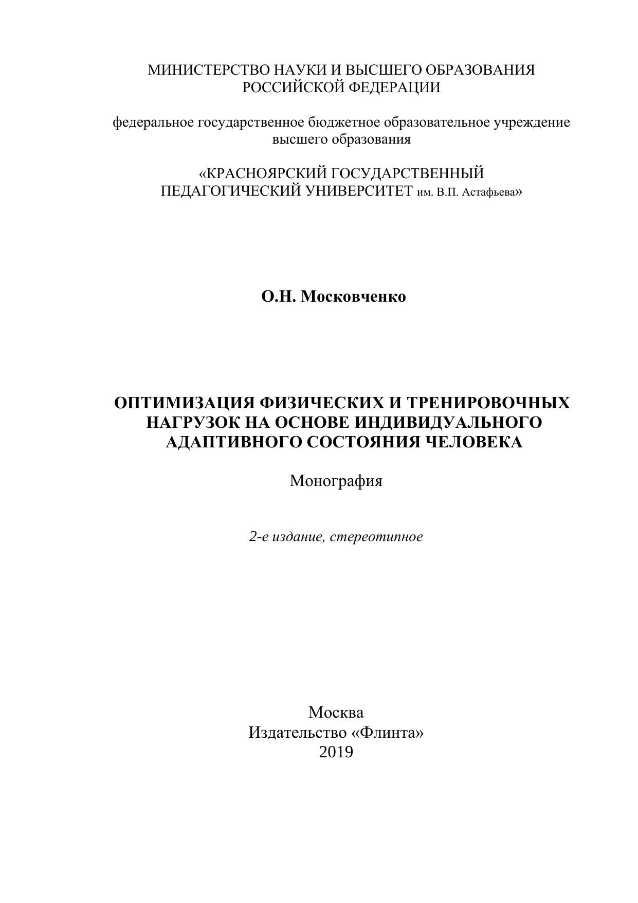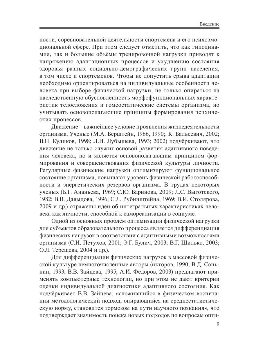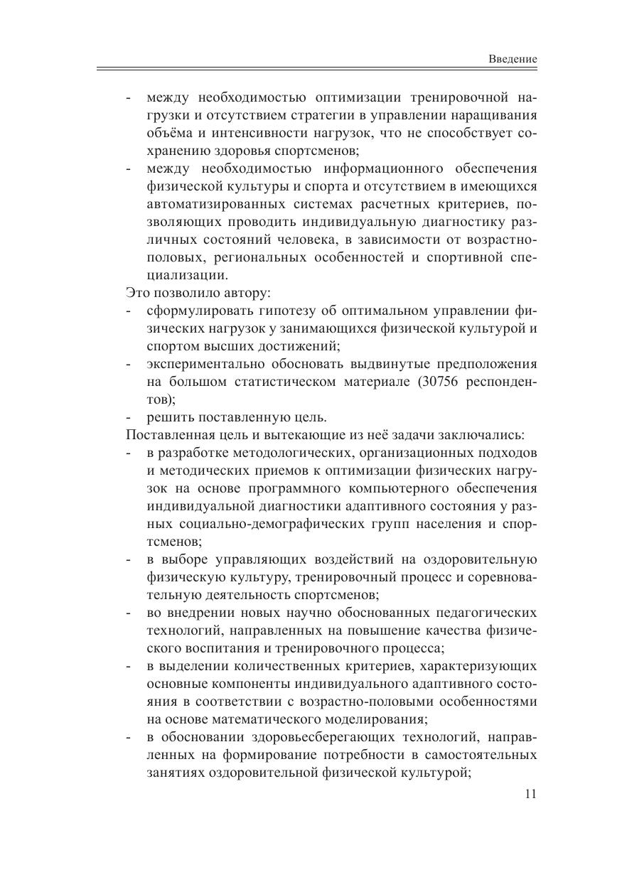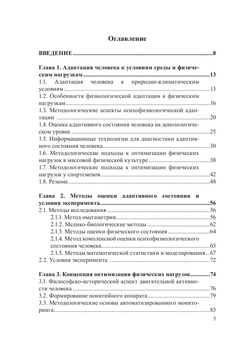 Дано физиологическое, психофизиологическое и педагогическое обоснование инновационных подходов к оптимизации физической нагрузки на основе индивидуальной диагностики адаптивного состояния занимающихся физической культурой и спортом с применением компьютерных технологий. Выделены количественные критерии, характеризующие нейродинамические профили психофизиологической адаптации, уровни адаптивных состояний в соответствии с возрастно-половыми различиями для определения стратегии и тактики регулирования физической нагрузки для оздоровления организма. Описана система управления тренировочным процессом на основе объективных критериев адаптивного состояния, модельных характеристик, позволяющих оптимизировать динамику нагрузок в различных видах спорта.