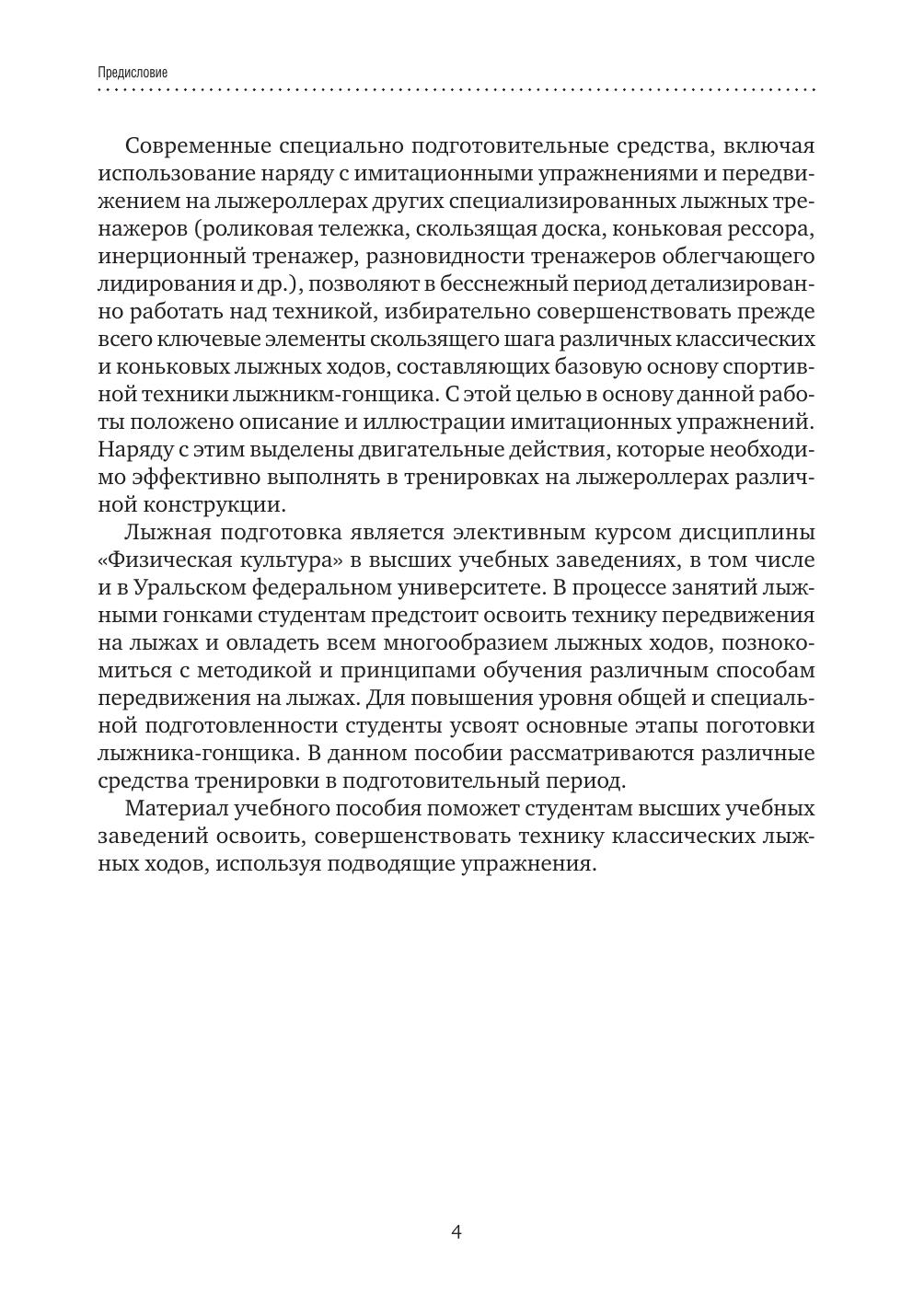В учебном пособии рассматриваются основы техники имитационных специальных упражнений, техника передвижения на лыжероллерах, раскрываются вопросы организации учебно‑тренировочного процесса по лыжной подготовке к зимнему сезону в бесснежный период. Уровень изложения материала соответствует современным достижениям спортивной науки.