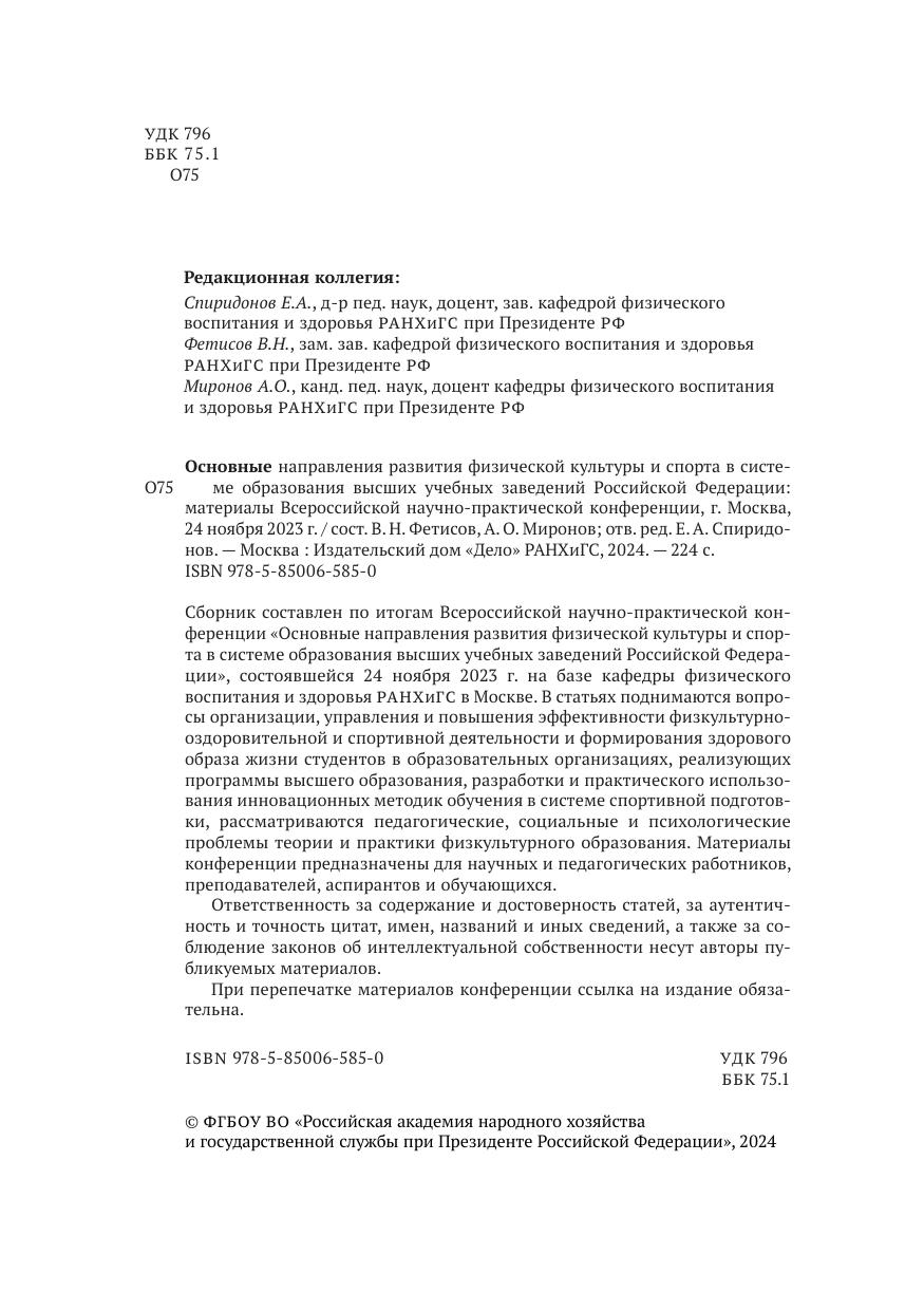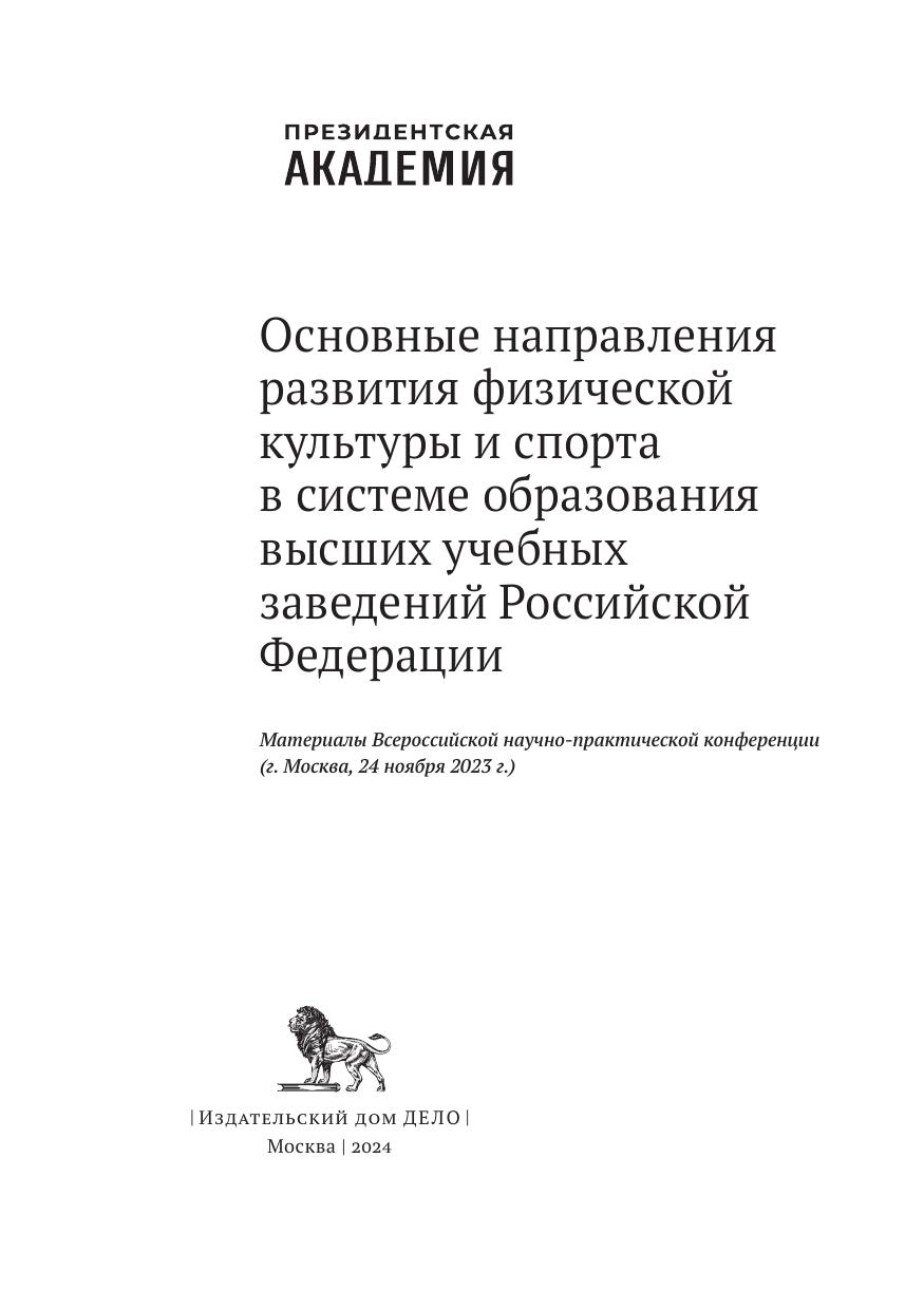 Сборник составлен по итогам Всероссийской научно-практической конференции «Основные направления развития физической культуры и спорта в системе образования высших учебных заведений Российской Федерации», состоявшейся 24 ноября 2023 г. на базе кафедры физического воспитания и здоровья РАНХиГС в Москве. В статьях поднимаются вопросы организации, управления и повышения эффективности физкультурно-оздоровительной и спортивной деятельности и формирования здорового