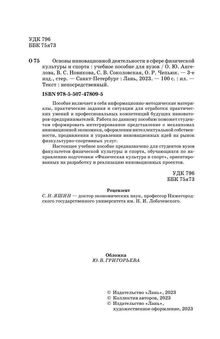 Пособие включает в себя информационно-методические материалы, практические задания и ситуации для отработки практических умений и профессиональных компетенций будущих инноваторов-предпринимателей. Работа по данному пособию поможет студентам сформировать интегрированное представление о механизмах инновационной экономики, оформлении интеллектуальной собственности, продвижении и управлении инновационных идей на рынок физкультурно-спортивных услуг. Настоящее учебное пособие предназначено для студентов факультета физической культуры и спорта, обучающихся по направлению подготовки «Физическая культура и спорт», ориентированных на разработку и реализацию инновационных проектов.