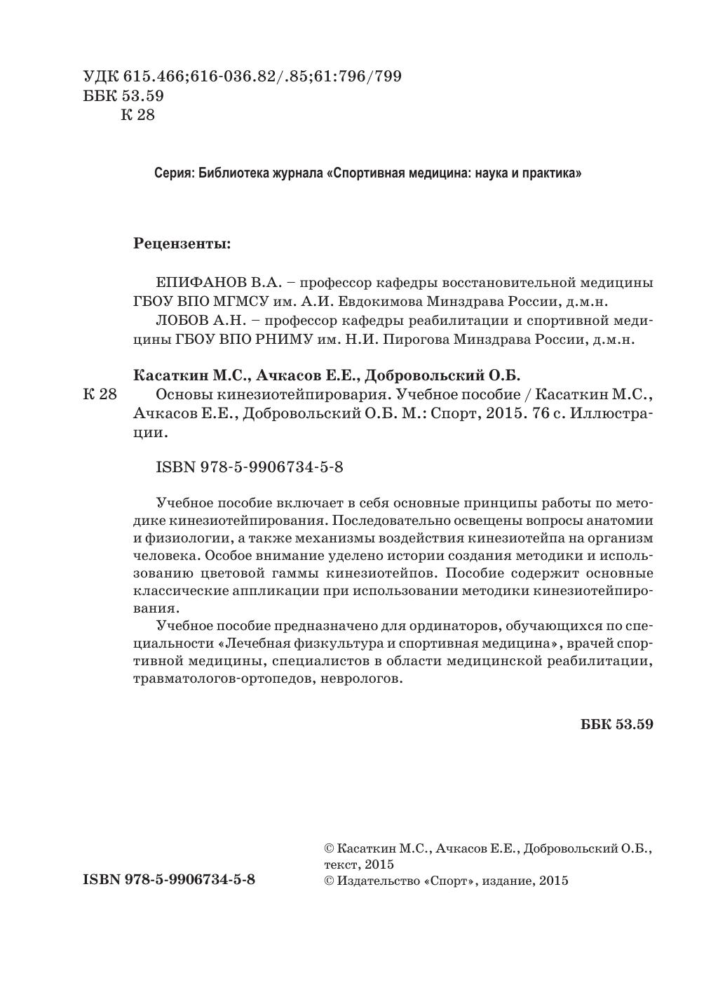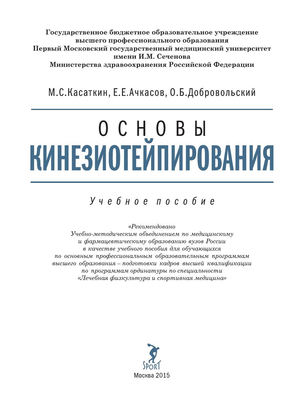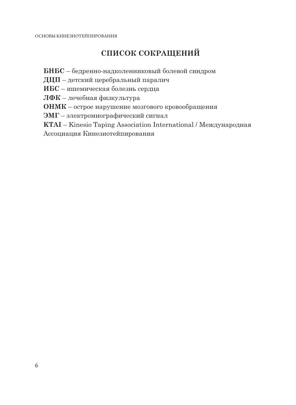 Учебное пособие включает в себя основные принципы работы по методике кинезиотейпирования. Последовательно освещены вопросы анатомии и физиологии, а также механизмы воздействия кинезиотейпа на организм человека. Особое внимание уделено истории создания методики и использованию цветовой гаммы кинезиотейпов. Пособие содержит основные классические аппликации при использовании методики кинезиотейпирования. Учебное пособие предназначено для ординаторов, обучающихся по специальности «Лечебная физкультура и спортивная медицина», врачей спортивной медицины, специалистов в области медицинской реабилитации, травматологов-ортопедов, неврологов.