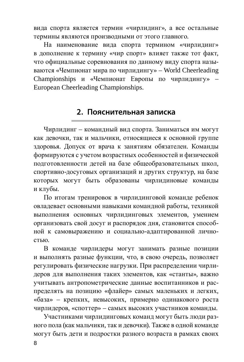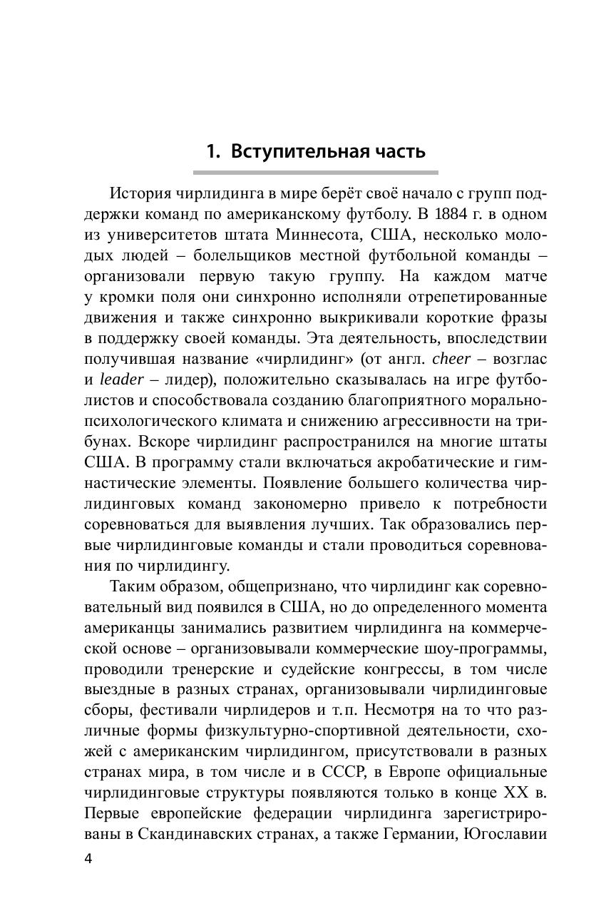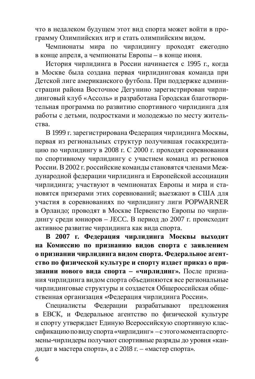 Пособие содержит рекомендации по подготовке чирлидеров с методическими указаниями к выполнению элементов, прогрессией обучения, нормативами с учётом возрастных особенностей и рассчитано на подготовку детей в трех возрастных группах: 6–8 лет; 8–12 лет; 12–17 лет.