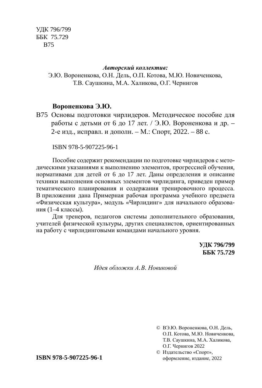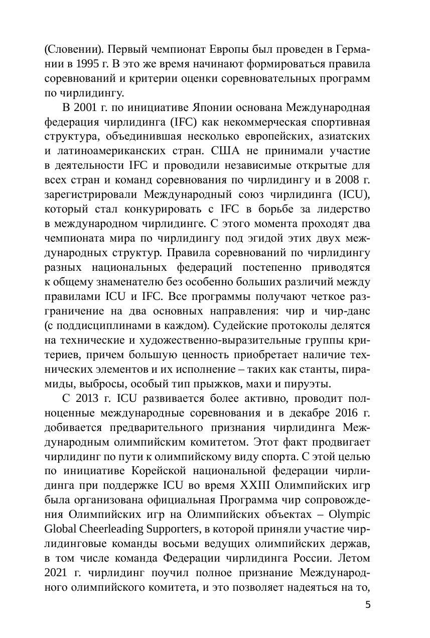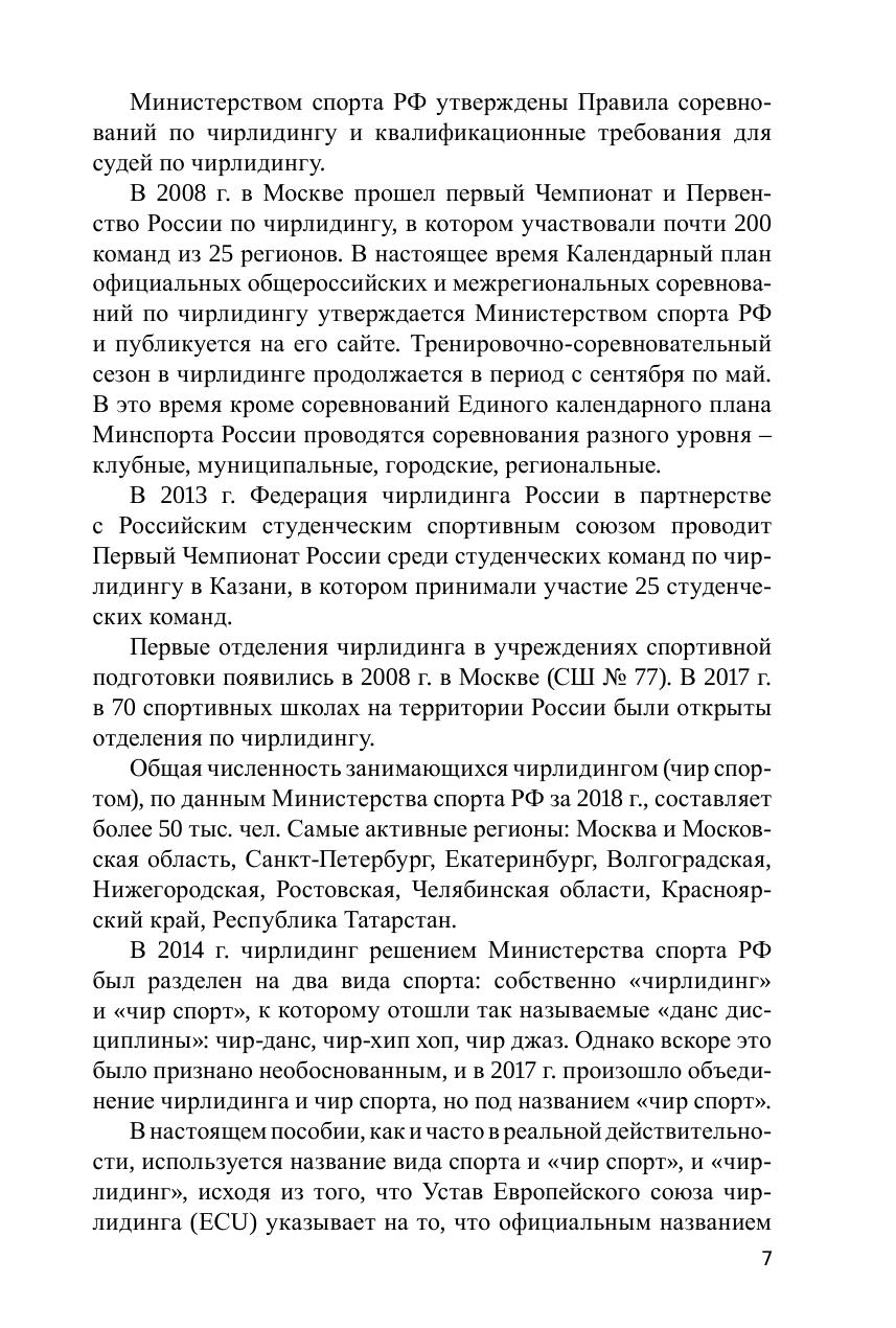Пособие содержит рекомендации по подготовке чирлидеров с методическими указаниями к выполнению элементов, прогрессией обучения, нормативами с учётом возрастных особенностей и рассчитано на подготовку детей в трех возрастных группах: 6–8 лет; 8–12 лет; 12–17 лет.