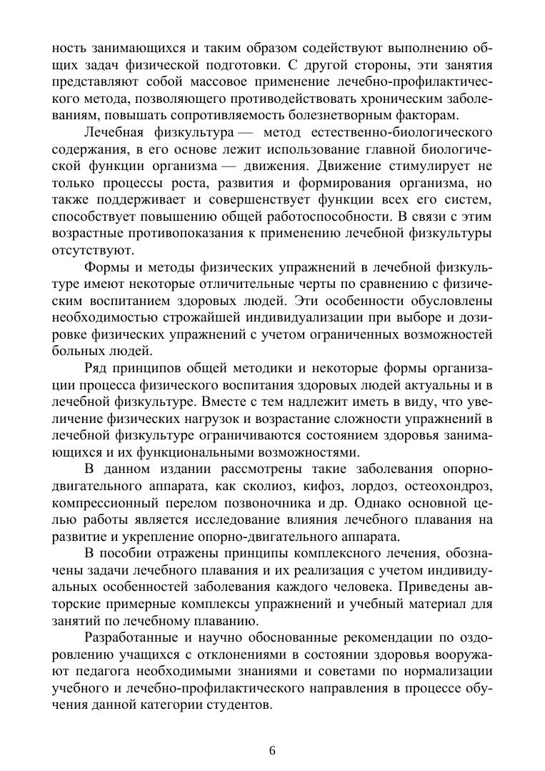В учебном пособии рассмотрены возможные нарушения опорно-двигательного аппарата, а также вопросы применения элементов лечебной физической культуры и лечебного плавания в занятиях со студентами подготовительных и специальных медицинских групп. На основе анализа лечебного дозированного плавания в пособие включены комплексы специальных плавательных упражнений с использованием различных стилей плавания и их элементов. Главное внимание уделено методике построения занятий и применению специальных средств физической культуры для профилактики и уменьшения нарушений опорно-двигательного аппарата. Соответствует современным требованиям Федерального государственного образовательного стандарта среднего профессионального образования и профессиональным квалификационным требованиям. Для студентов образовательных учреждений среднего профессионального образования, преподавателей и всех интересующихся данной проблемой.