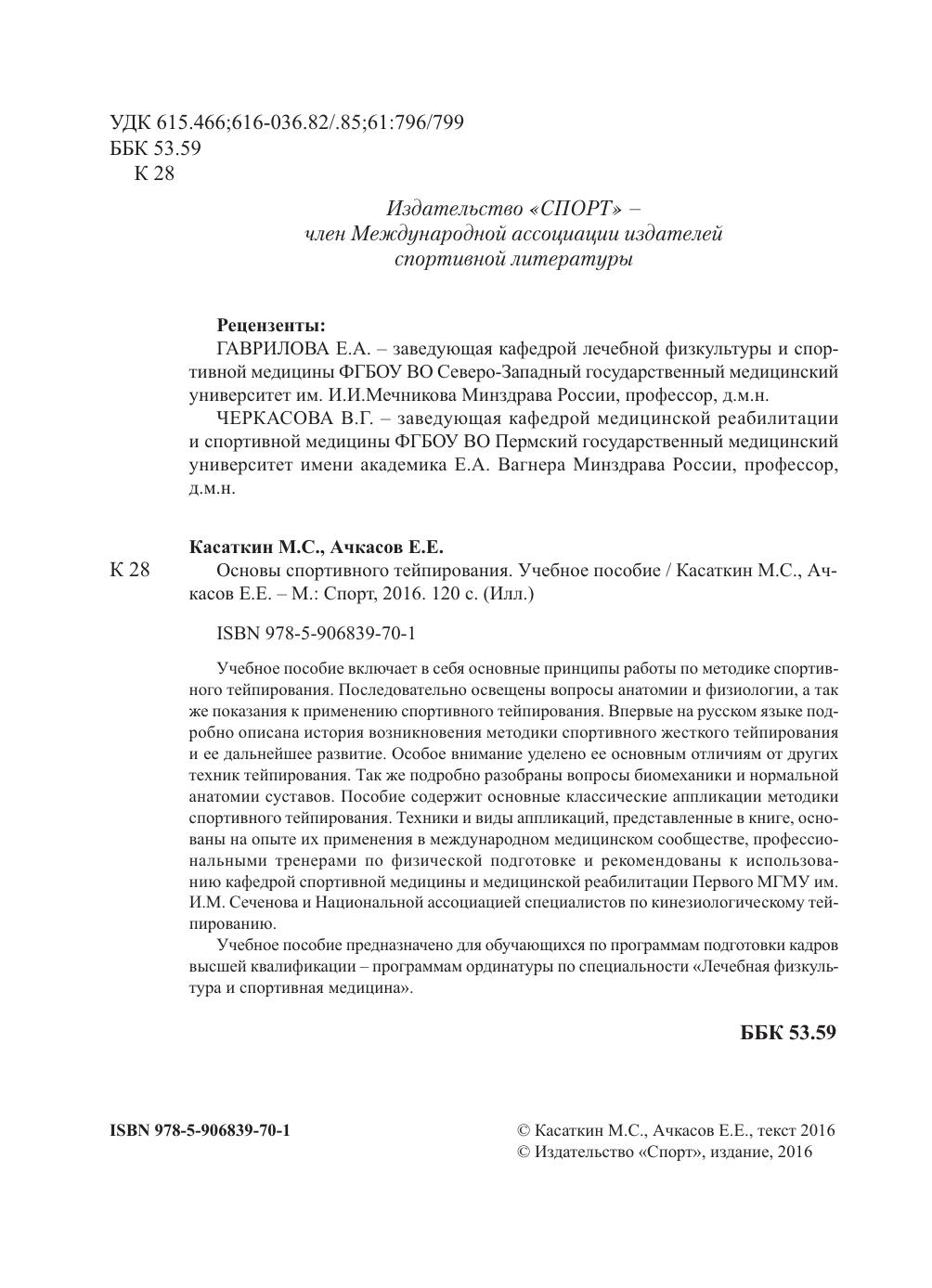 Учебное пособие включает в себя основные принципы работы по методике спортивного тейпирования. Последовательно освещены вопросы анатомии и физиологии, а также показания к применению спортивного тейпирования. Впервые на русском языке подробно описана история возникновения методики спортивного жесткого тейпирования и ее дальнейшее развитие. Особое внимание уделено ее основным отличиям от других техник тейпирования. Так же подробно разобраны вопросы биомеханики и нормальной анатомии суставов. Пособие содержит основные классические аппликации методики спортивного тейпирования. Техники и виды аппликаций, представленные в книге, основаны на опыте их применения в международном медицинском сообществе, профессиональными тренерами по физической подготовке и рекомендованы к использованию кафедрой спортивной медицины и медицинской реабилитации Первого МГМУ им. И.М. Сеченова и Национальной ассоциацией специалистов по кинезиологическому тейпированию. Учебное пособие предназначено для обучающихся по программам подготовки кадров