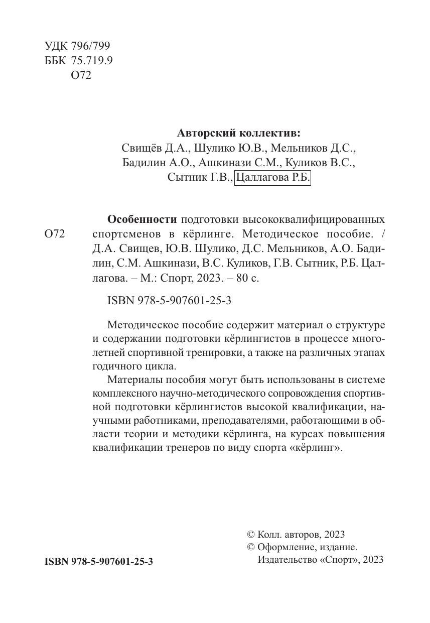 комплексного научно-методического сопровождения спортивной подготовки кёрлингистов высокой квалификации, научными работниками, преподавателями, работающими в области теории и методики кёрлинга, на курсах повышения квалификации тренеров по виду спорта «кёрлинг».