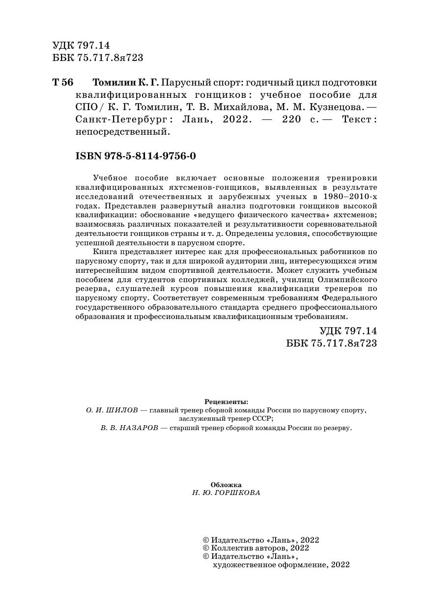 Учебное пособие включает основные положения тренировки квалифицированных яхтсменов-гонщиков, выявленных в результате исследований отечественных и зарубежных ученых в 1980-2010-х годах. Представлен развернутый анализ подготовки гонщиков высокой квалификации: обоснование «ведущего физического качества» яхтсменов, взаимосвязь различных показателей и результативности соревновательной деятельности гонщиков страны и т.д. Определены условия, способствующие успешной деятельности в парусном спорте. Книга представляет интерес как для профессиональных работников по парусному спорту, так и для широкой аудитории лиц, интересующихся этим интереснейшим видом спортивной деятельности. Может служить учебным пособием для студентов спортивных колледжей, училищ Олимпийского резерва, слушателей курсов повышения квалификации тренеров по парусному спорту. Соответствует современным требованиям Федерального государственного образовательного стандарта среднего профессионального образования и профессиональным квалификационным требованиям.