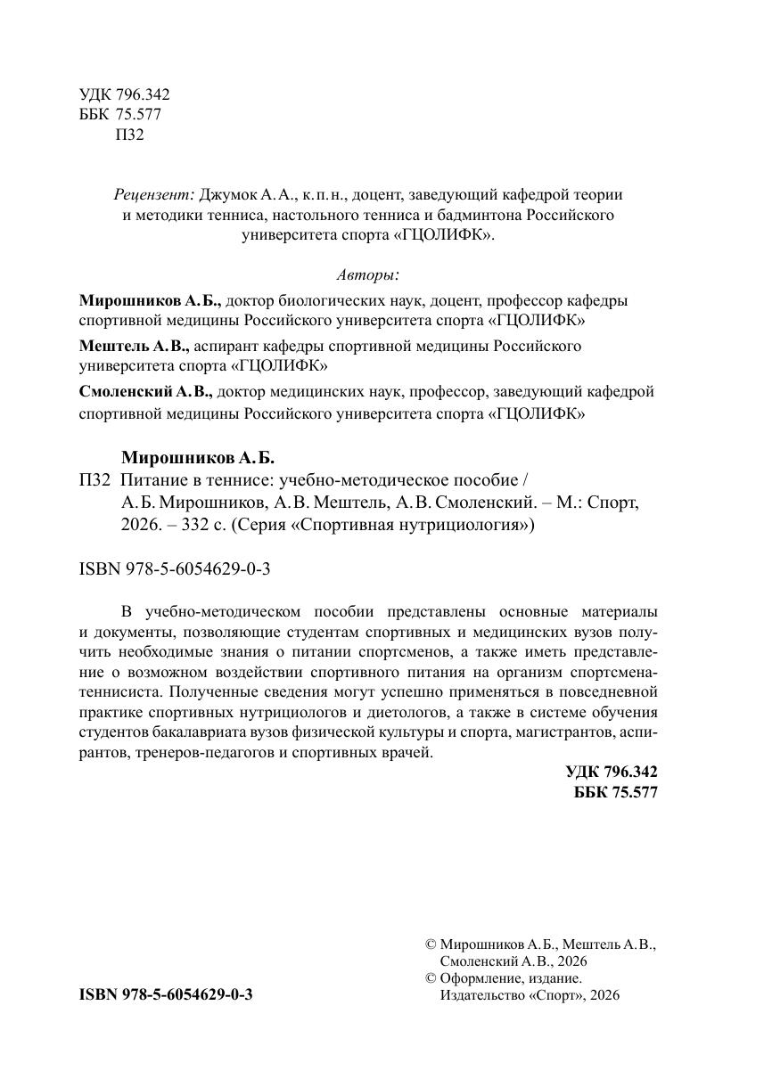 В учебно-методическом пособии представлены основные материалы и документы, позволяющие студентам спортивных и медицинских вузов получить необходимые знания о питании спортсменов, а также иметь представление о возможном воздействии спортивного питания на организм спортсмена-теннисиста. Полученные сведения могут успешно применяться в повседневной практике спортивных нутрициологов и диетологов, а также в системе обучения студентов бакалавриата вузов физической культуры и спорта, магистрантов, аспирантов, тренеров-педагогов и спортивных врачей.