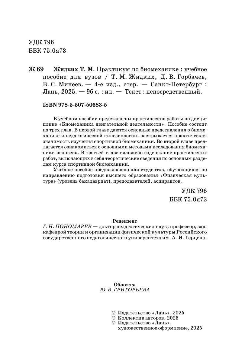 В учебном пособии представлены практические работы по дисциплине «Биомеханика двигательной деятельности». Пособие состоит из трех глав. В первой главе даются основные представления о биомеханике и педагогической кинезиологии, раскрывается практическая значимость изучения спортивной биомеханики. Во второй главе предлагается ознакомиться с основными методами исследования биомеханики человека. В третьей главе изложено содержание практических работ, включающих в себя теоретические сведения по основным разделам курса спортивной биомеханики. Учебное пособие предназначено для студентов, обучающихся по по направлению подготовки высшего образования «Физическая культура» (уровень бакалавриат), преподавателей, аспирантов.