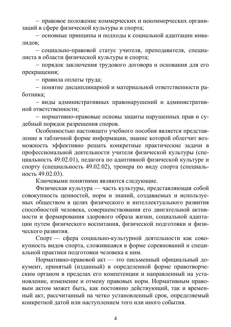 В пособии раскрывается история нормативно-правового регулирования сферы физической культуры и спорта в России, а также правовые акты международных спортивных организаций. Особенностью пособия является представление учебных материалов в виде информационных таблиц. Соответствует современным требованиям Федерального государственного образовательного стандарта среднего профессионального образования и профессиональным квалификационным требованиям. Издание предназначено для обучающихся по группе специальностей среднего профессионального образования Физическая культура и спорт (учитель физической культуры, педагог по адаптивной физической культуре и спорту, тренер по виду спорта). Пособие может быть использовано в самостоятельной работе и при дистанционной форме обучения.