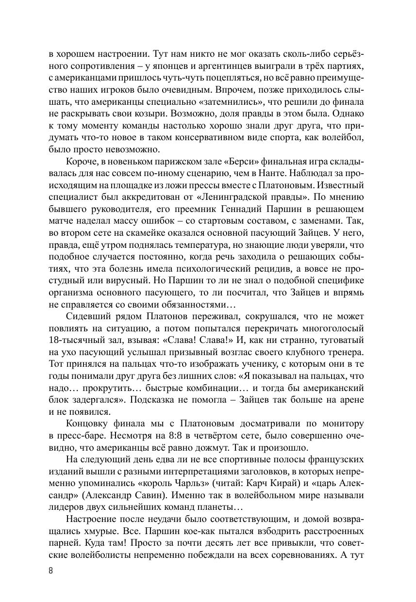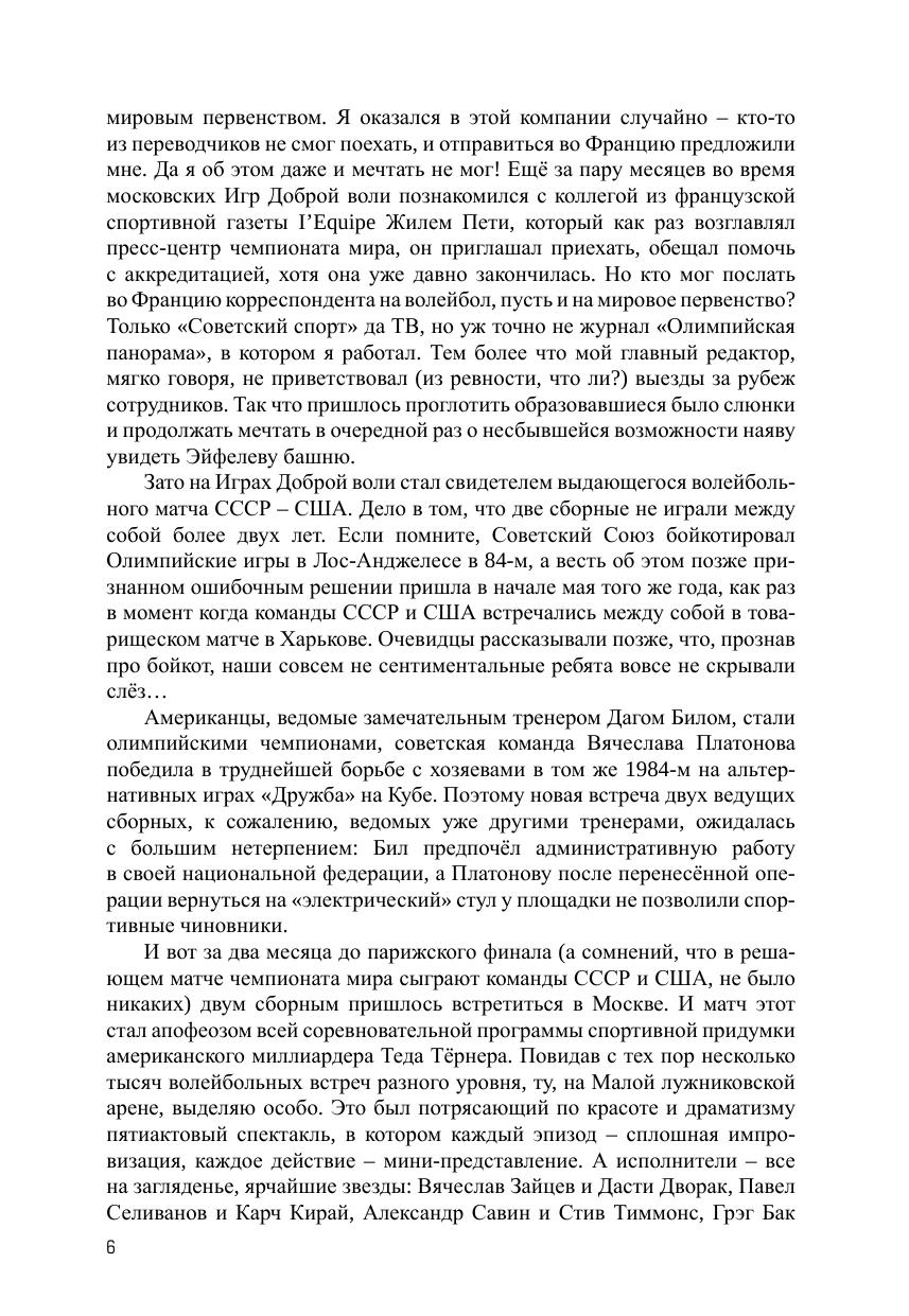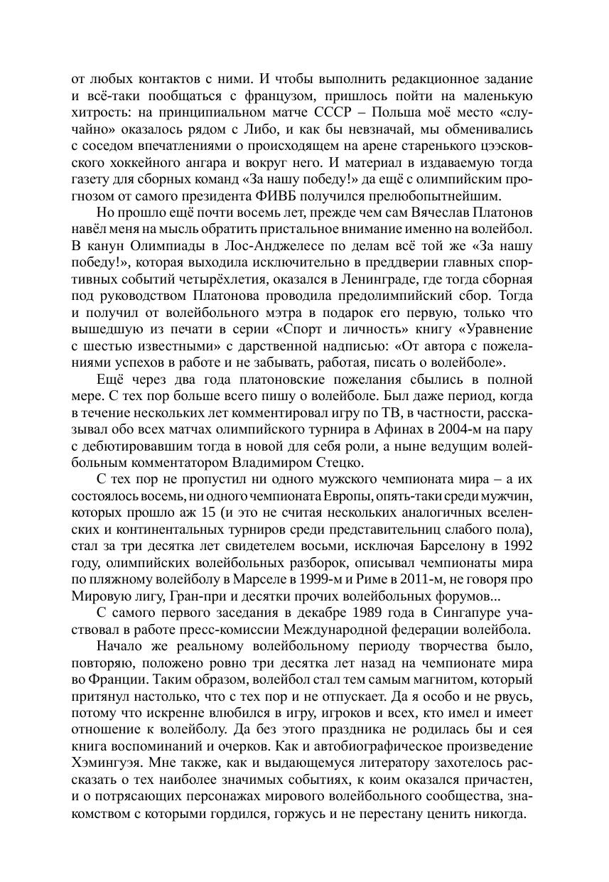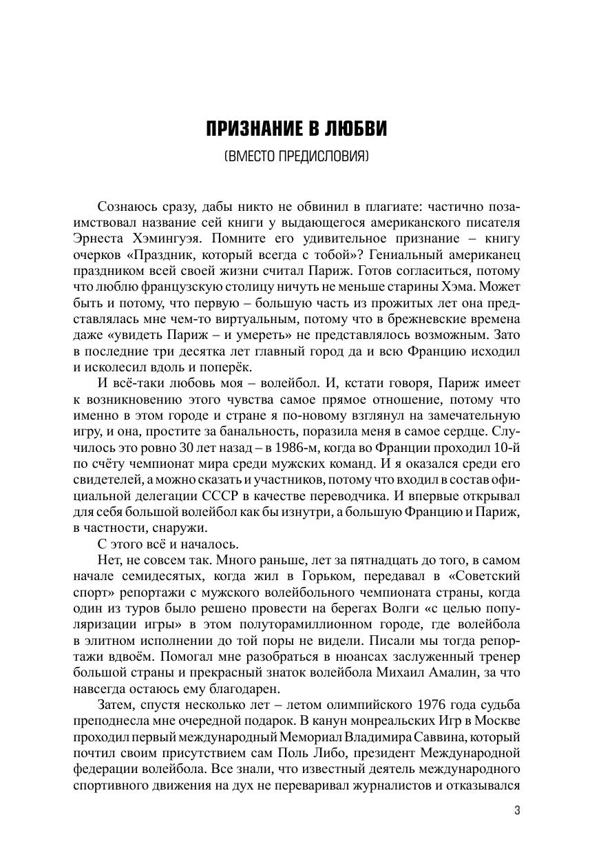 Волейбол, и это попытался доказать автор, словно магнит, притягивает к себе и уже не отпускает. Это книга воспоминаний о наиболее значимых событиях в мировом волейболе – чемпионатах мира, Европы и Олимпийских играх, которые происходили в последние тридцать лет, и очерков о выдающихся игроках и тренерах, российских и зарубежных, с которыми судьба сводила автора в течении этих десятилетий. «Париж никогда не кончается» – этими словами завершает свое автобиографическое повествование «Праздник, который всегда с тобой» великий Эрнест Хэмингуэй. Вот и волейбол в жизни автора, который частично позаимствовал у американского писателя название, продолжается. Потому что эта игра – праздник и для него, и для всех, о ком он рассказывает на этих страницах.