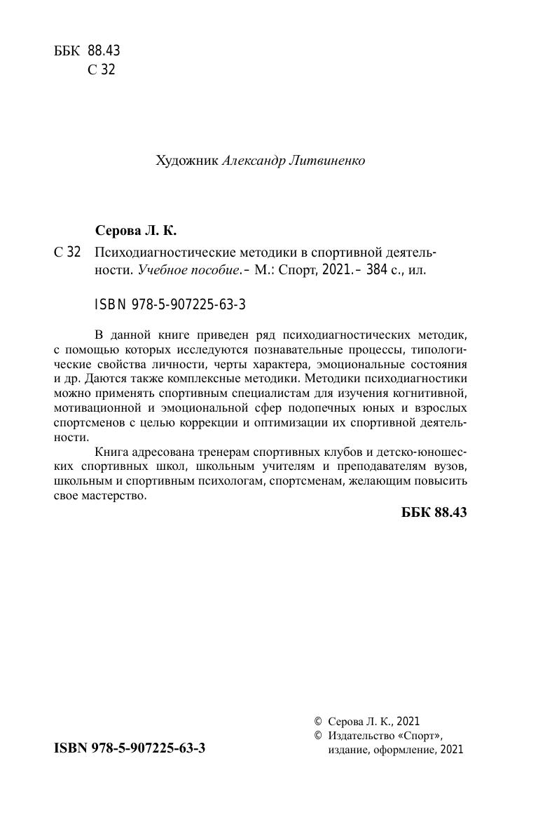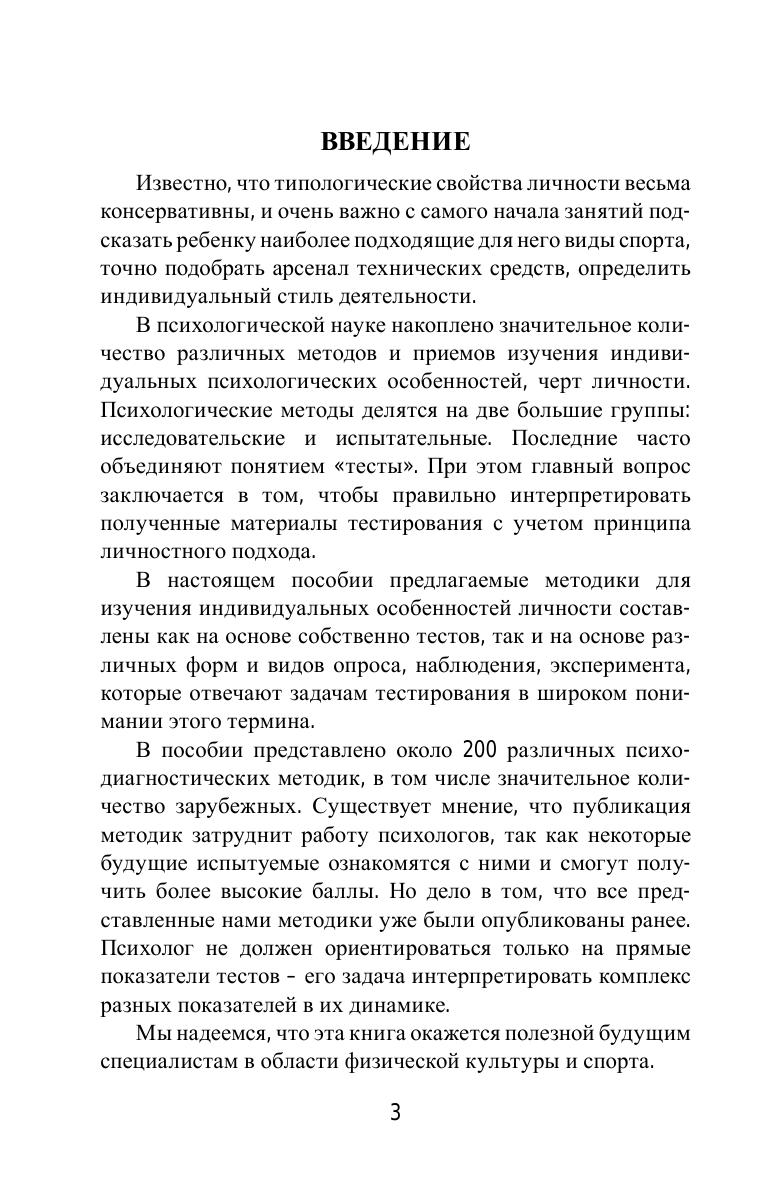 В данной книге приведен ряд психодиагностических методик, с помощью которых исследуются познавательные процессы, типологические свойства личности, черты характера, эмоциональные состояния и др. Даются также комплексные методики. Методики психодиагностики можно применять спортивным специалистам для изучения когнитивной, мотивационной и эмоциональной сфер подопечных юных и взрослых спортсменов с целью коррекции и оптимизации их спортивной деятельности.