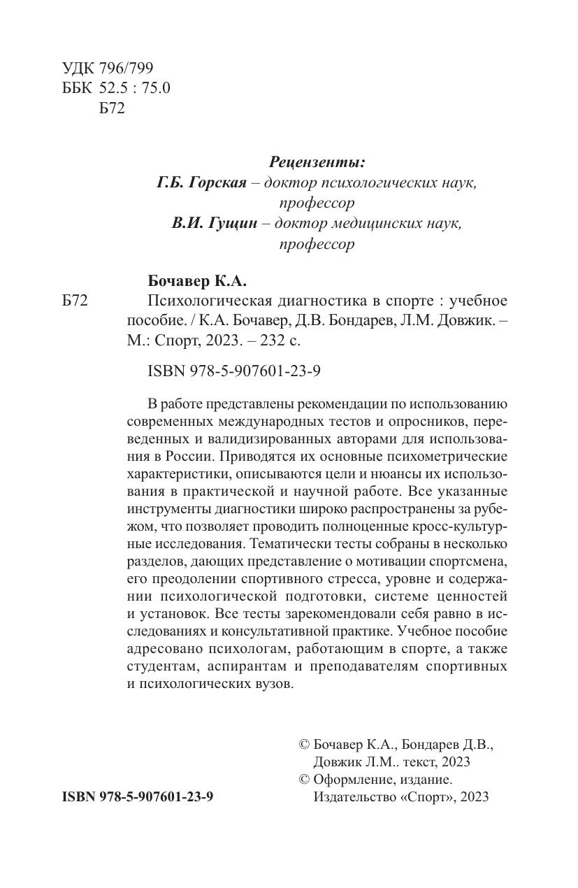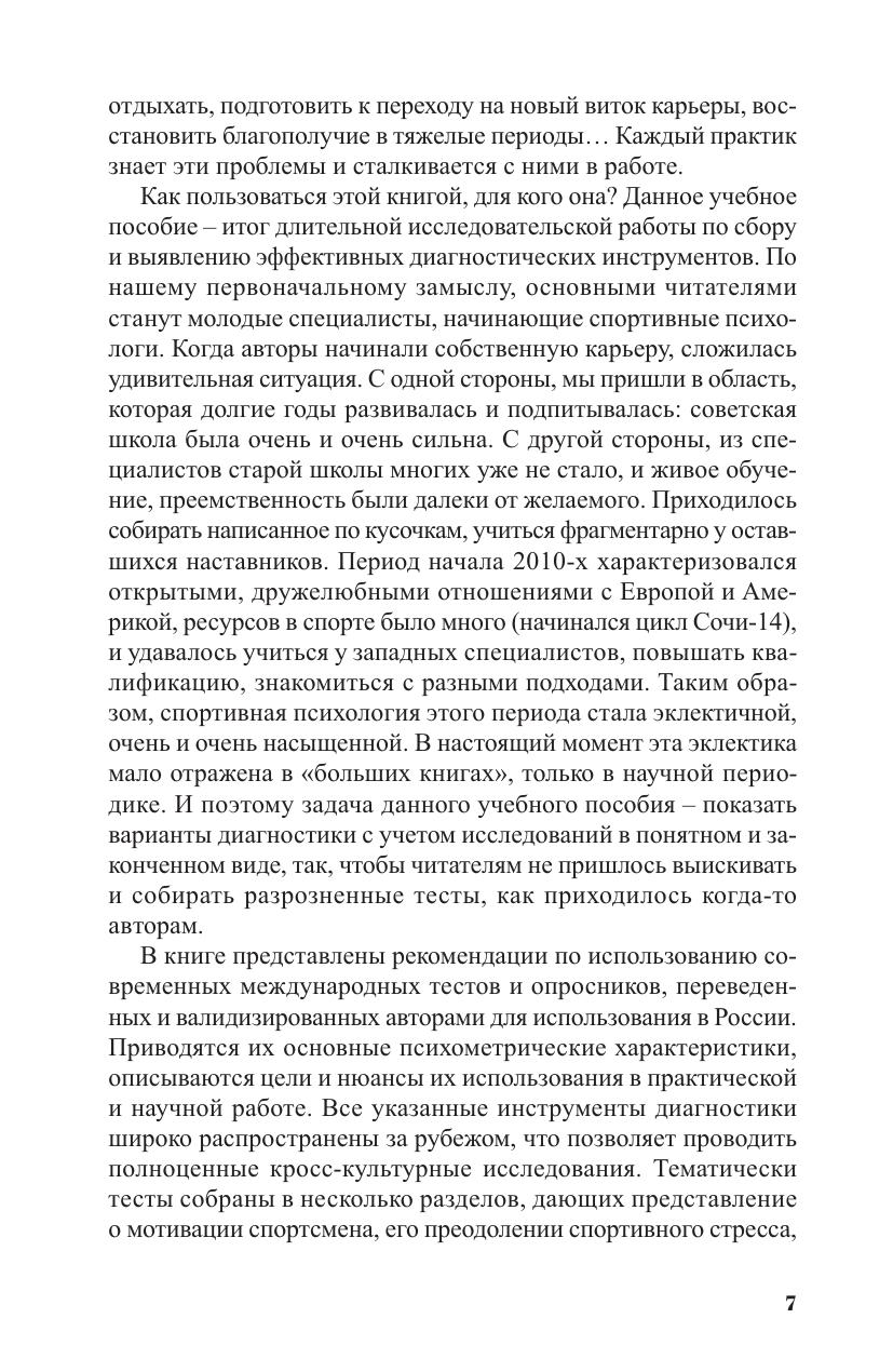 В работе представлены рекомендации по использованию современных международных тестов и опросников, переведенных и валидизированных авторами для использования в России. Приводятся их основные психометрические характеристики, описываются цели и нюансы их использования в практической и научной работе. Все указанные инструменты диагностики широко распространены за рубежом, что позволяет проводить полноценные кросс-культурные исследования. Тематически тесты собраны в несколько разделов, дающих представление о мотивации спортсмена, его преодолении спортивного стресса, уровне и содержании психологической подготовки, системе ценностей и установок. Все тесты зарекомендовали себя равно в исследованиях и консультативной практике. Учебное пособие адресовано психологам, работающим в спорте, а также студентам, аспирантам и преподавателям спортивных и психологических вузов.