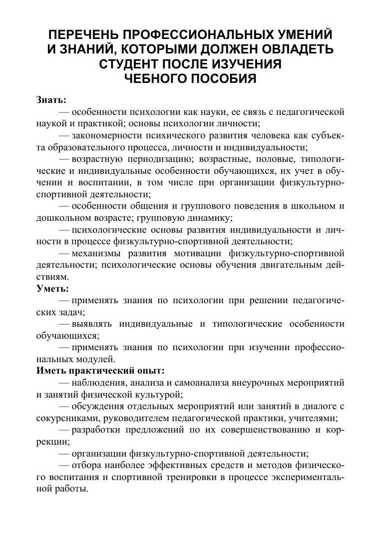 Пособие включает в себя информационно-методические материалы, психодиагностические методики и практические задания. Работа с пособием поможет студентам сформировать представление о психологических особенностях деятельности и личности спортсменов различных специализаций, развить умение анализировать и интерпретировать ситуации, как с позиции самого спортсмена, так и с позиции тренера, спортивного менеджера, проектировать собственную профессиональную деятельность, ставить и решать задачи профессионального развития. Соответствует современным требованиям Федерального государственного образовательного стандарта среднего профессионального образования и профессиональным квалификационным требованиям.