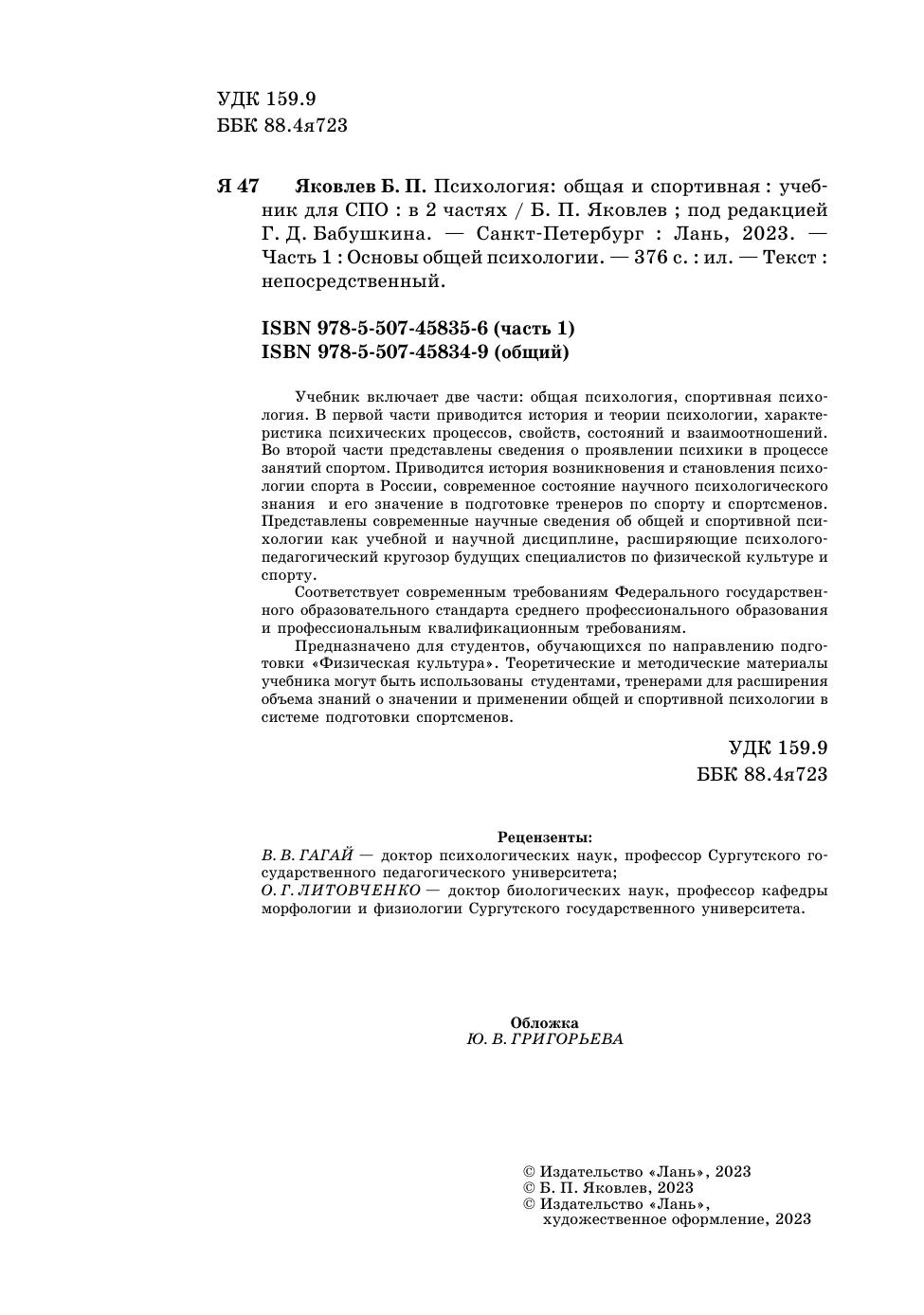 Учебник включает две части: общая психология, спортивная психология. В первой части приводится история и теории психологии, характеристика психических процессов, свойств, состояний и взаимоотношений. Во второй части представлены сведения о проявлении психики в процессе занятий спортом. Приводится история возникновения и становления психологии спорта в России, современное состояние научного психологического знания и его значение в подготовке тренеров по спорту и спортсменов. Представлены современные научные сведения об общей и спортивной психологии как учебной и научной дисциплине, расширяющие психолого-педагогический кругозор будущих специалистов по физической культуре и спорту. Соответствует современным требованиям Федерального государственного образовательного стандарта среднего профессионального образования и профессиональным квалификационным требованиям. Предназначено для студентов, обучающихся по направлению подготовки «Физическая культура». Теоретические и методические материалы учебника могут быть использованы студентами, тренерами для расширения объема знаний о значении и применении общей и спортивной психологии в системе подготовки спортсменов.