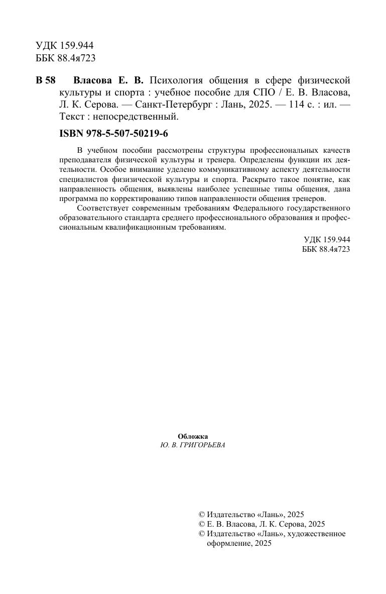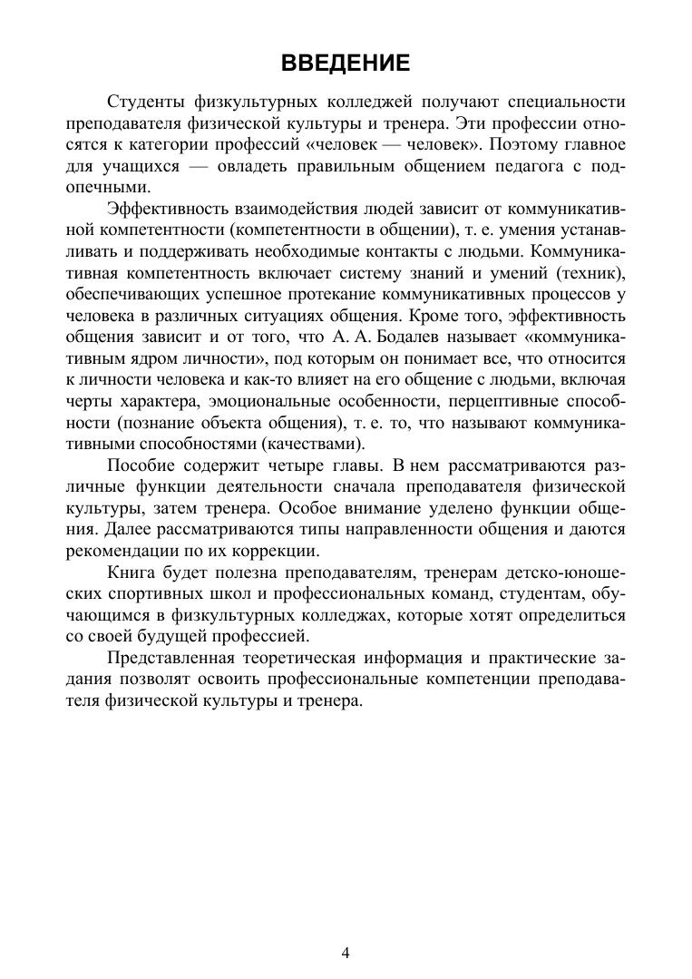 В учебном пособии рассмотрены структуры профессиональных качеств преподавателя физической культуры и тренера. Определены функции их деятельности. Особое внимание уделено коммуникативному аспекту деятельности специалистов физизической культуры и спорта. Раскрыто такое понятие, как направленность общения, выявлены наиболее успешные типы общения, дана программа по корректированию типов направленности общения тренеров. Соответствует современным требованиям Федерального государственного образовательного стандарта среднего профессионального образования и профессиональным квалификационным требованиям.