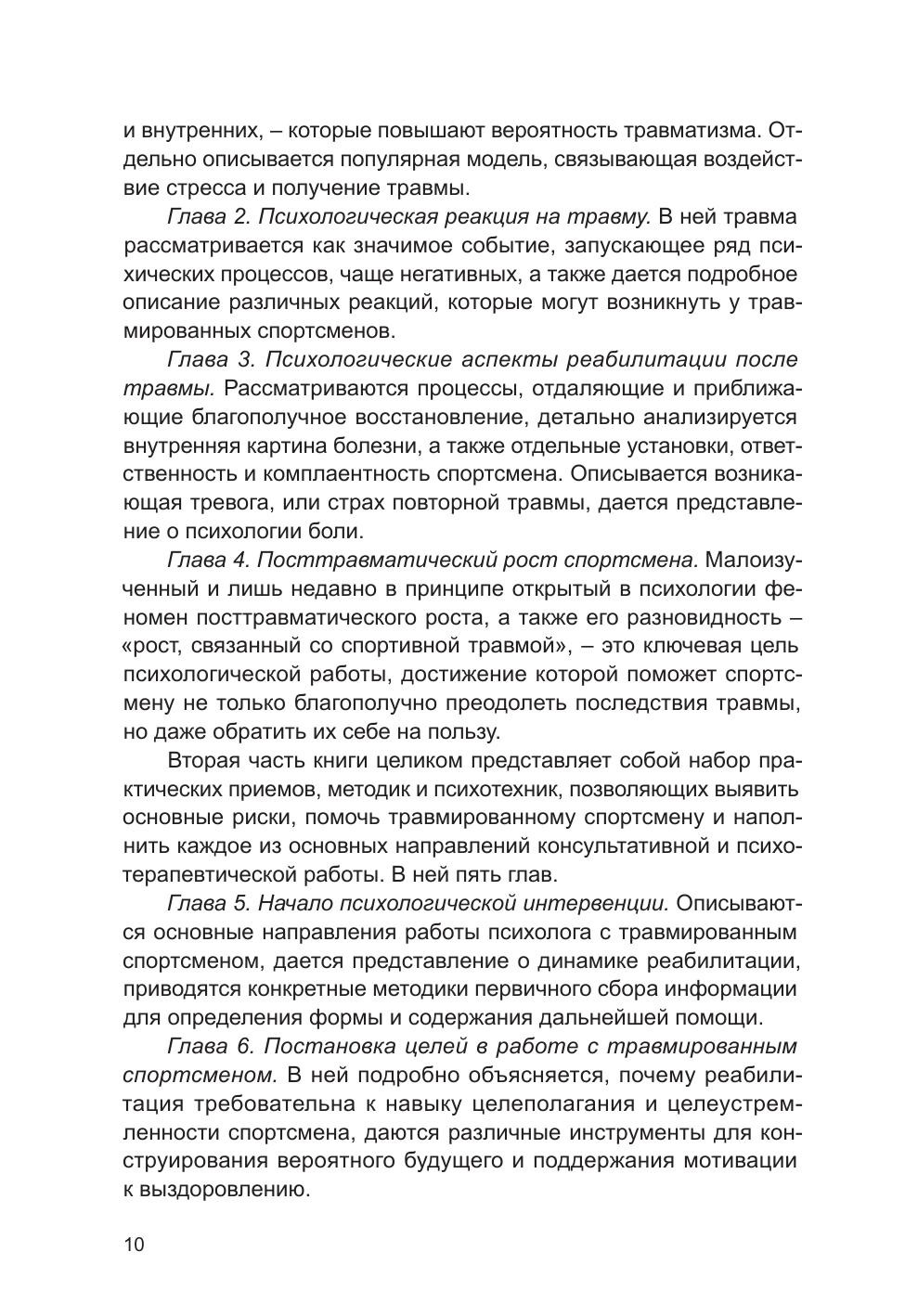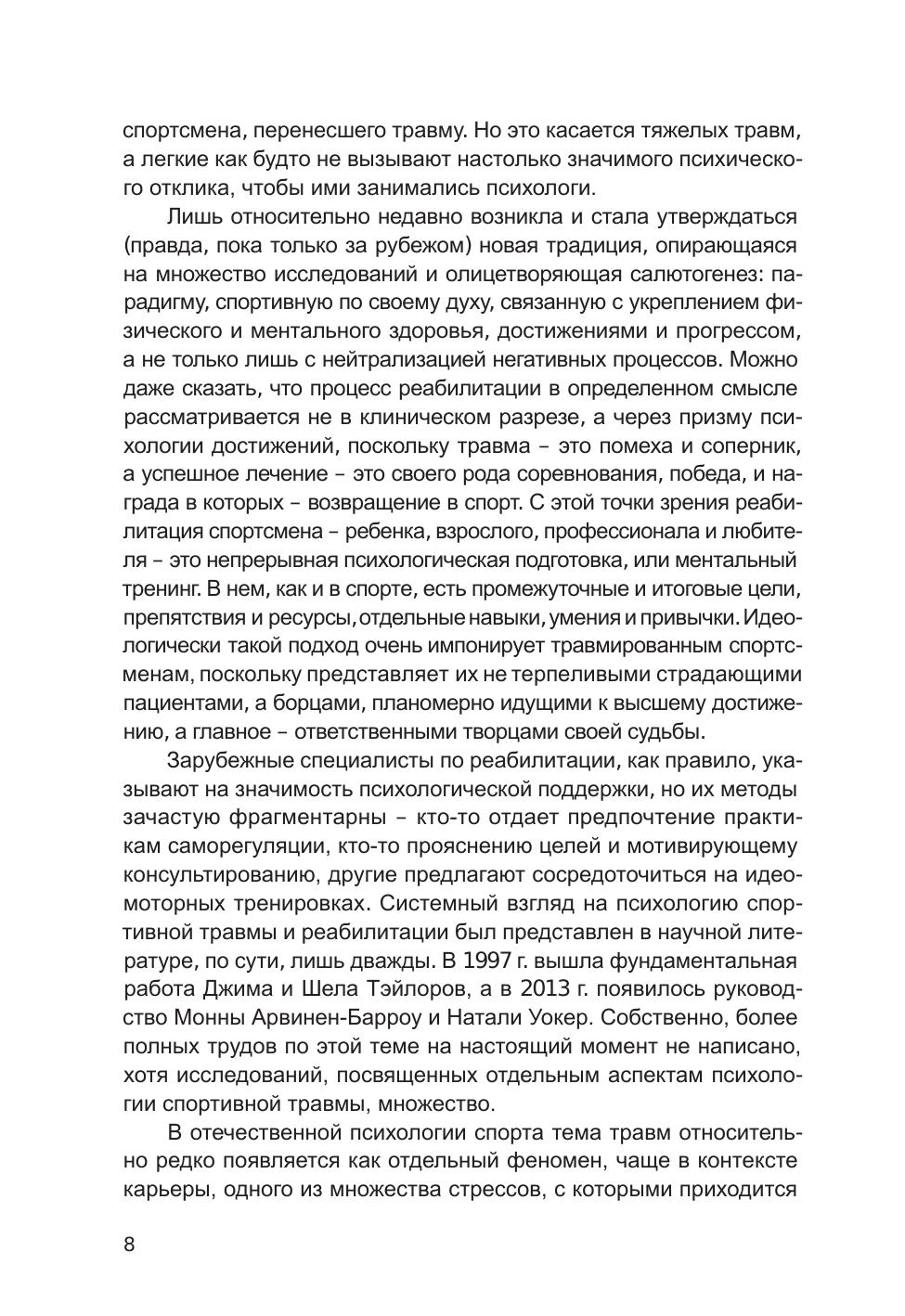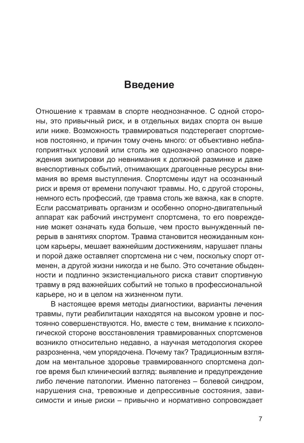 «Психология спортивной травмы и реабилитации» – это первое в нашей стране практическое руководство, разработанное для комплексной психологической помощи травмированным спортсменам. Прерывая спортивную карьеру – иногда надолго, а порой навсегда, – травма опорно-двигательного аппарата влечет за собой деструктивные психические процессы и изменения. В книге дается подробный анализ научных исследований, посвященных психологии спортивной травмы и реабилитации, и выстроенный в систему план помощи и самопомощи. Опираясь на науку и практику, читатели узнают, как минимизировать ущерб, причиненный травмой, и одержать над ней победу в процессе реабилитации. Для психологов, врачей-реабилитологов, тренеров, спортсменов и их близких.