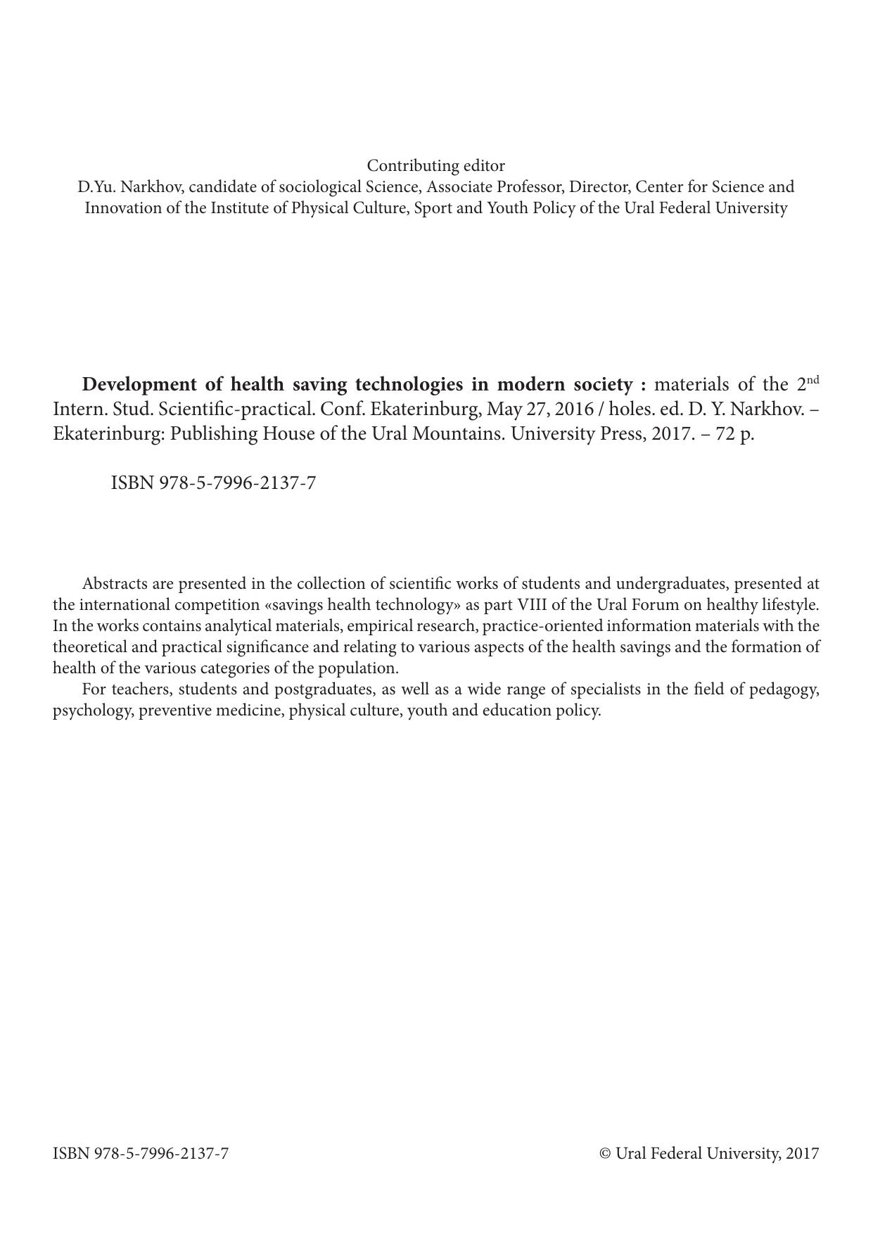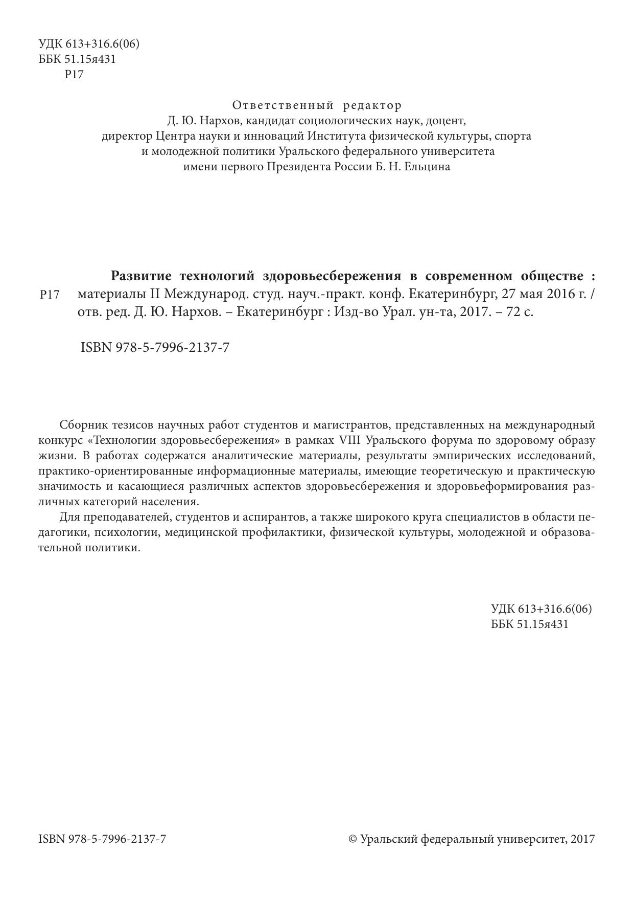 Сборник тезисов научных работ студентов и магистрантов, представленных на международный конкурс «Технологии здоровьесбережения» в рамках VIII Уральского форума по здоровому образу жизни. В работах содержатся аналитические материалы, результаты эмпирических исследований, практико-ориентированные информационные материалы, имеющие теоретическую и практическую значимость и касающиеся различных аспектов здоровьесбережения и здоровьеформирования различных категорий населения.