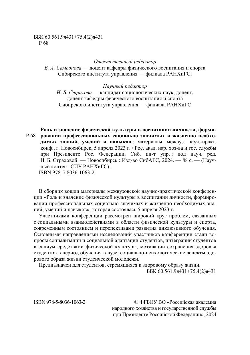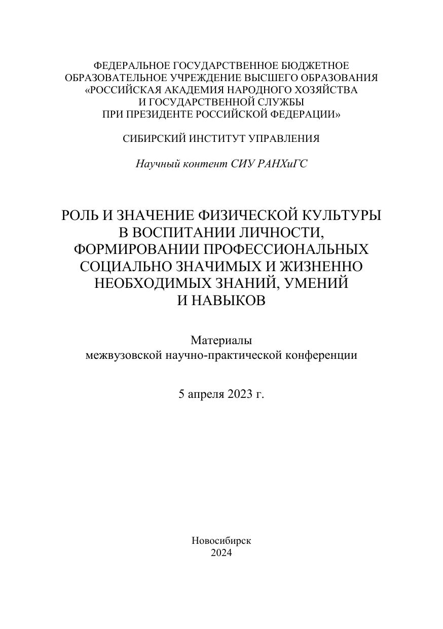 Роль и значение физической культуры в воспитании личности, формировании профессиональных социально значимых и жизненно необходимых знаний, умений и навыков: материалы межвуз. науч.-практ. конф., г. Новосибирск, 5 апреля 2023 г.