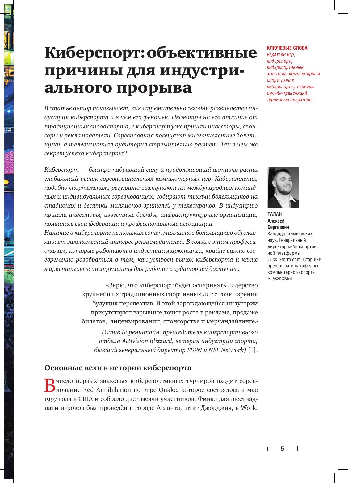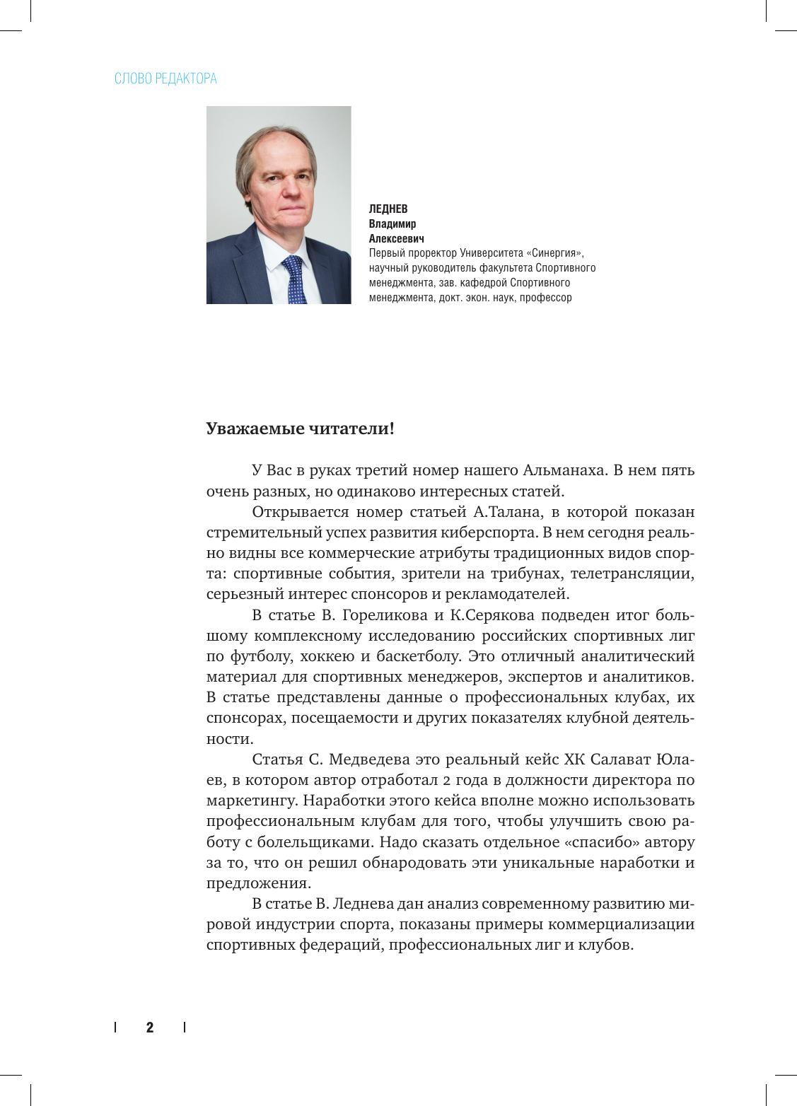 У вас в руках третий номер Альманаха. В нем пять очень разных, но одинаково интересных статей. Открывается номер статьей А.Талана, в которой показан стремительный успех развития киберспорта. В нем сегодня реально видны все коммерческие атрибуты традиционных видов спорта: спортивные события, зрители на трибунах, телетрансляции, серьезный интерес спонсоров и рекламодателей. В статье В. Гореликов а и К. Серякова подведен итог большому комплексному исследованию российских спортивных лиг по футболу, хоккею и баскетболу. Это отличный аналитический материал для спортивных менеджеров, экспертов и аналитиков. В статье представлены данные о профессиональных клубах, их спонсорах, посещаемости и других показателях клубной деятельности. Статья С.Медведева это реальный кейс ХК Салават Юлаев, в котором автор отработал 2 года в должности директора по маркетингу. Наработки этого кейса вполне можно использовать профессиональным клубам для того, чтобы улучшить свою работу с болельщиками. Надо сказать отдельное «спасибо» автору за то, что он решил обнародовать эти уникальные наработки и предложения. В статье В.Леднева дан анализ современному развитию мировой индустрии спорта, показаны примеры коммерциализации спортивных федераций, профессиональных лиг и клубов.