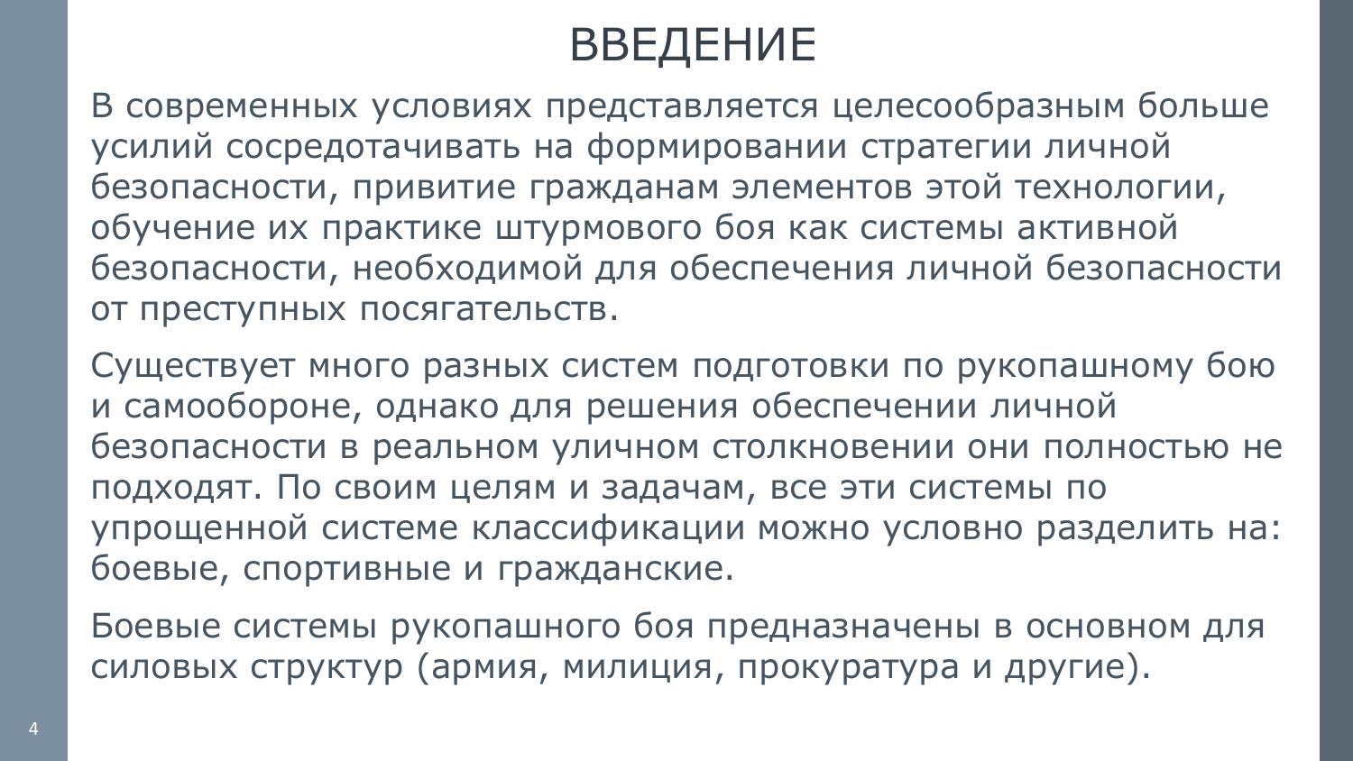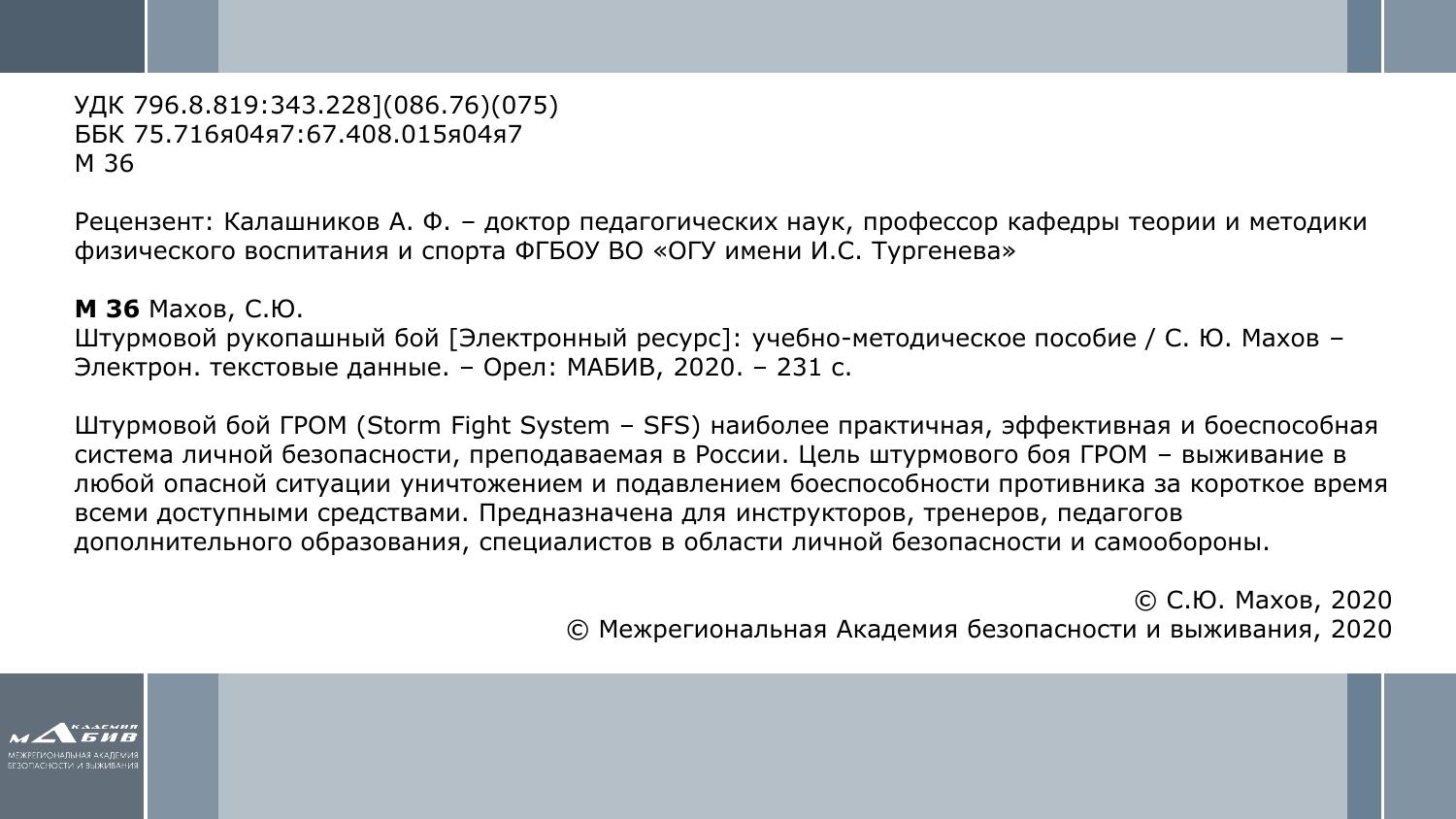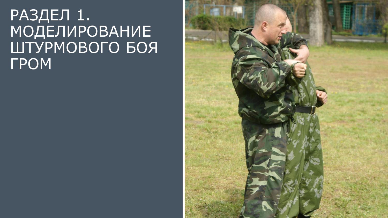 Штурмовой бой ГРОМ (Storm Fight System – SFS) наиболее практичная, эффективная и боеспособная система личной безопасности, преподаваемая в России. Цель штурмового боя ГРОМ – выживание в любой опасной ситуации уничтожением и подавлением боеспособности противника за короткое время всеми доступными средствами. Предназначена для инструкторов, тренеров, педагогов дополнительного образования, специалистов в области личной безопасности и самообороны.