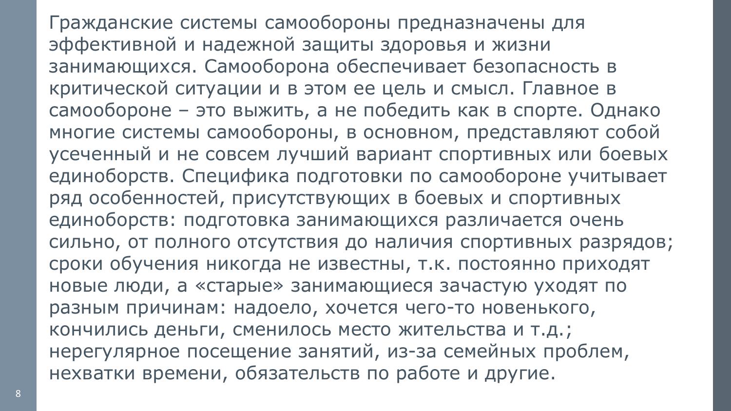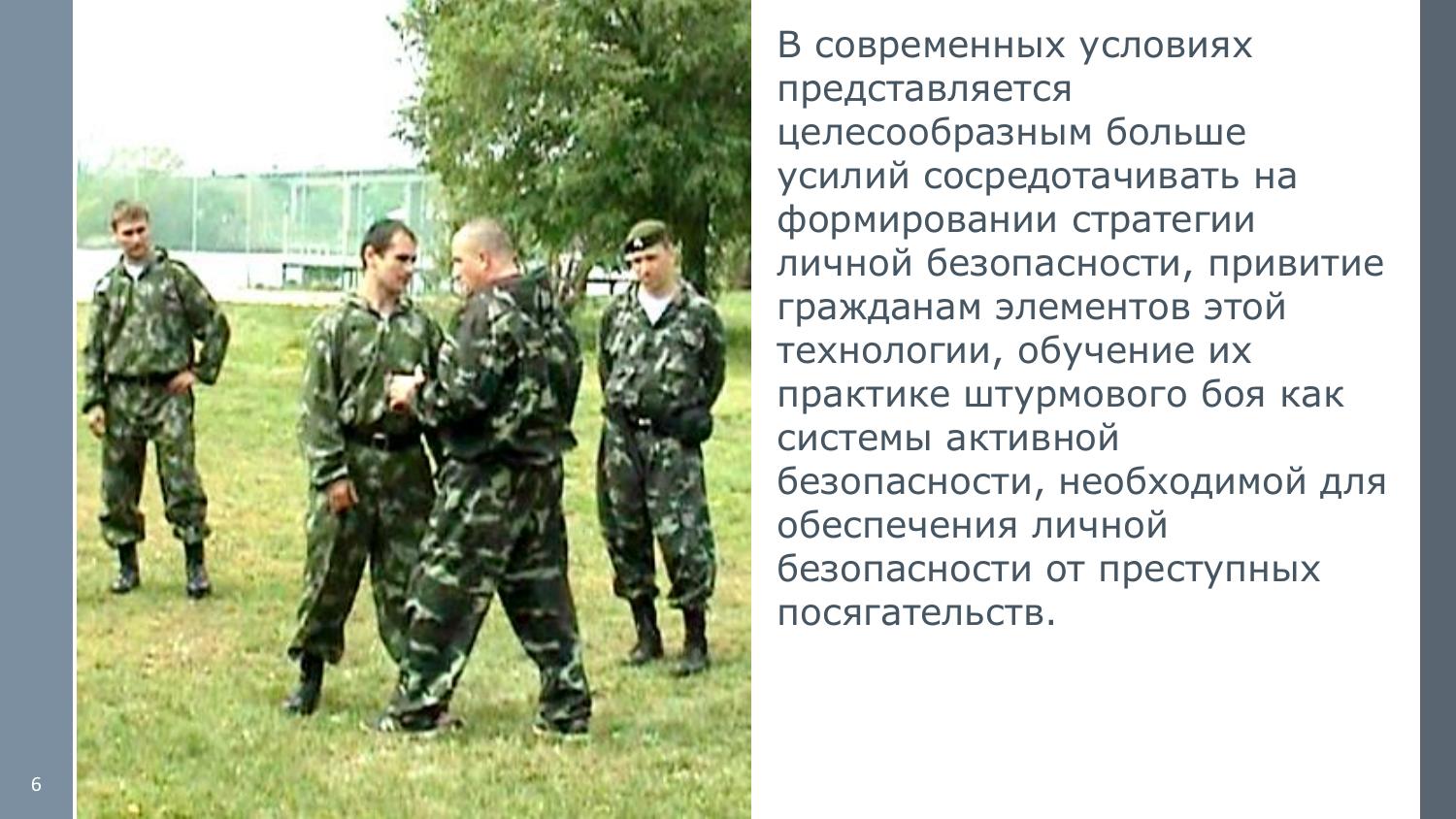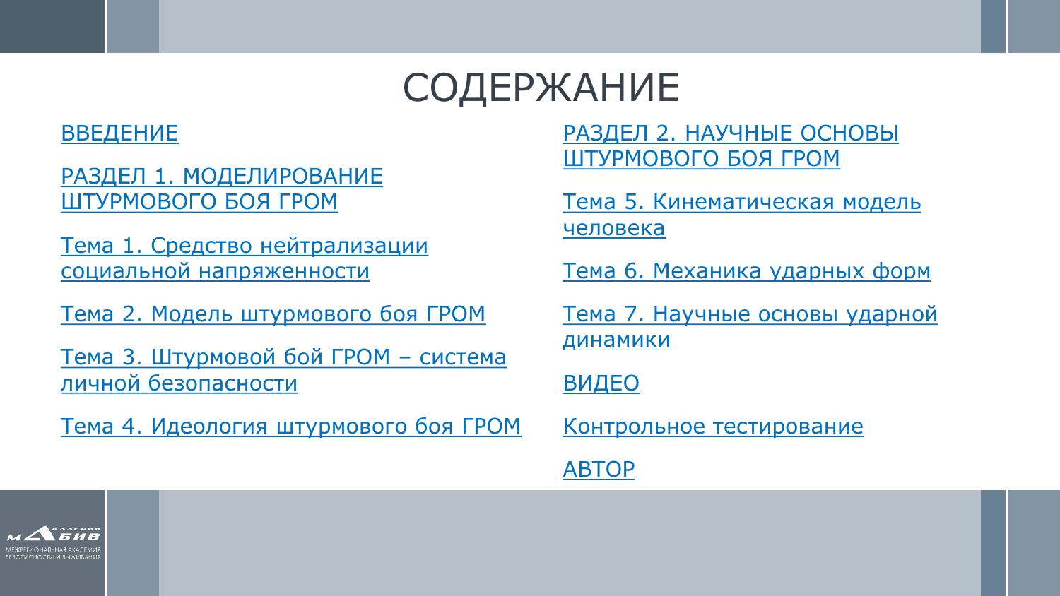 Штурмовой бой ГРОМ (Storm Fight System – SFS) наиболее практичная, эффективная и боеспособная система личной безопасности, преподаваемая в России. Цель штурмового боя ГРОМ – выживание в любой опасной ситуации уничтожением и подавлением боеспособности противника за короткое время всеми доступными средствами. Предназначена для инструкторов, тренеров, педагогов дополнительного образования, специалистов в области личной безопасности и самообороны.