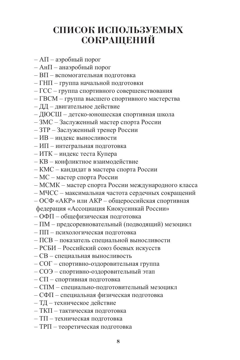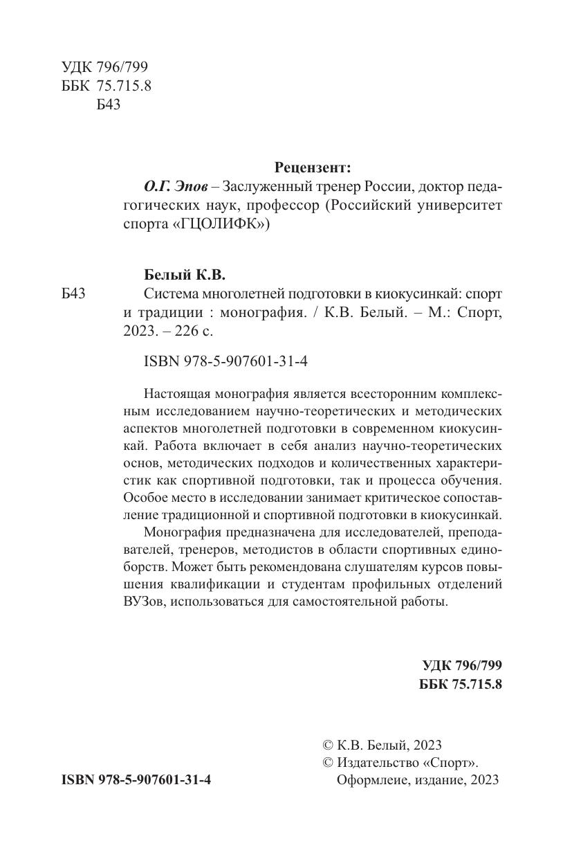 Настоящая монография является всесторонним комплексным исследованием научно-теоретических и методических аспектов многолетней подготовки в современном киокусинкай. Работа включает в себя анализ научно-теоретических основ, методических подходов и количественных характеристик как спортивной подготовки, так и процесса обучения. Особое место в исследовании занимает критическое сопоставление традиционной и спортивной подготовки в киокусинкай. Монография предназначена для исследователей, преподавателей, тренеров, методистов в области спортивных единоборств. Может быть рекомендована слушателям курсов повышения квалификации и студентам профильных отделений ВУЗов, использоваться для самостоятельной работы.