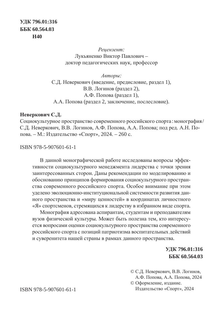 В данной монографической работе исследованы вопросы эффективности социокультурного менеджмента лидерства с точки зрения заинтересованных сторон. Даны рекомендации по моделированию и обоснованию принципов формирования социокультурного пространства современного российского спорта. Особое внимание при этом уделено эволюционно-институциональной системности развития данного пространства и «миру ценностей» в координатах личностного «Я» спортсменов, стремящихся к лидерству в избранном виде спорта.