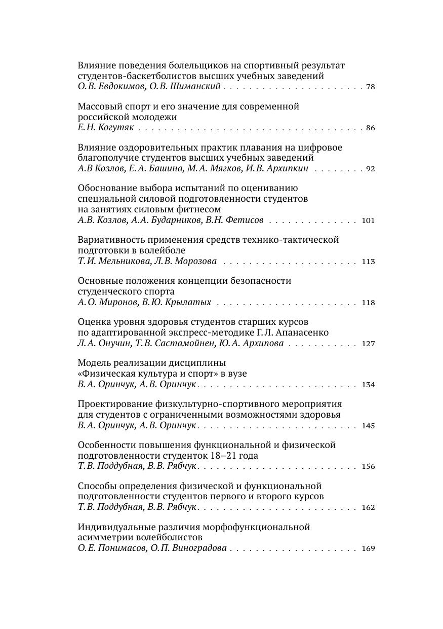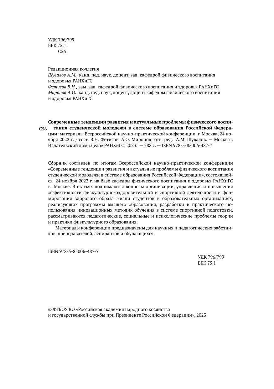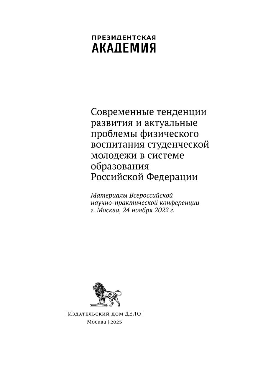 Сборник составлен по итогам Всероссийской научно-практической конференции «Современные тенденции развития и актуальные проблемы физического воспитания студенческой молодежи в системе образования Российской Федерации», состоявшейся 24 ноября 2022 г. на базе кафедры физического воспитания и здоровья РАНХиГС в Москве. В статьях поднимаются вопросы организации, управления и повышения эффективности физкультурно-оздоровительной и спортивной деятельности и формирования здорового образа жизни студентов в образовательных организациях, реализующих программы высшего образования, разработки и практического использования инновационных методик обучения в системе спортивной подготовки, рассматриваются педагогические, социальные и психологические проблемы теории и практики физкультурного образования. Материалы конференции предназначены для научных и педагогических работников, преподавателей, аспирантов и обучающихся.